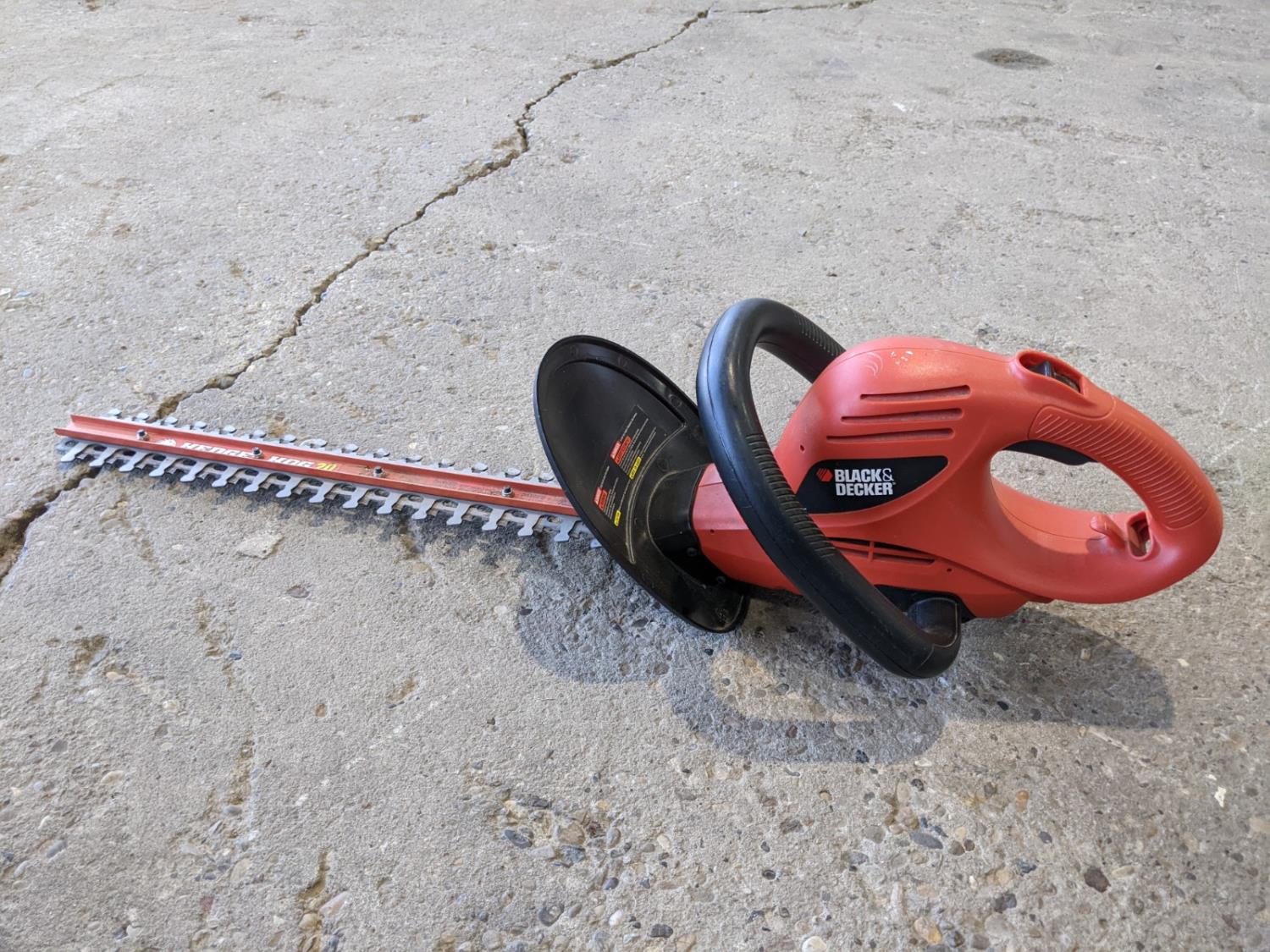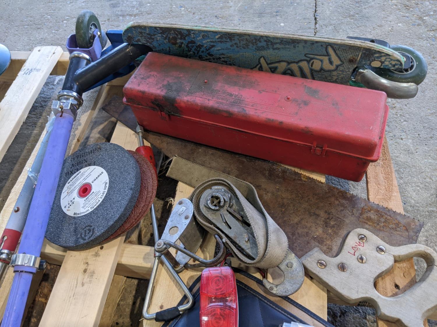 electric hedge trimmer, assorted hex bolts, road flare, grinding wheel, Coleman lantern, handsaw, winter front