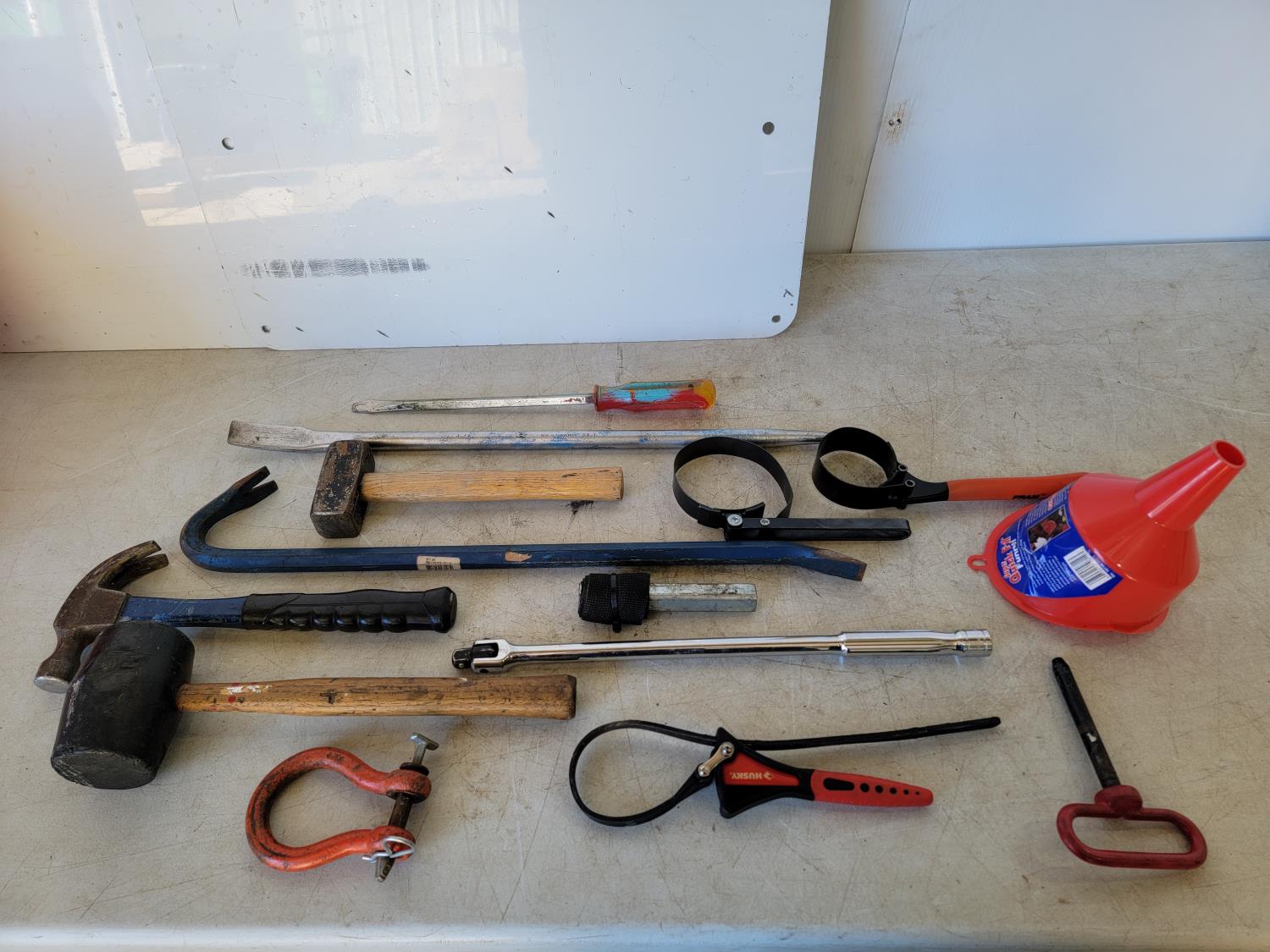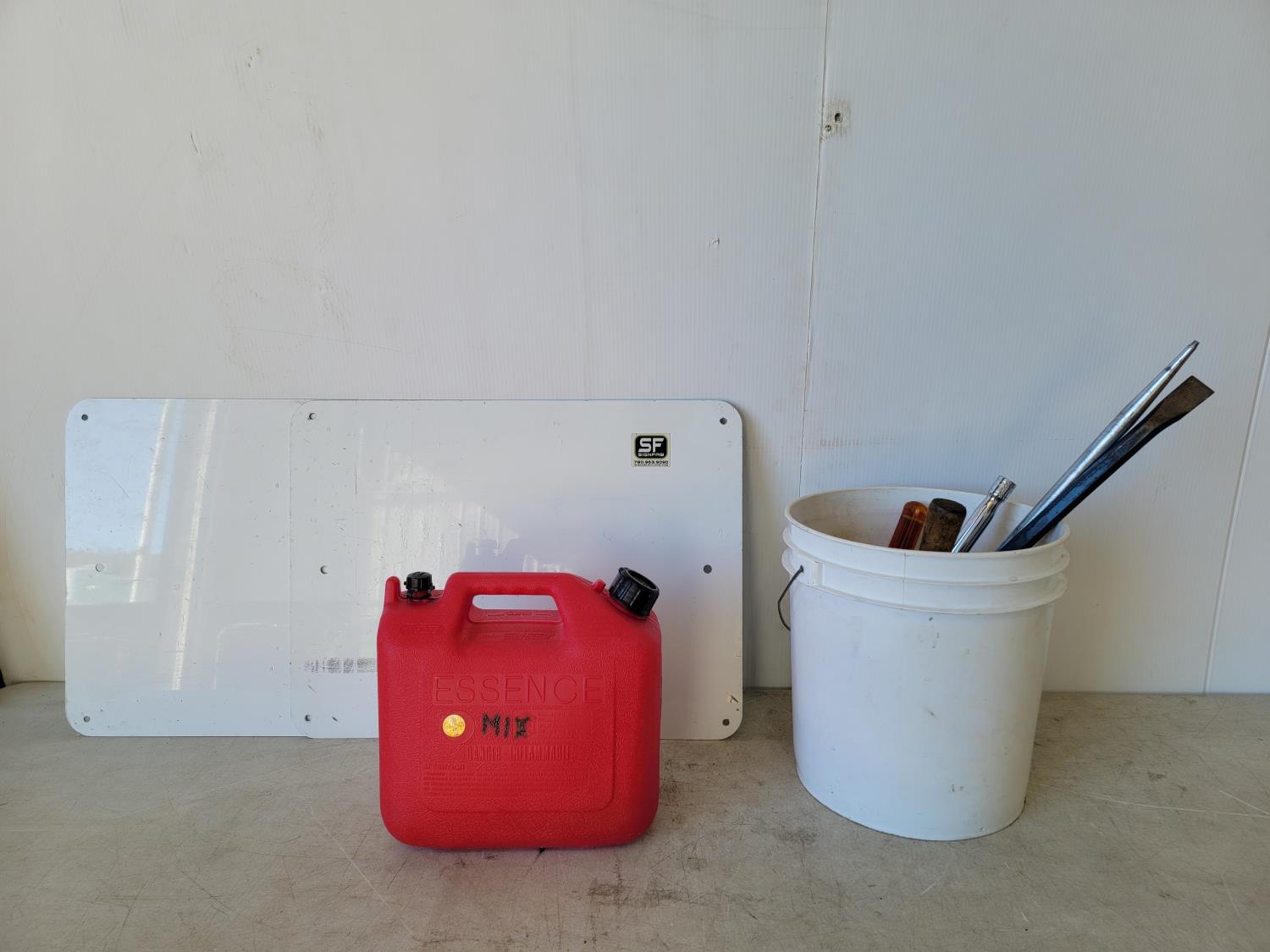 Funnel, filter wrenches, rubber mallet, hammers, pry bars, (2) blank signage boards, 2 gallon jerry can