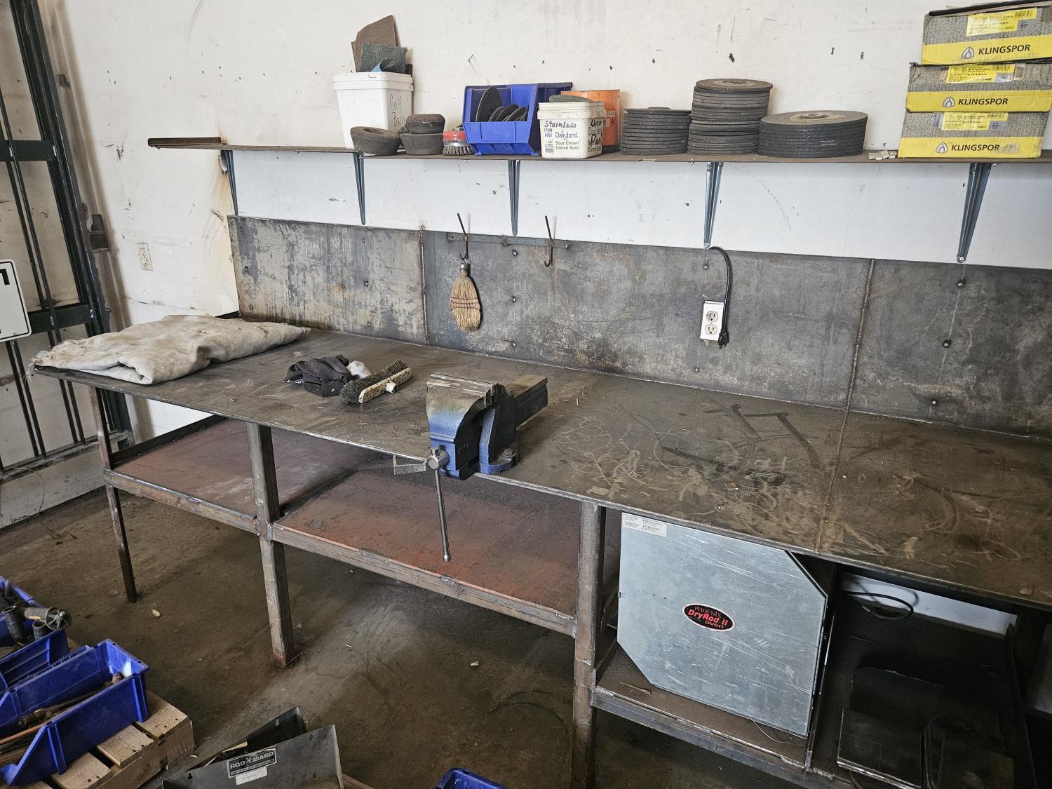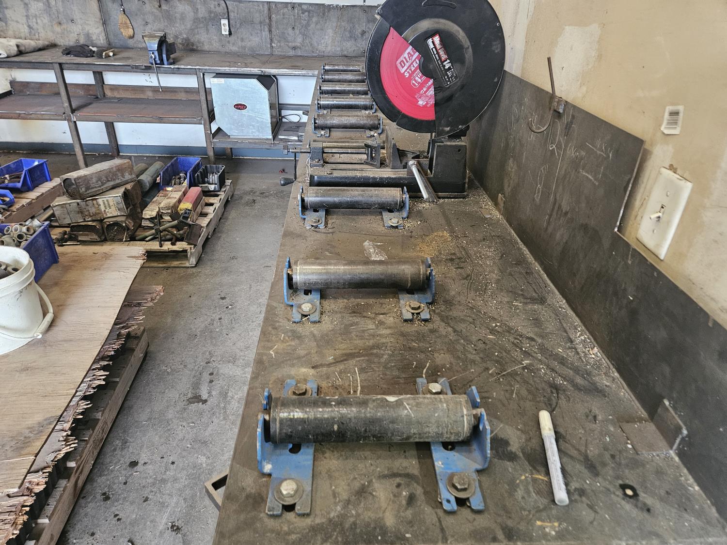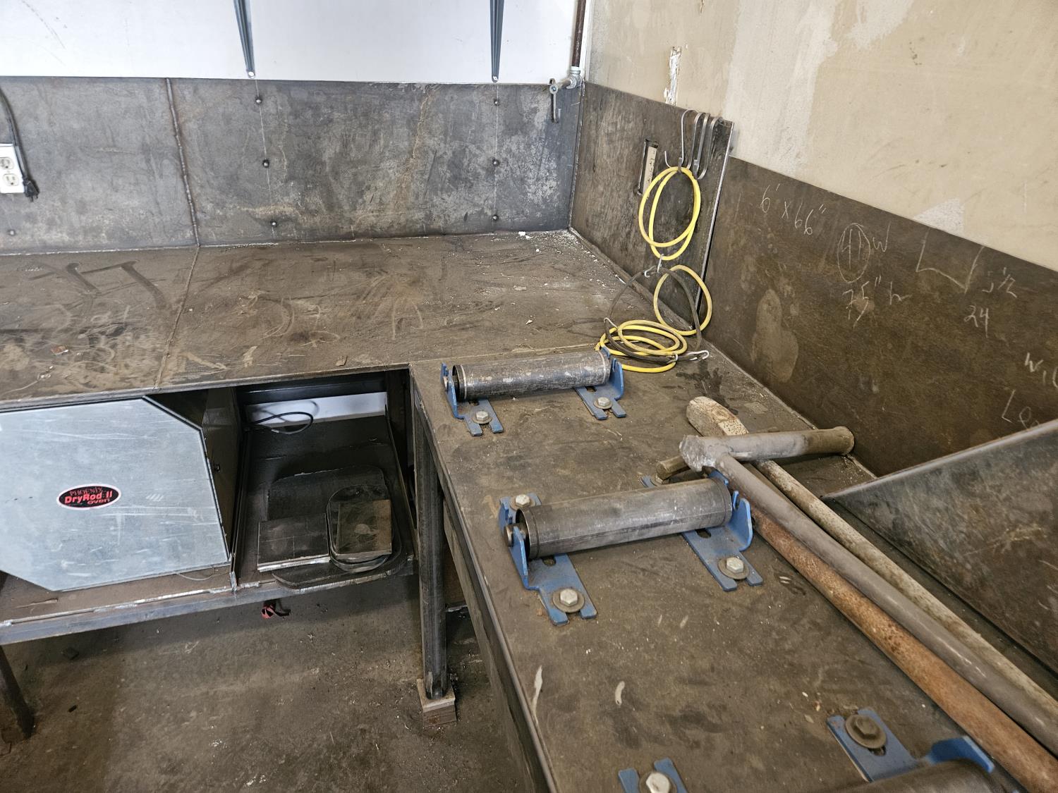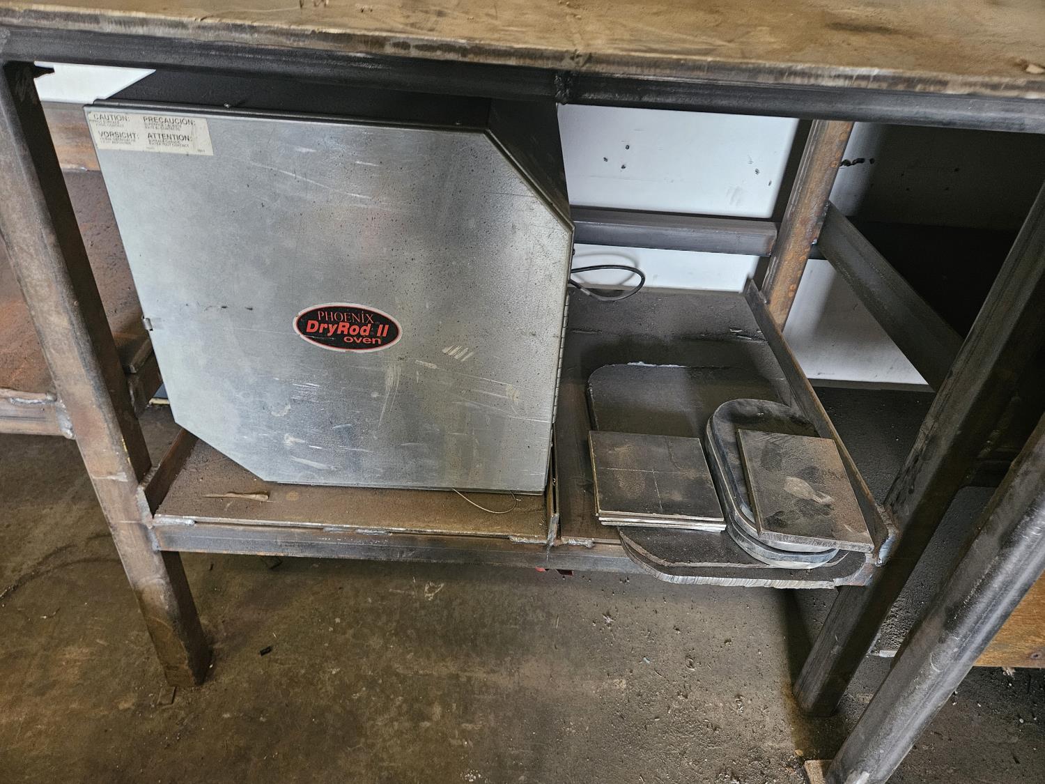 2 piece steel welding table set up, (1) 12 ft L x 35 inch T x 24 inch D, (1) 130 inch L x 35 inch T x 24 inch D, 6 inch vice, Metal Devil 14 inch chop saw, Phoenix Dry Rod ll oven, Klingspor grinding discs, wire wheels, 11 inch rollers