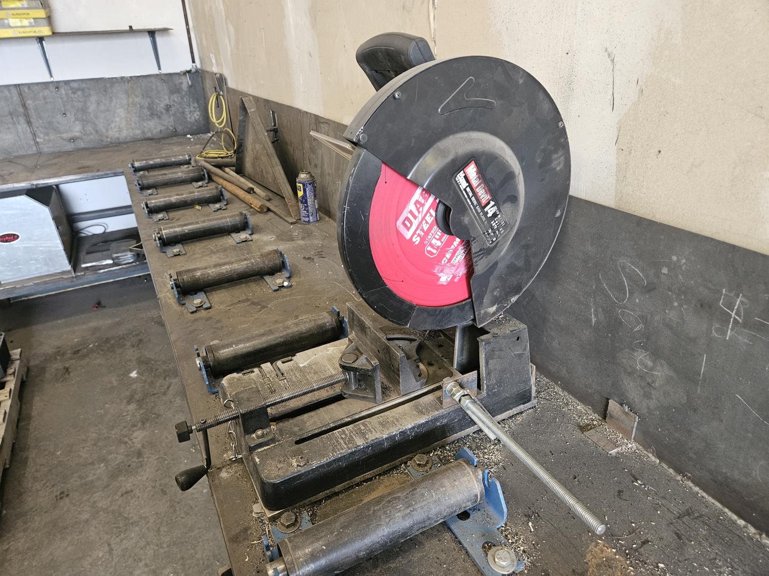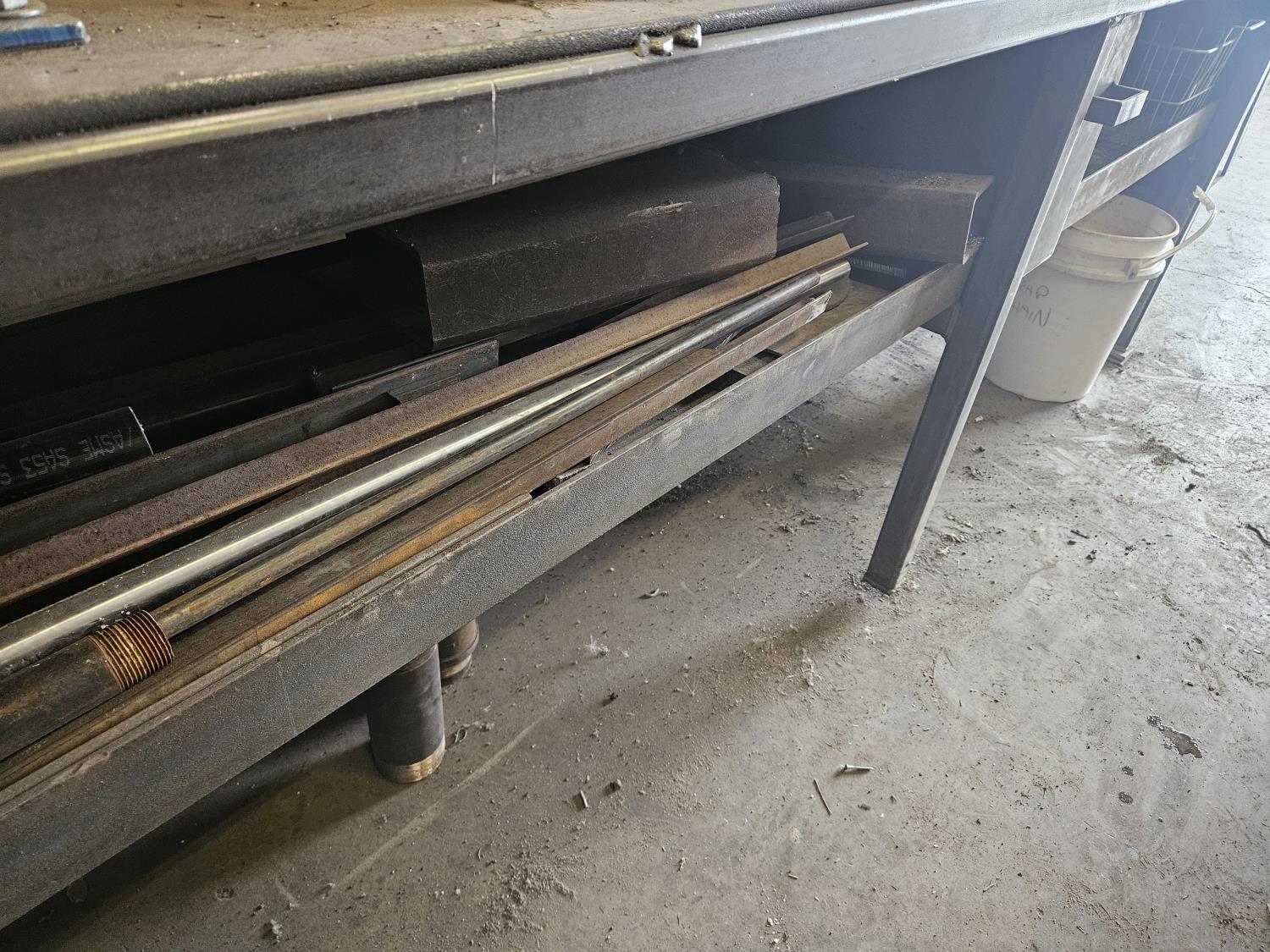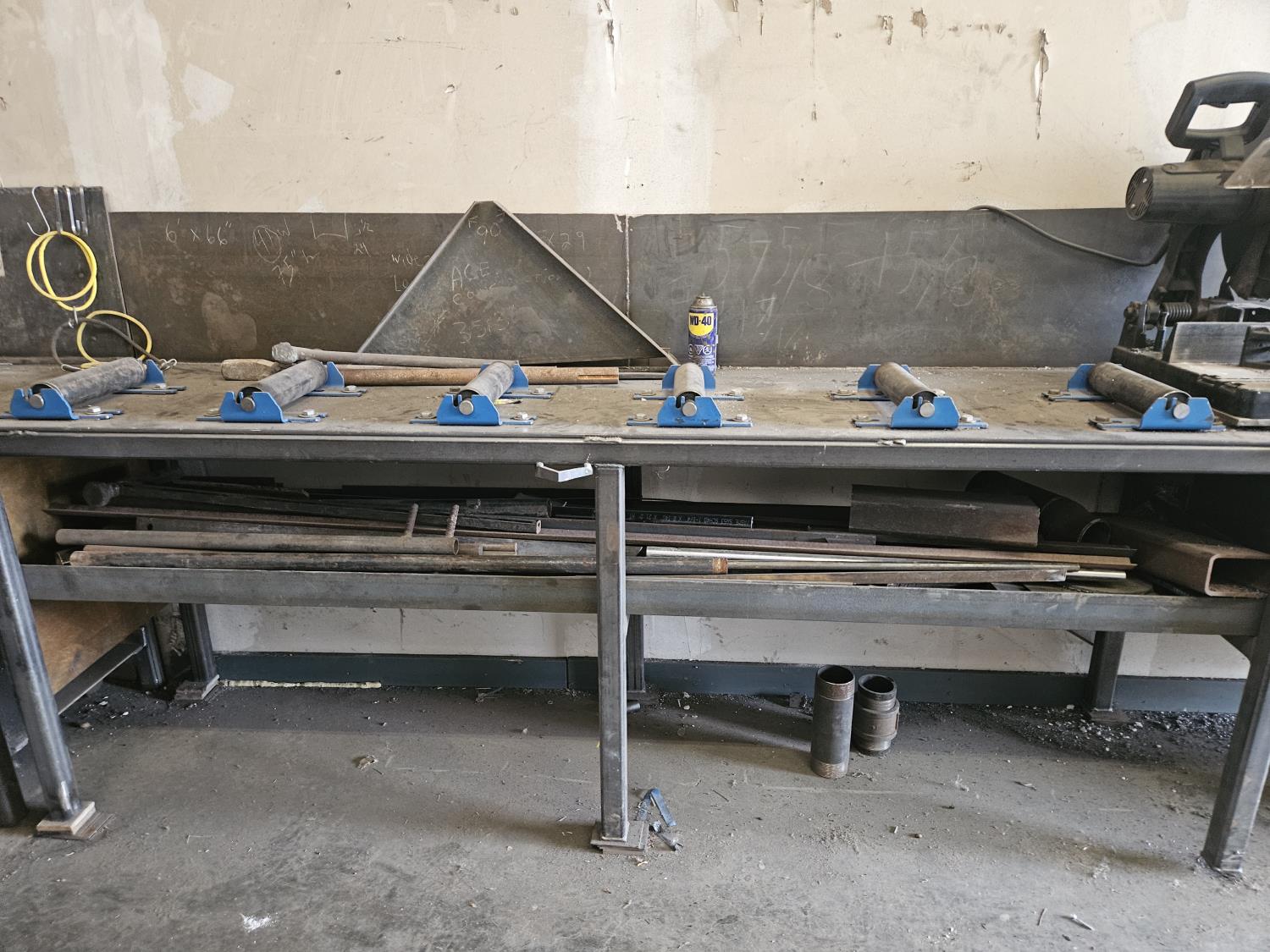 2 piece steel welding table set up, (1) 12 ft L x 35 inch T x 24 inch D, (1) 130 inch L x 35 inch T x 24 inch D, 6 inch vice, Metal Devil 14 inch chop saw, Phoenix Dry Rod ll oven, Klingspor grinding discs, wire wheels, 11 inch rollers