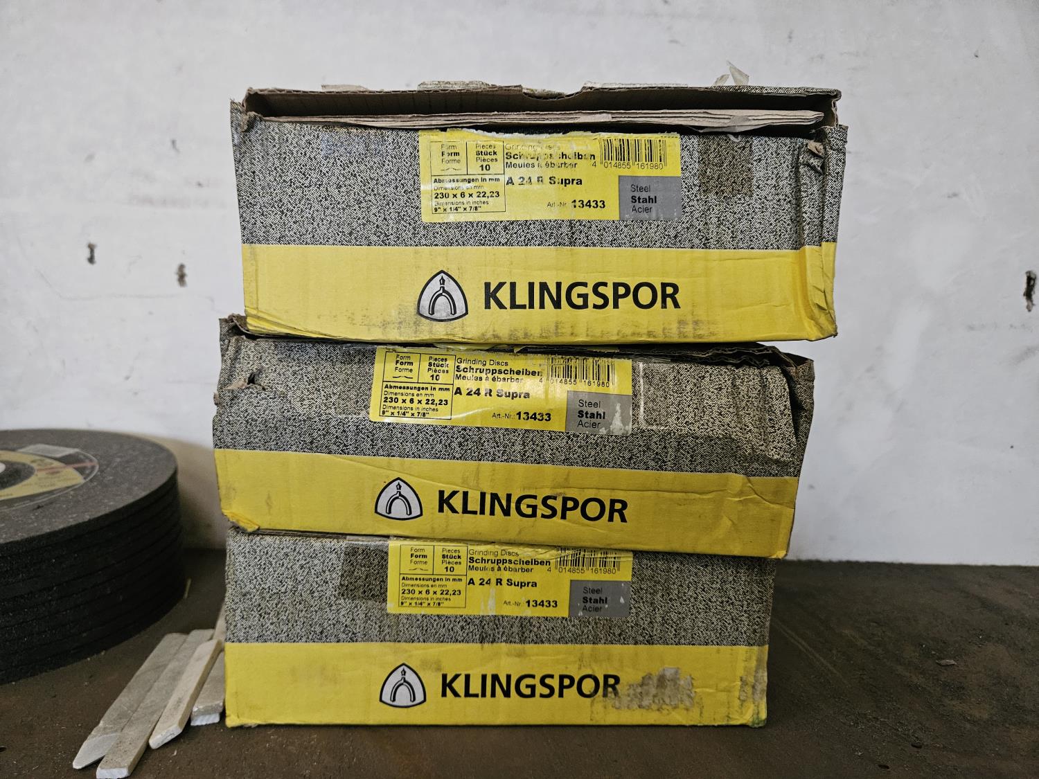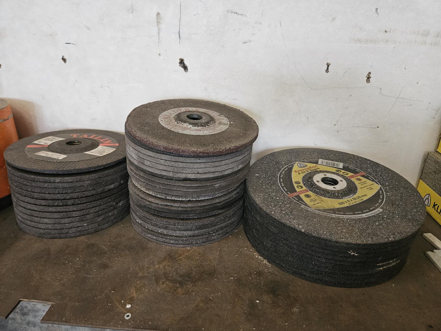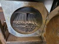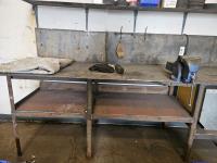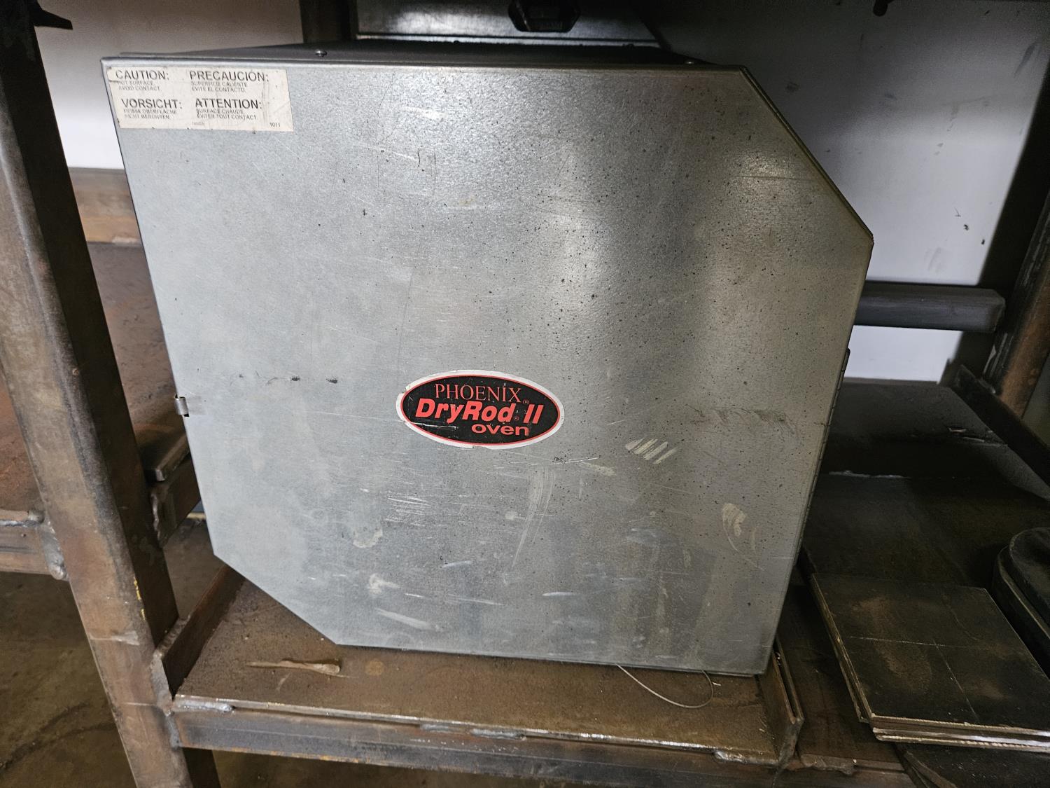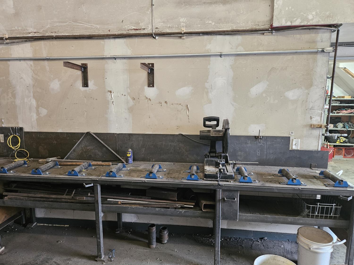 2 piece steel welding table set up, (1) 12 ft L x 35 inch T x 24 inch D, (1) 130 inch L x 35 inch T x 24 inch D, 6 inch vice, Metal Devil 14 inch chop saw, Phoenix Dry Rod ll oven, Klingspor grinding discs, wire wheels, 11 inch rollers