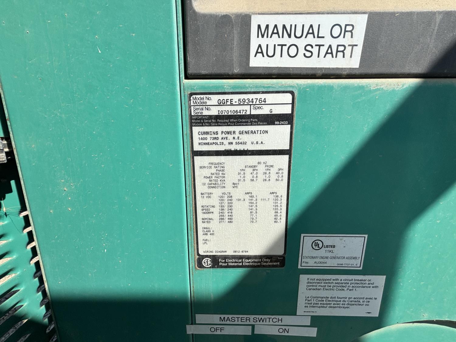 247 2007 Cummins GGFE-5934764 40 Kw Skid Mounted Generator