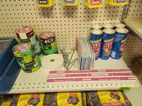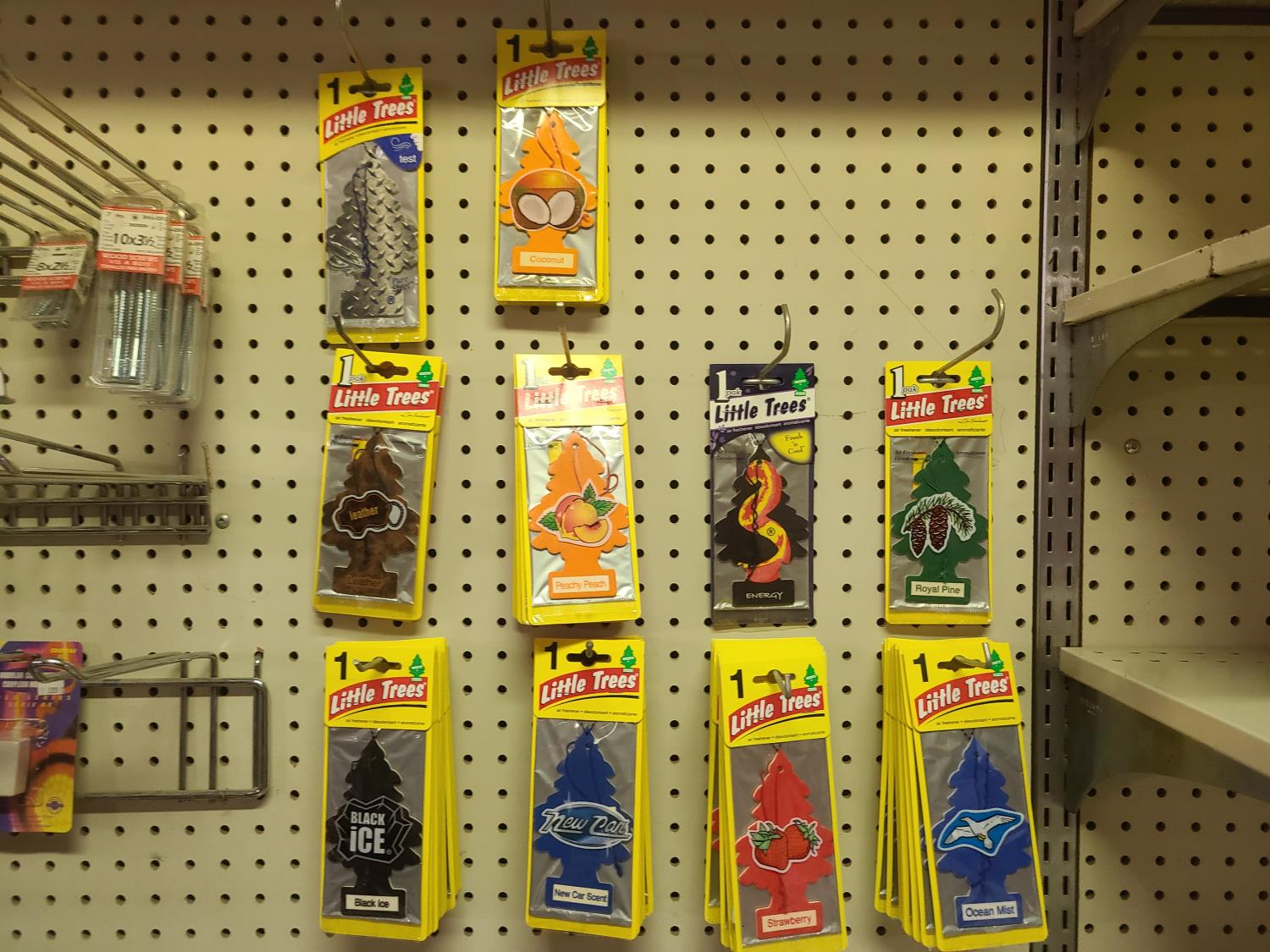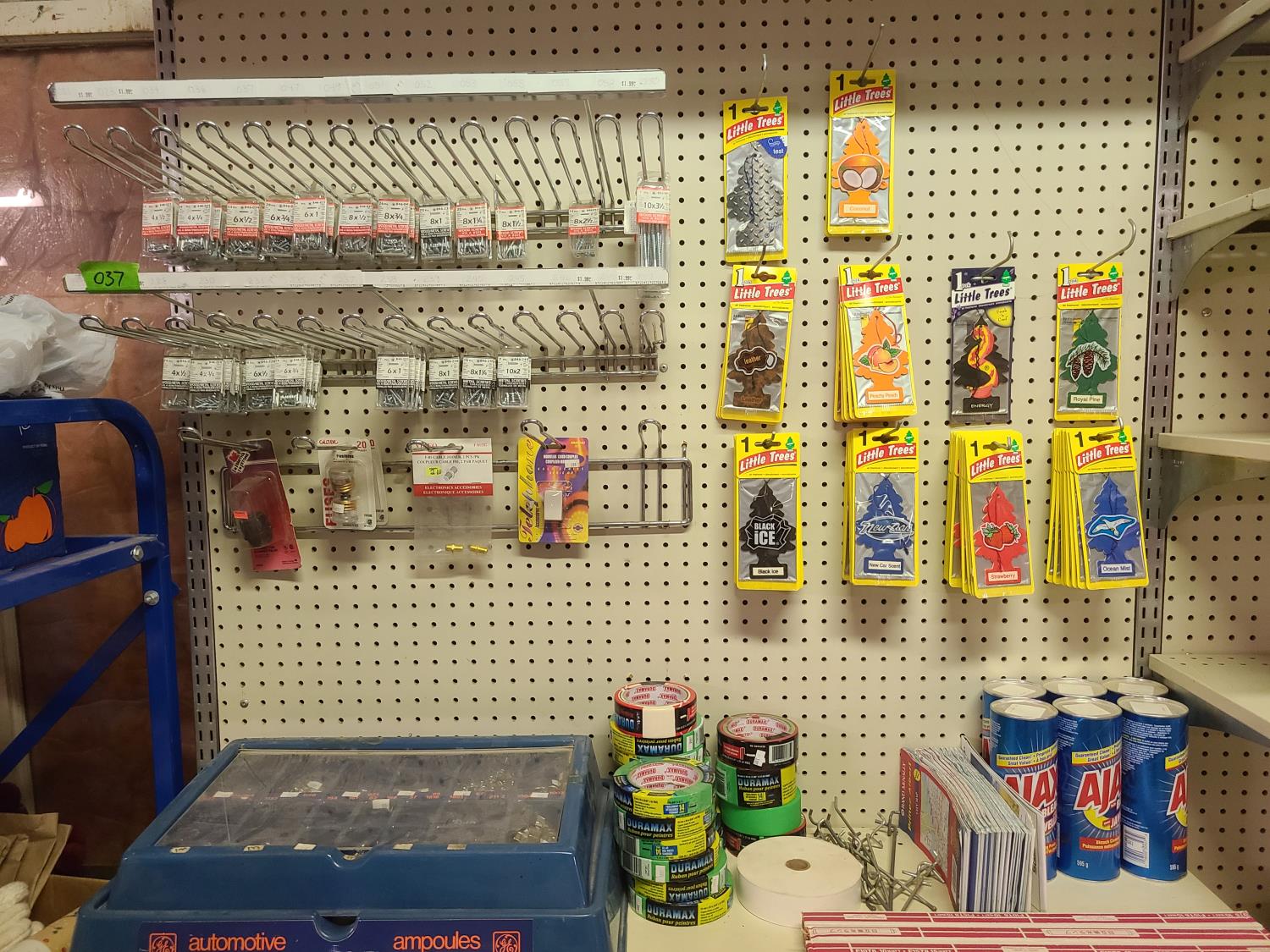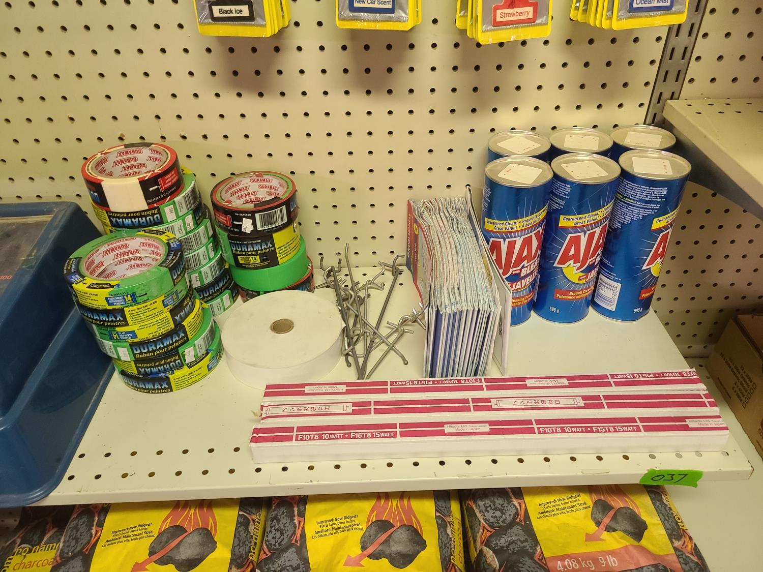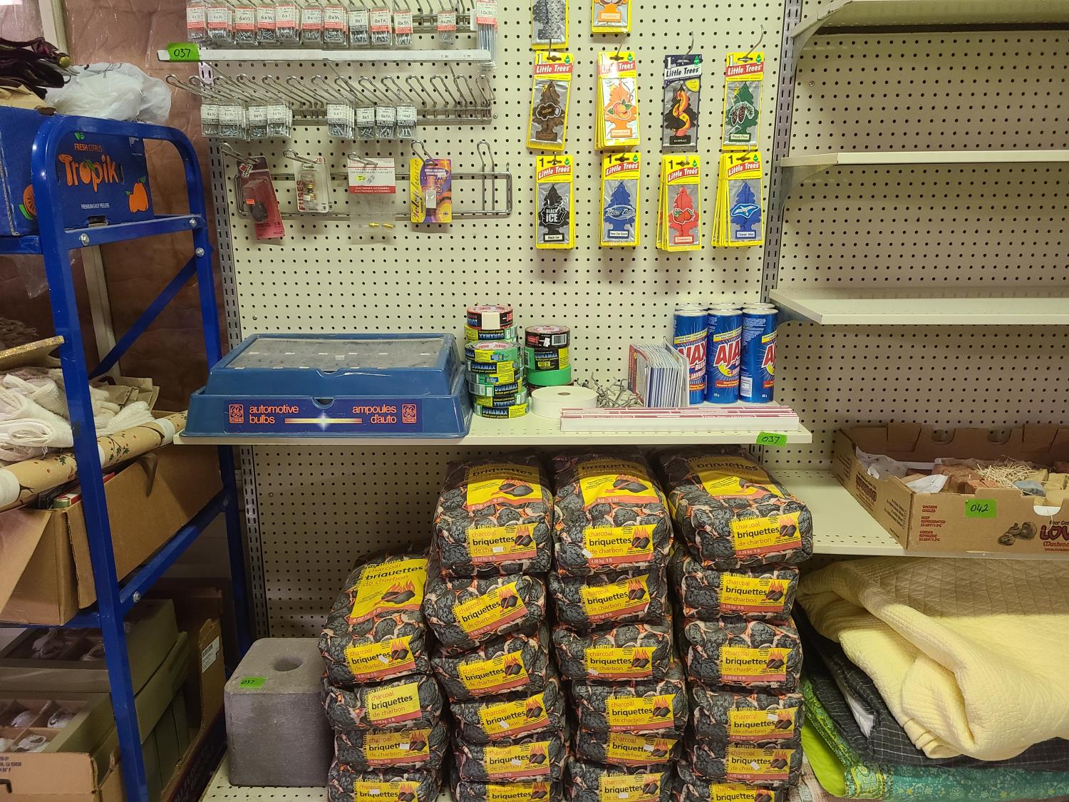 charcoal briquettes, ajax bleach, painters tape, road maps, little tree air freshners, screws, automotive bulbs, 10w tube bulbs