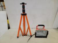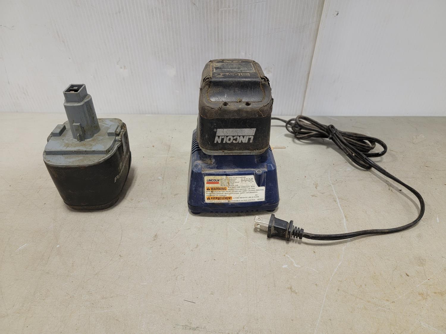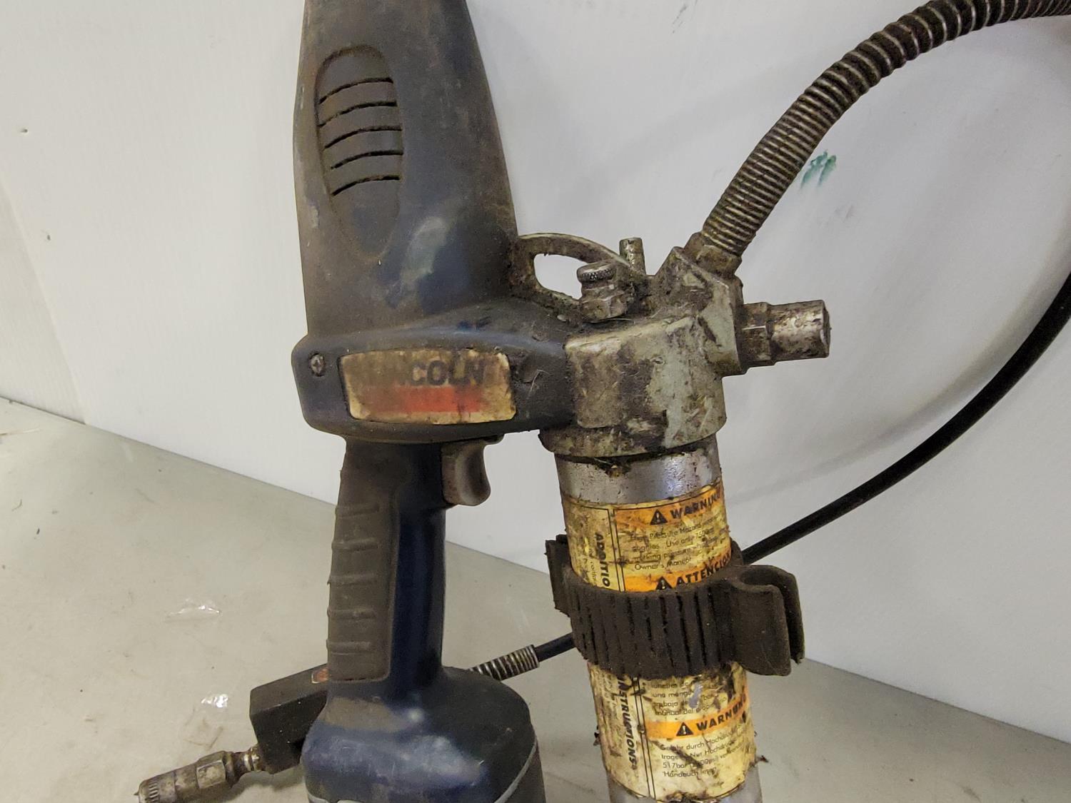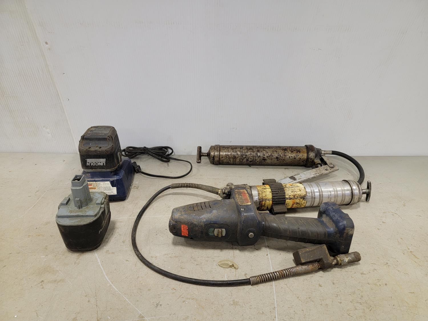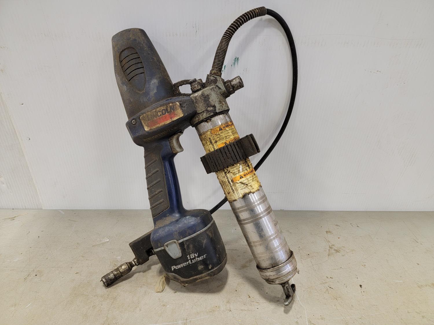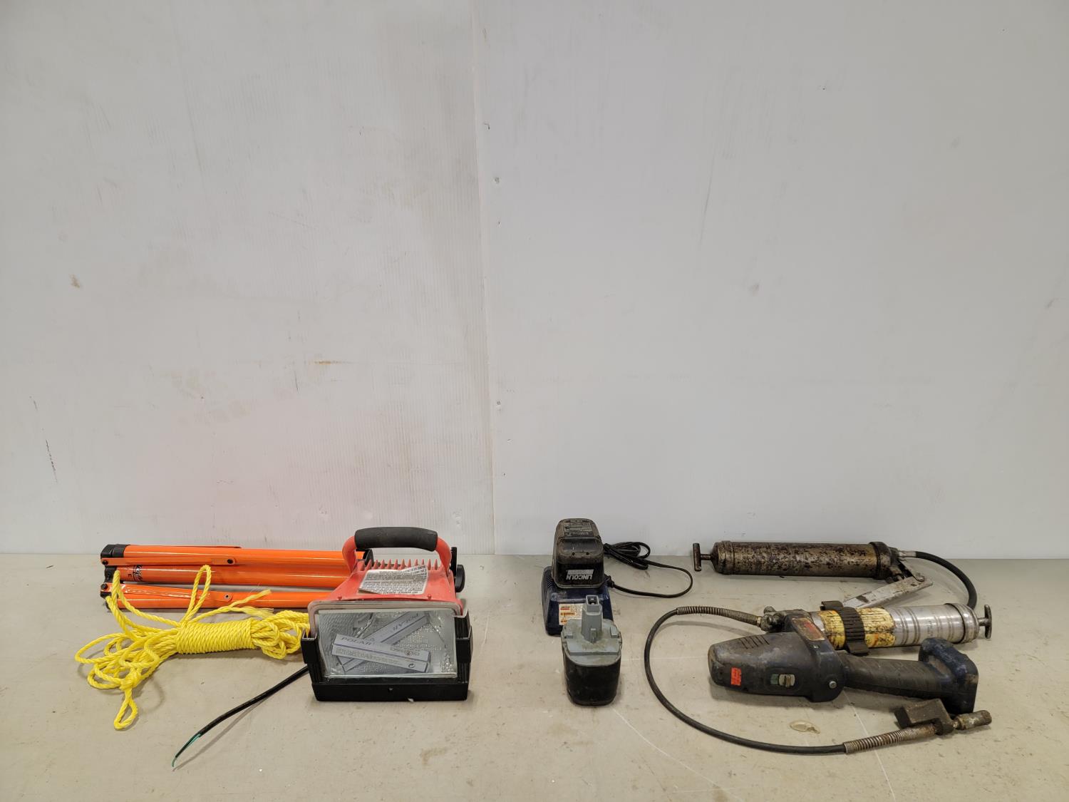 Lincoln 18V grease gun with extra battery, manual grease gun, work light, stand and rope