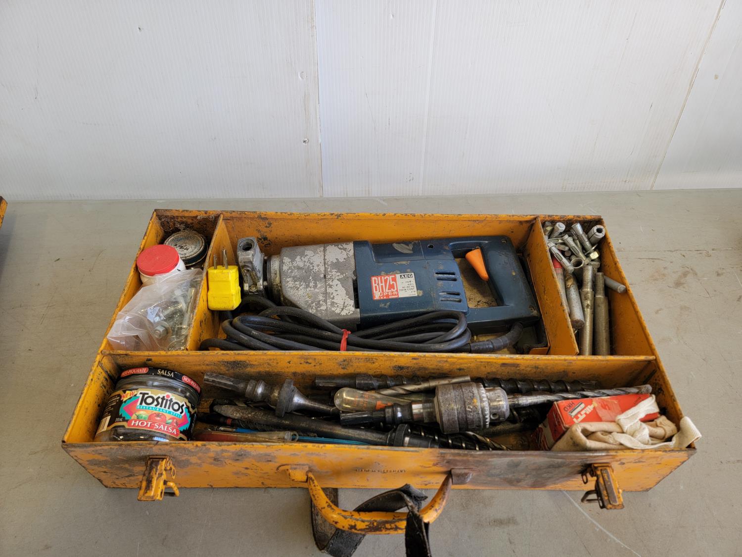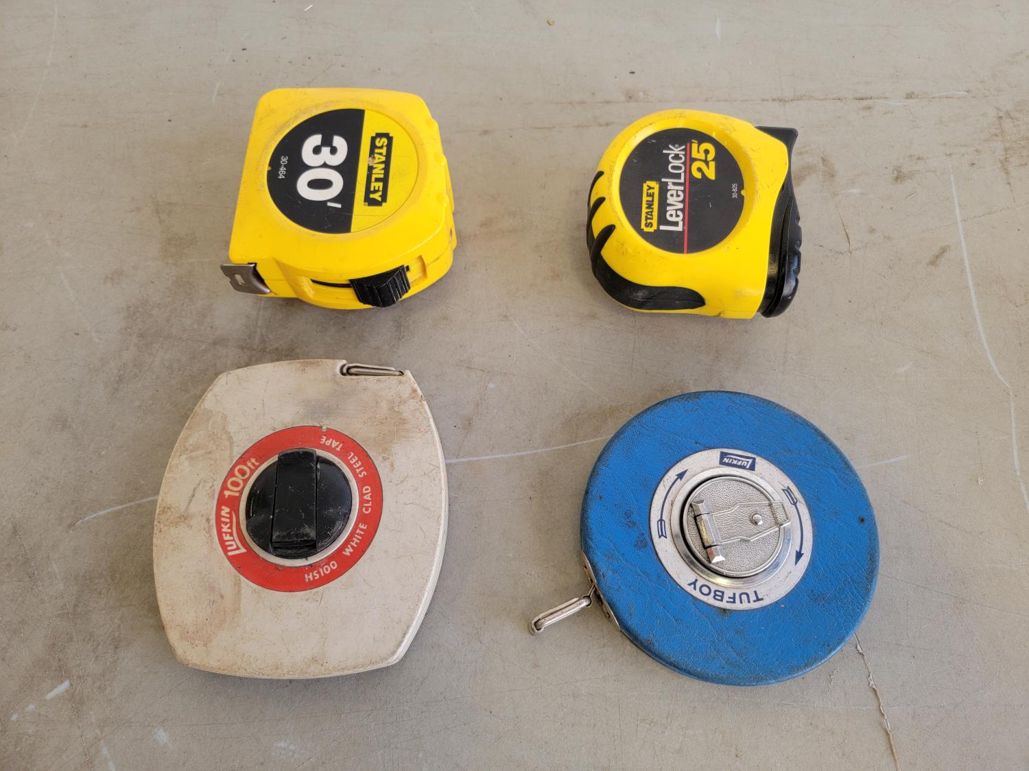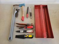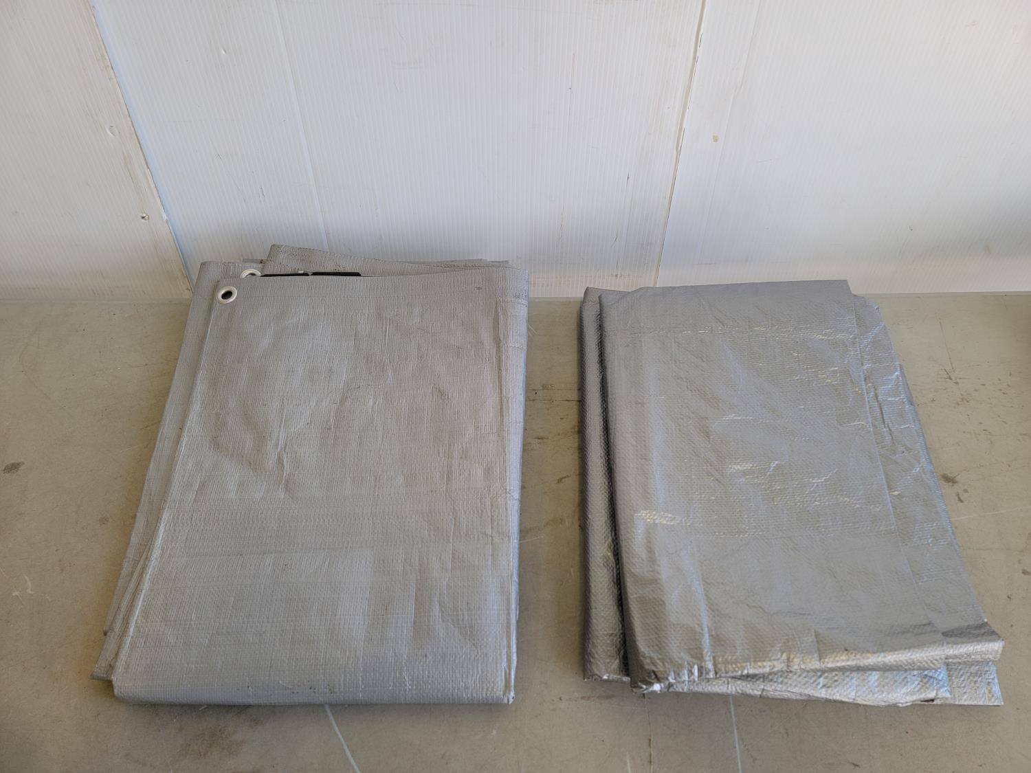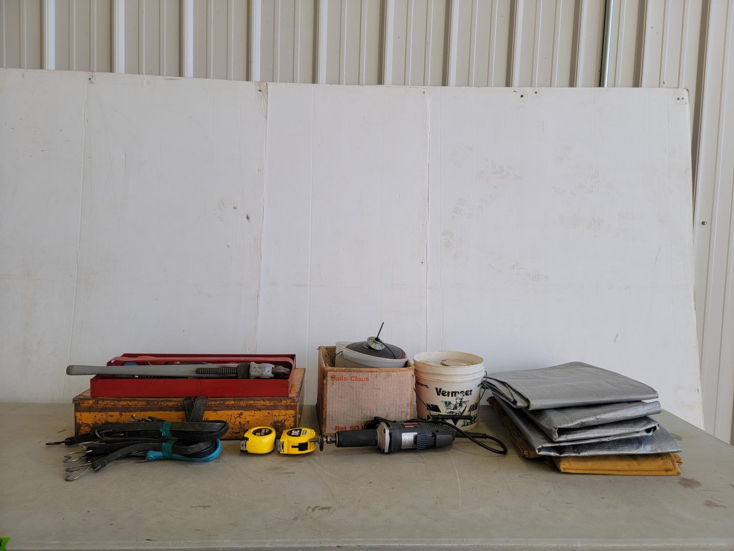 Canvas tarps, poly tarps, nails, tape measures, Ridgid pipe wrench, knives, hatchet, bungee straps, Concrete drill and bits, Black & Decker 1-1/2 inch die grinder