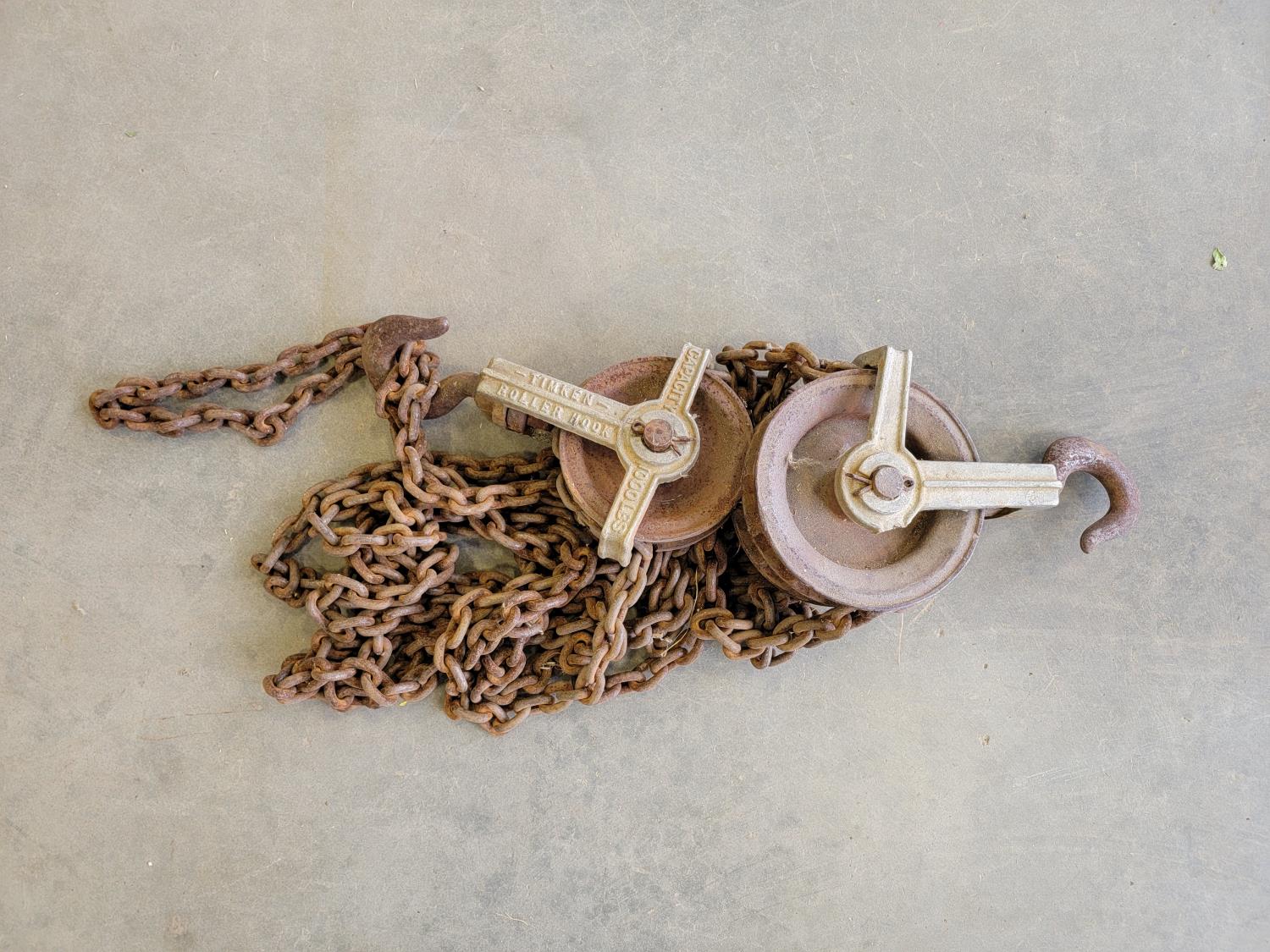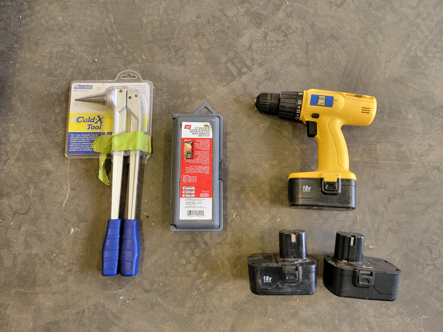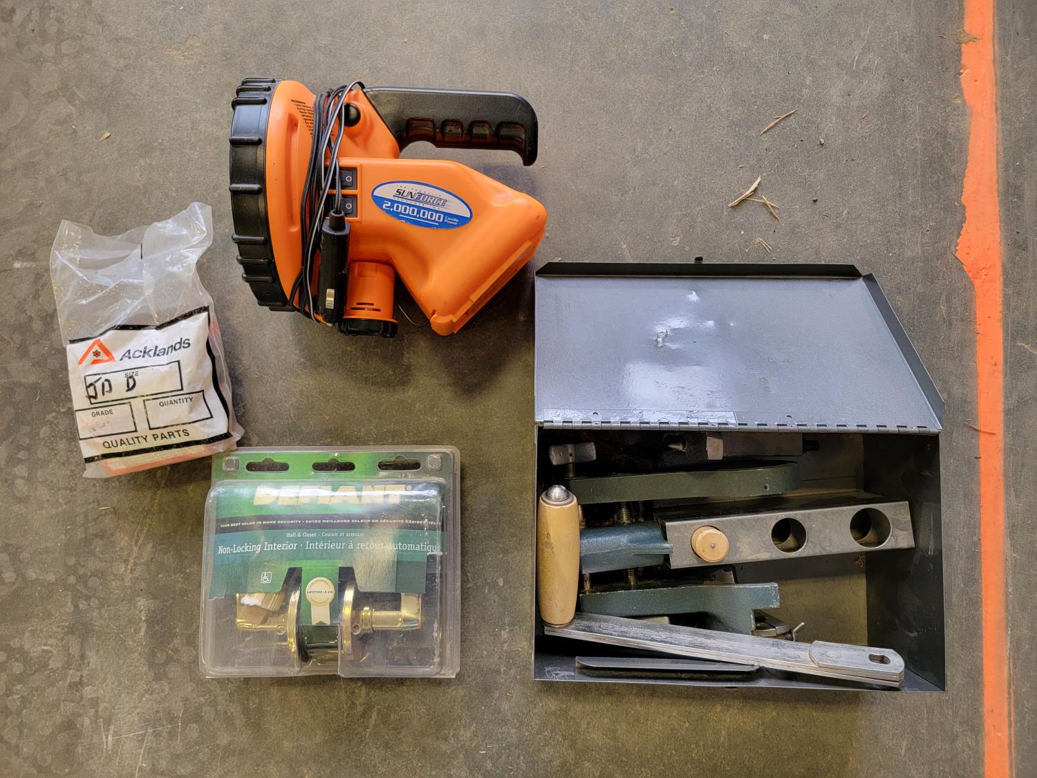 Various hardware, Timken roller hook, Power Fist 18V cordless drill, Cold-X tool, Sunforce spot light, hydraulic cylinders