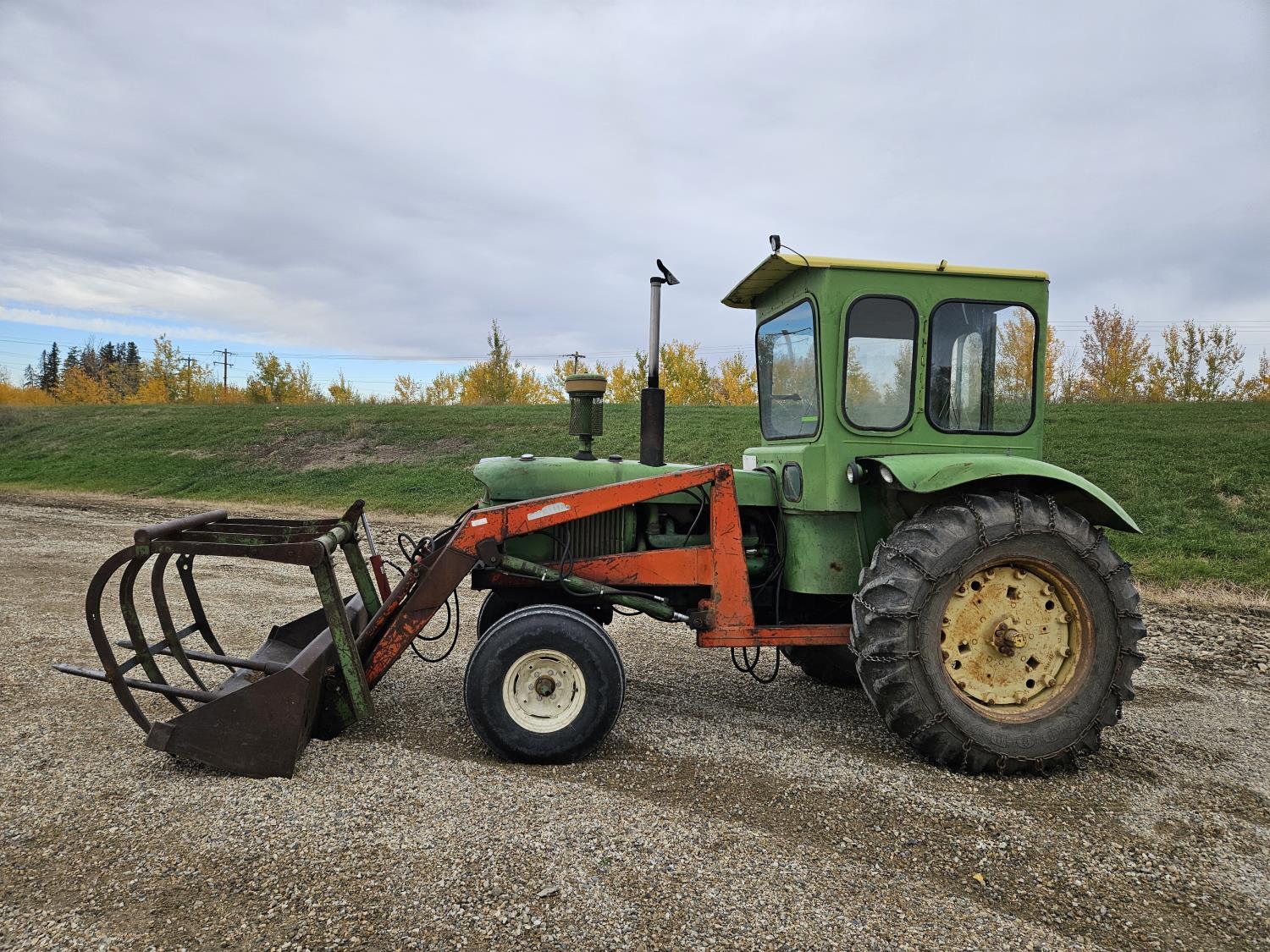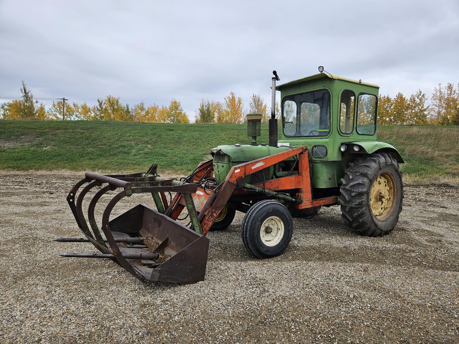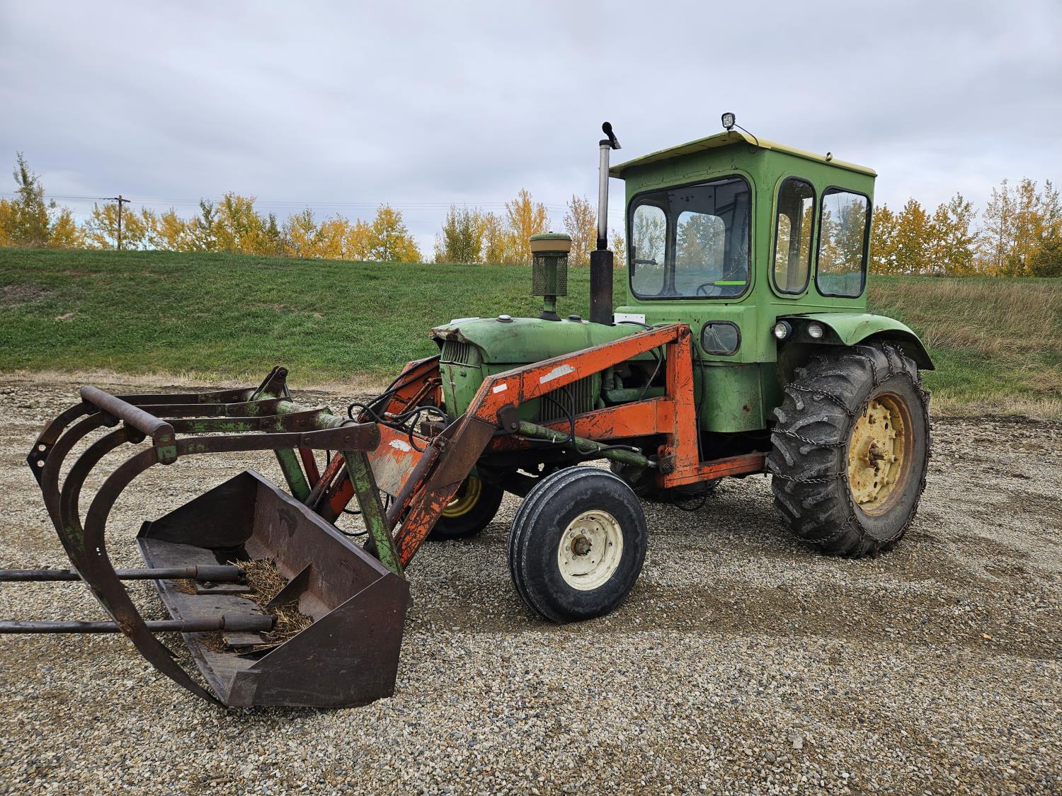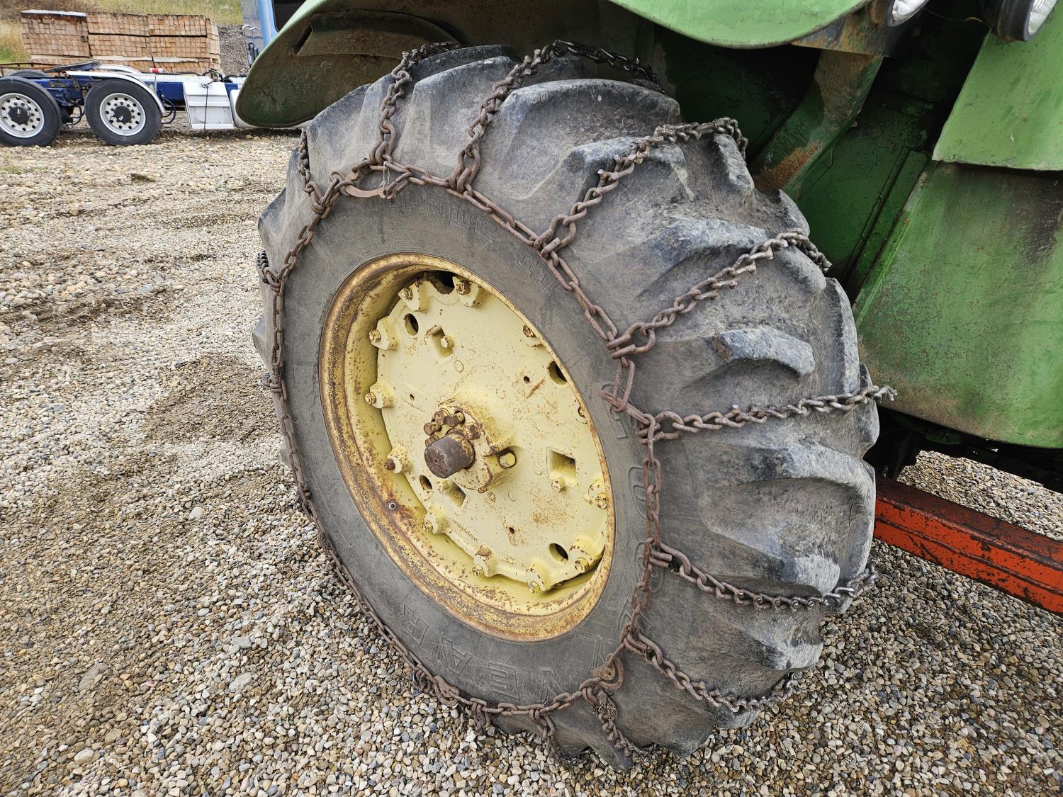 Lift-Rite 121 loader, 84 inch bucket, grapple, John Deere 6.6 L 6 cylinder diesel engine, 8 speed power shift transmission, power steering, cab, 540/1000 PTO, 1 rear hydraulic outlets, 10.00-16 front tires, 18.4-34 rear tires, rear tire chains