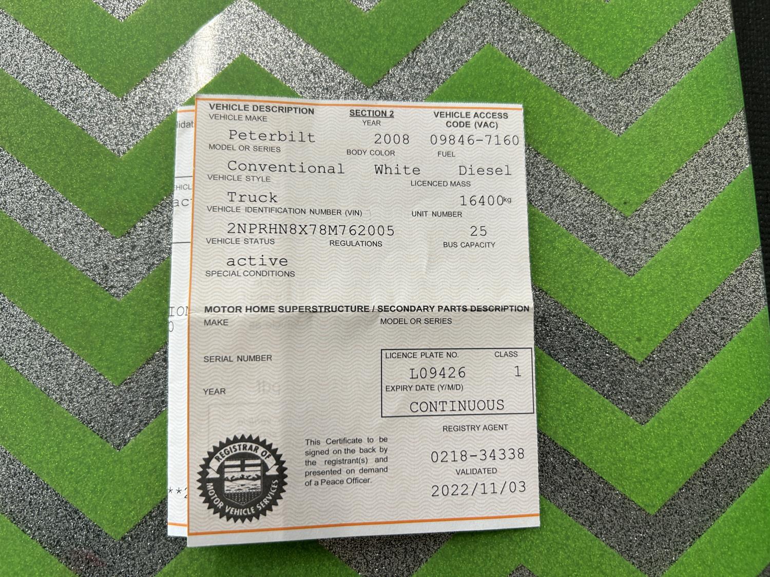 Paccar PX-8 8.3 L 300 HP diesel engine, positive air shutoff, automatic transmission, A/C, cruise control, air ride driver seat, stereo, air ride cab, diff lock, 208 inch WB, 385/65R22.5 front tires, 11R22.5 rear tires