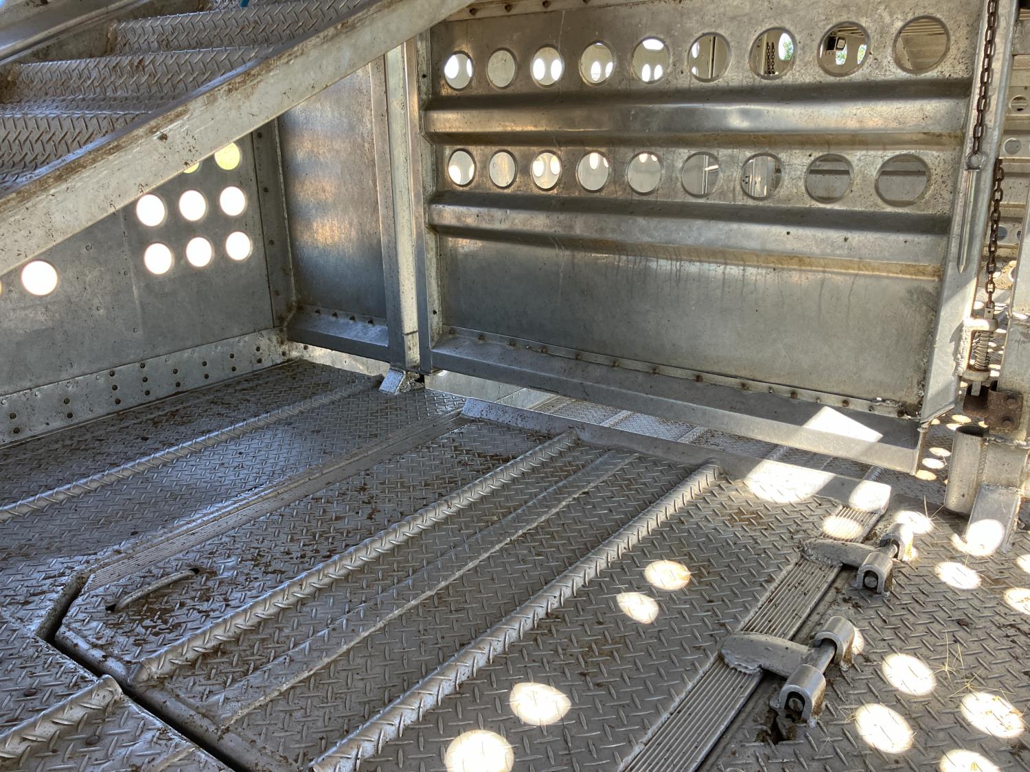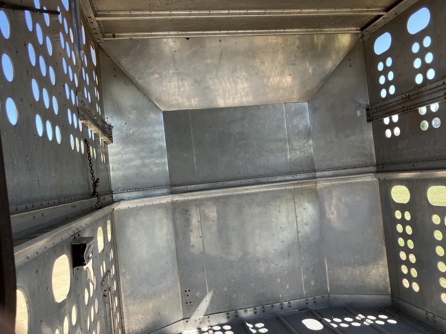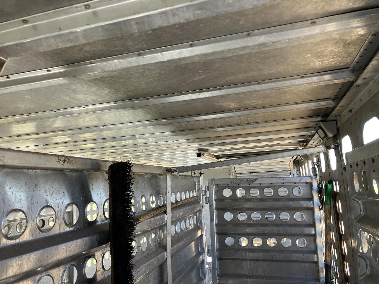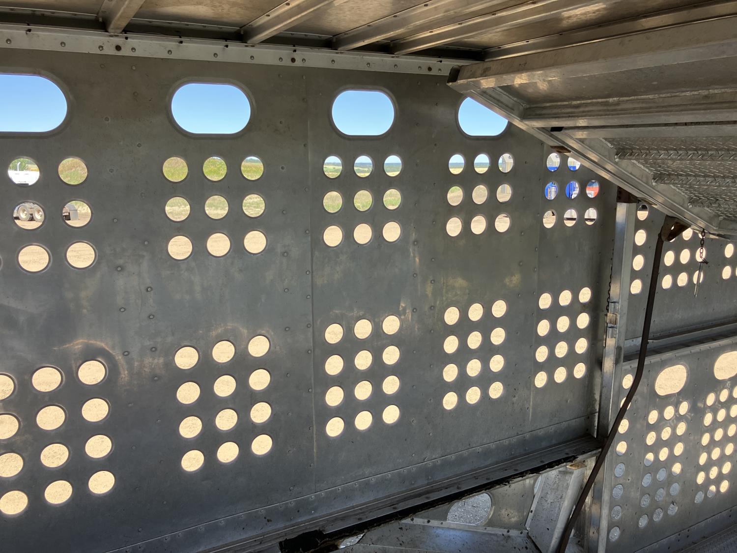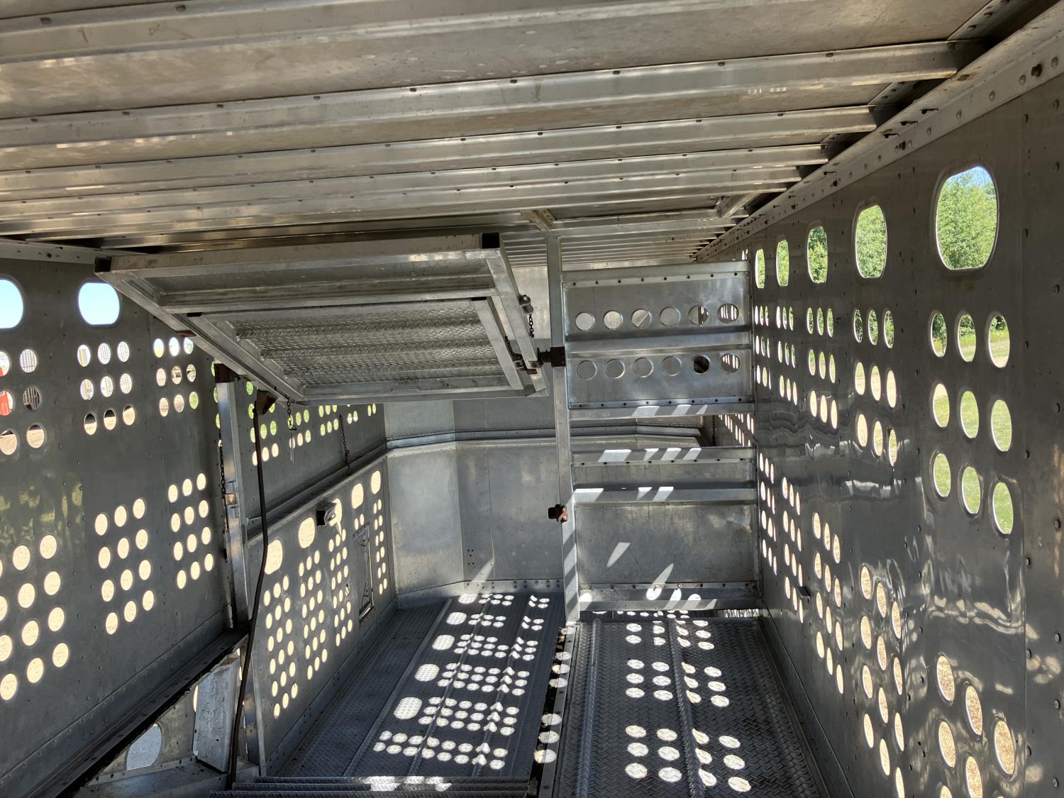 dog house, suspension air gauge, front and rear lift axels, 16 ft rear end, 26 ft belly, 10 ft nose, front deck planks, escape latches, aluminum wheels, 225/70R22.5 tires