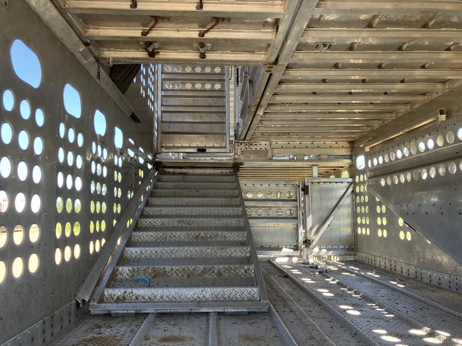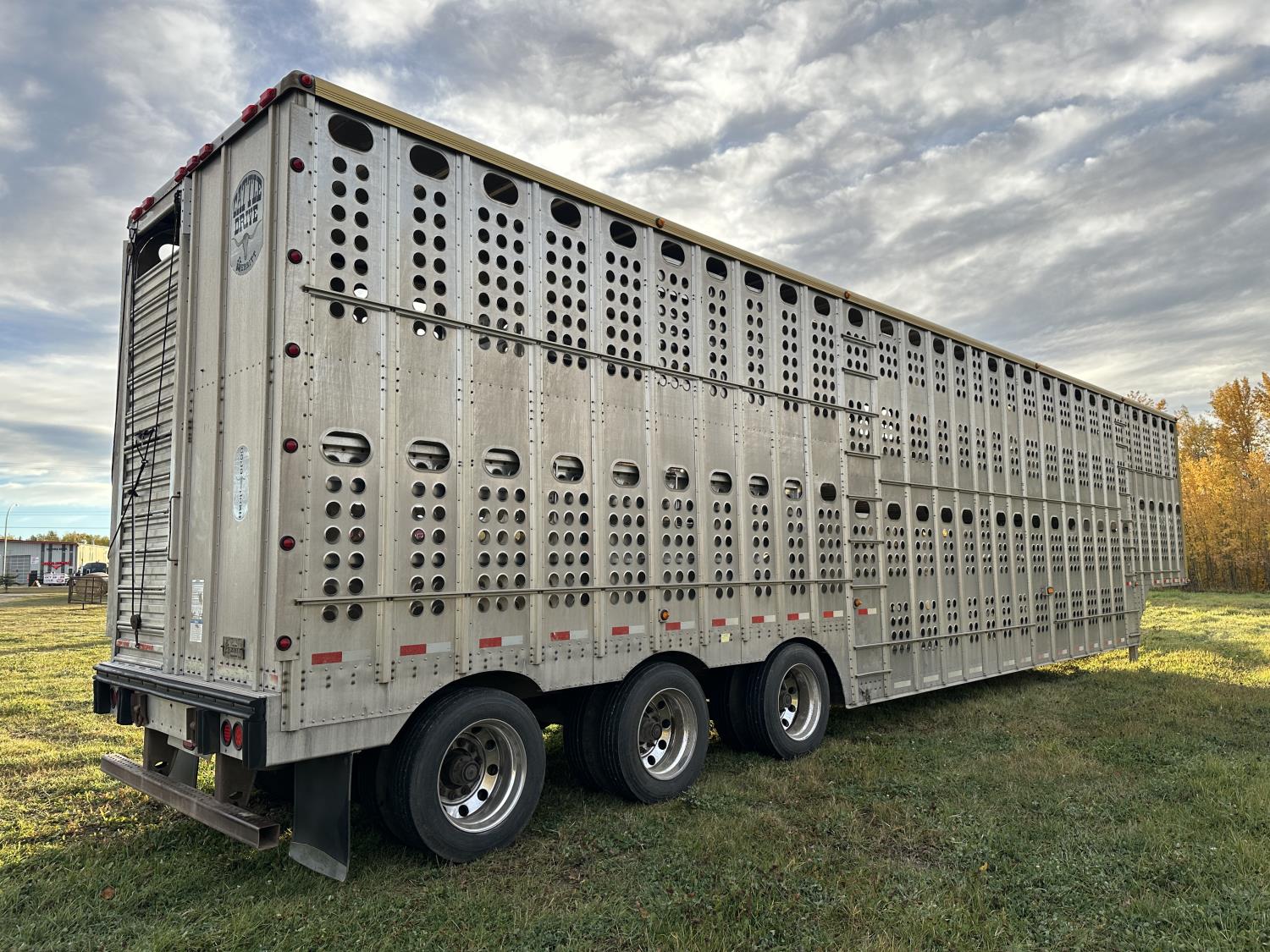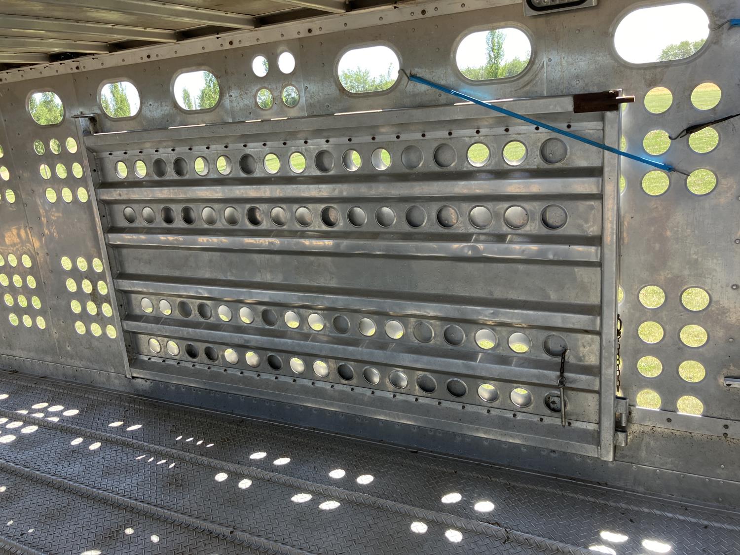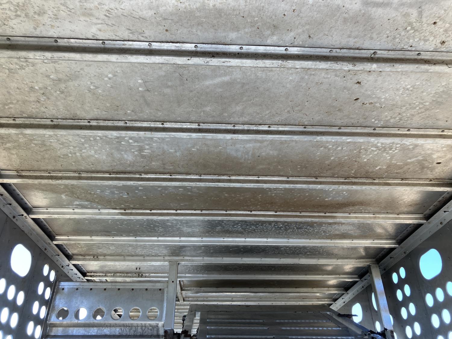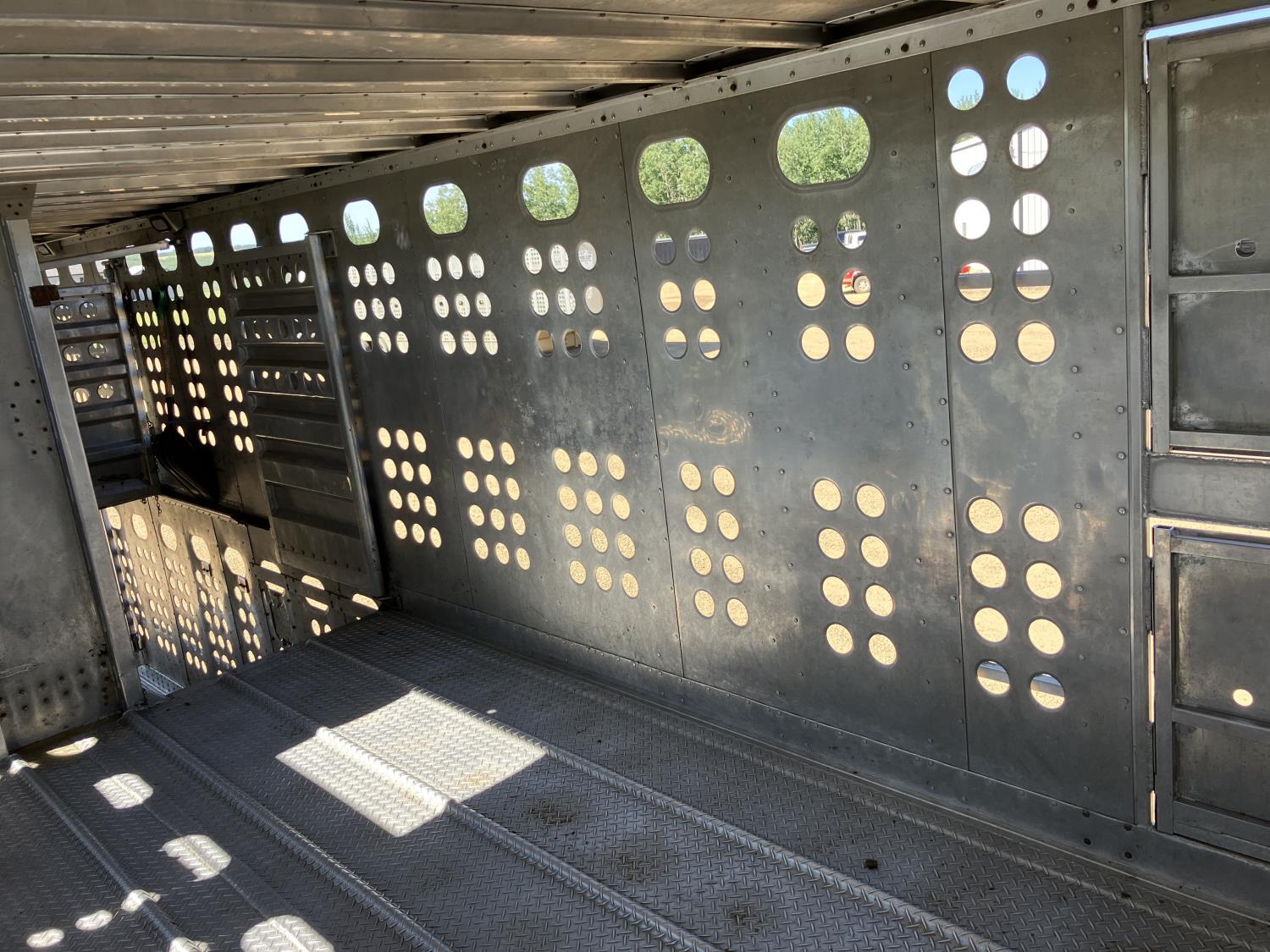 dog house, suspension air gauge, front and rear lift axels, 16 ft rear end, 26 ft belly, 10 ft nose, front deck planks, escape latches, aluminum wheels, 225/70R22.5 tires