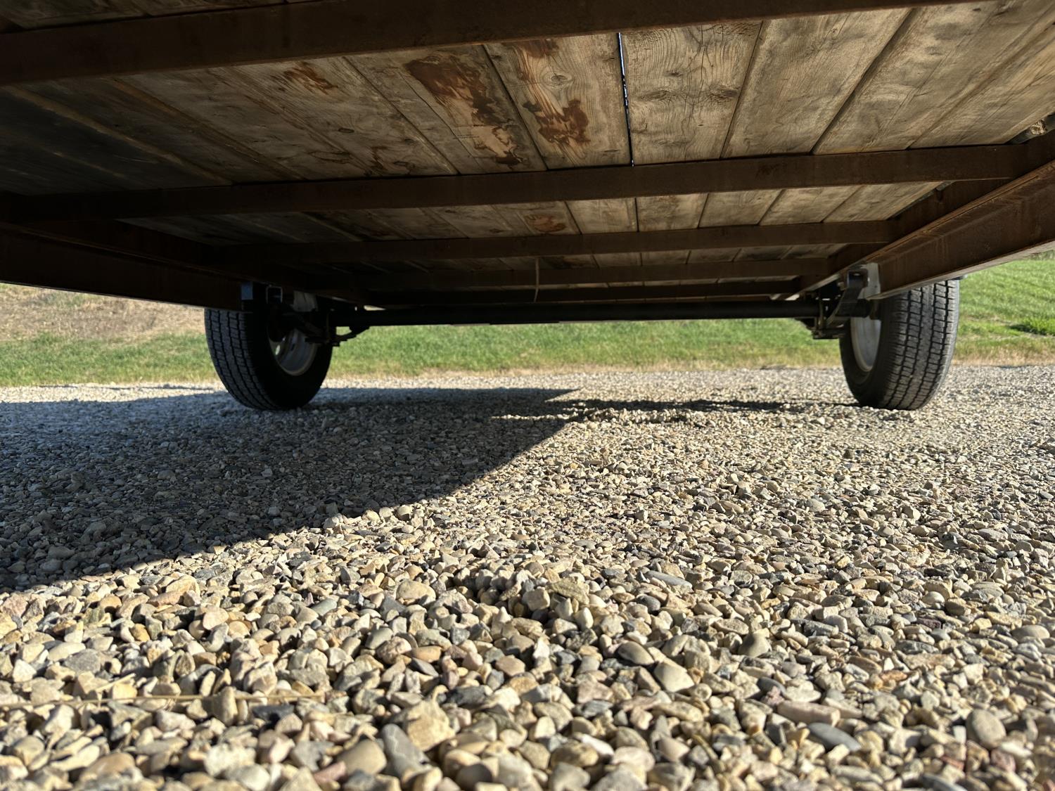 70 inch wide deck, wood deck, stand up ramps, electric brakes, spring suspension, ball hitch, tool / storage box, rub rails, stake pockets, 205/75R15 tires