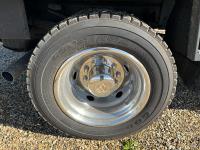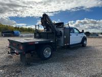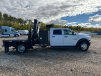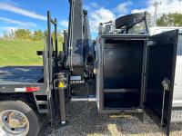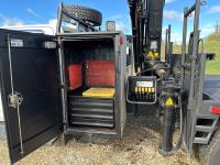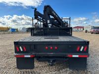 Cummins 6.7 L 24V 305 HP diesel engine, DEF deleted, engine brake, electric engine block heater, positive air shutoff, automatic transmission, A/C, cruise control, leather interior, radio, 7 ft 10 inch x 6 ft deck, chain holders, HIAB 077 BS-3CLX 3 section knuckle rear mount crane, outriggers, spring suspension, 7,000 lb front axle, 13,500 lb rear axles, all aluminum wheels, 225/70R19.5 tires