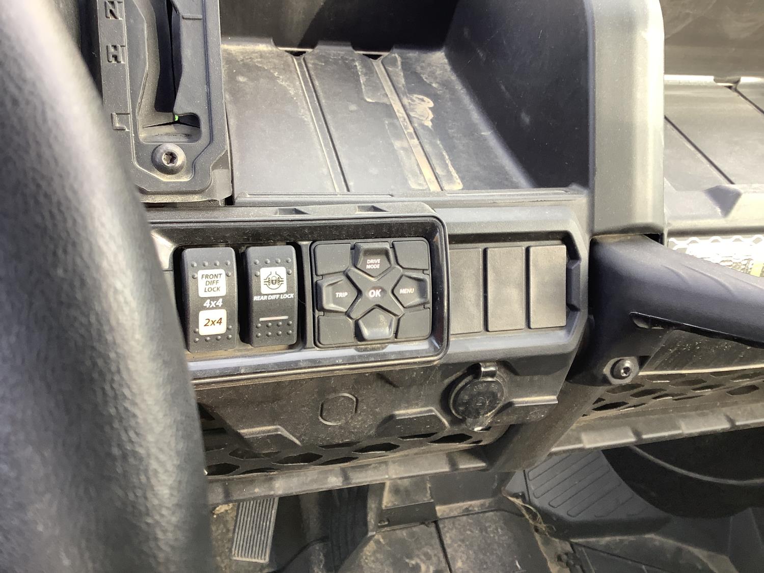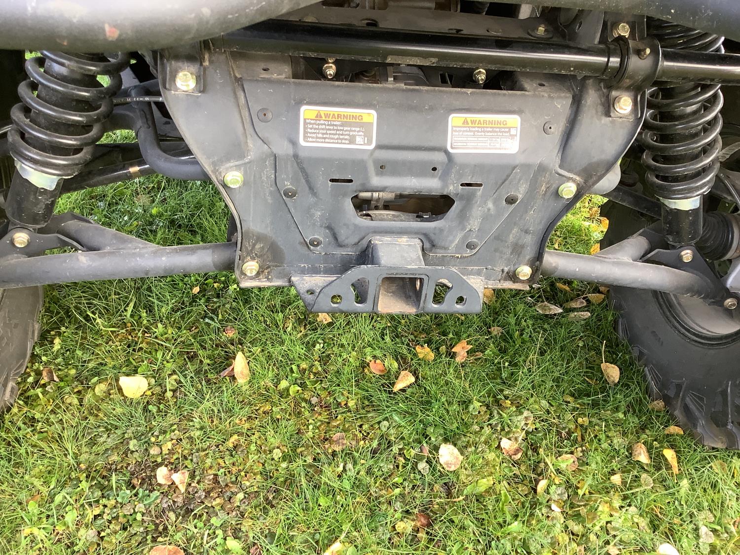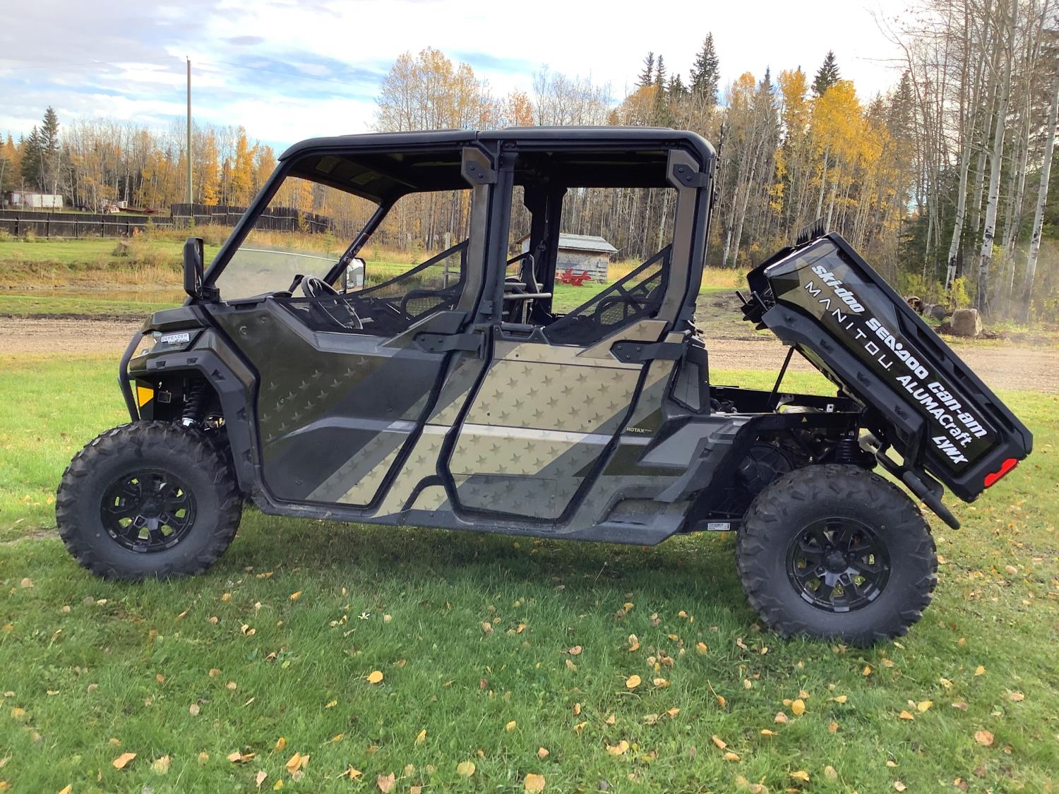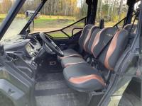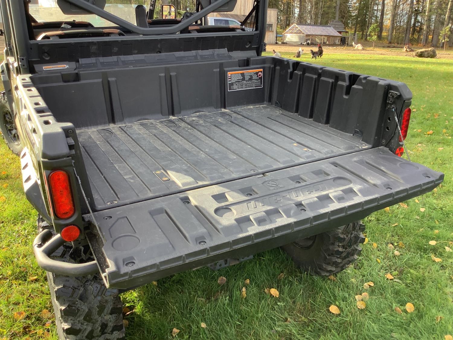 976 cc fuel injected water cooled engine, CVT transmission, Hi/Lo range, 4 passengers, manual dump box, 4 door, front and rear differential lock, aluminum rims, 4500 lb front winch, rear tow hitch, 10.00R14 tires