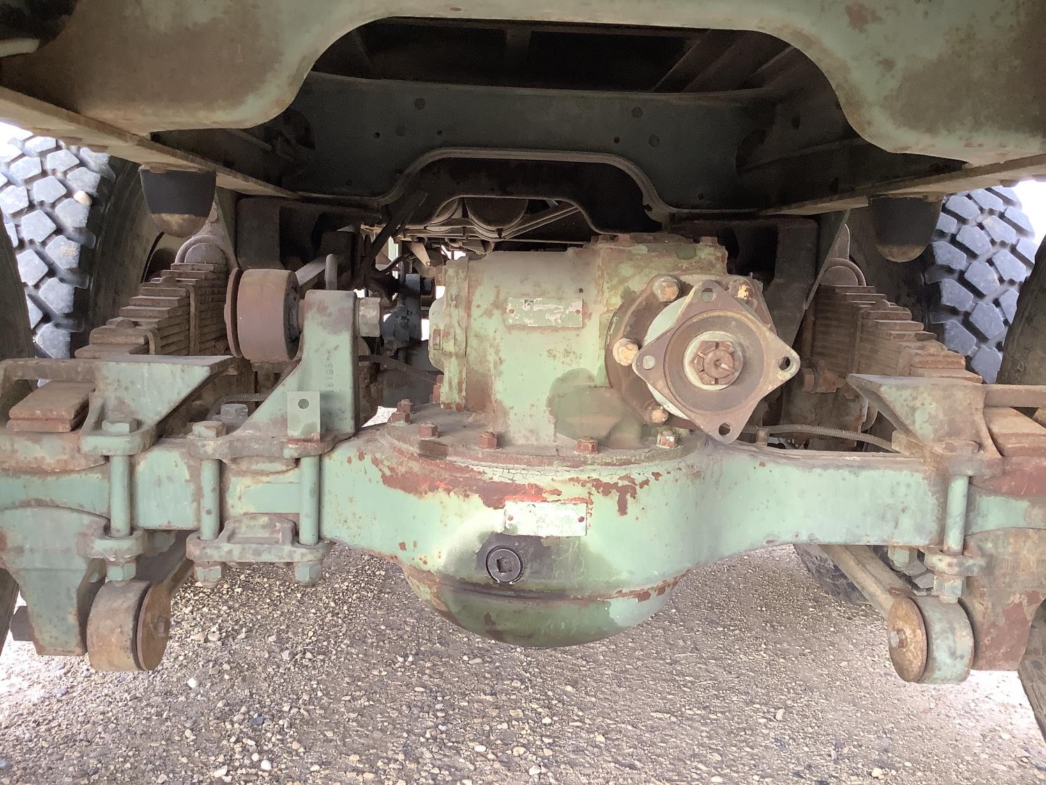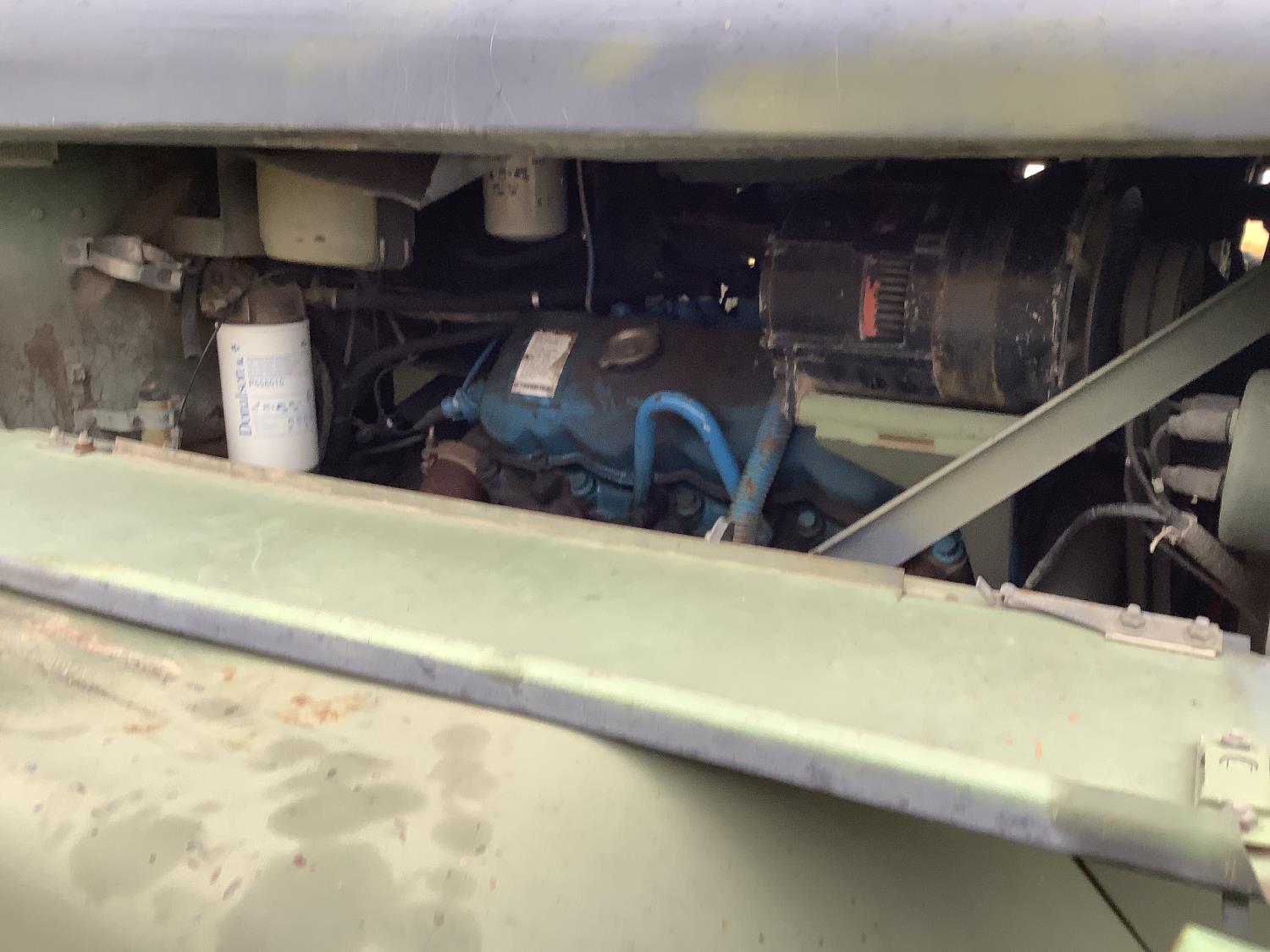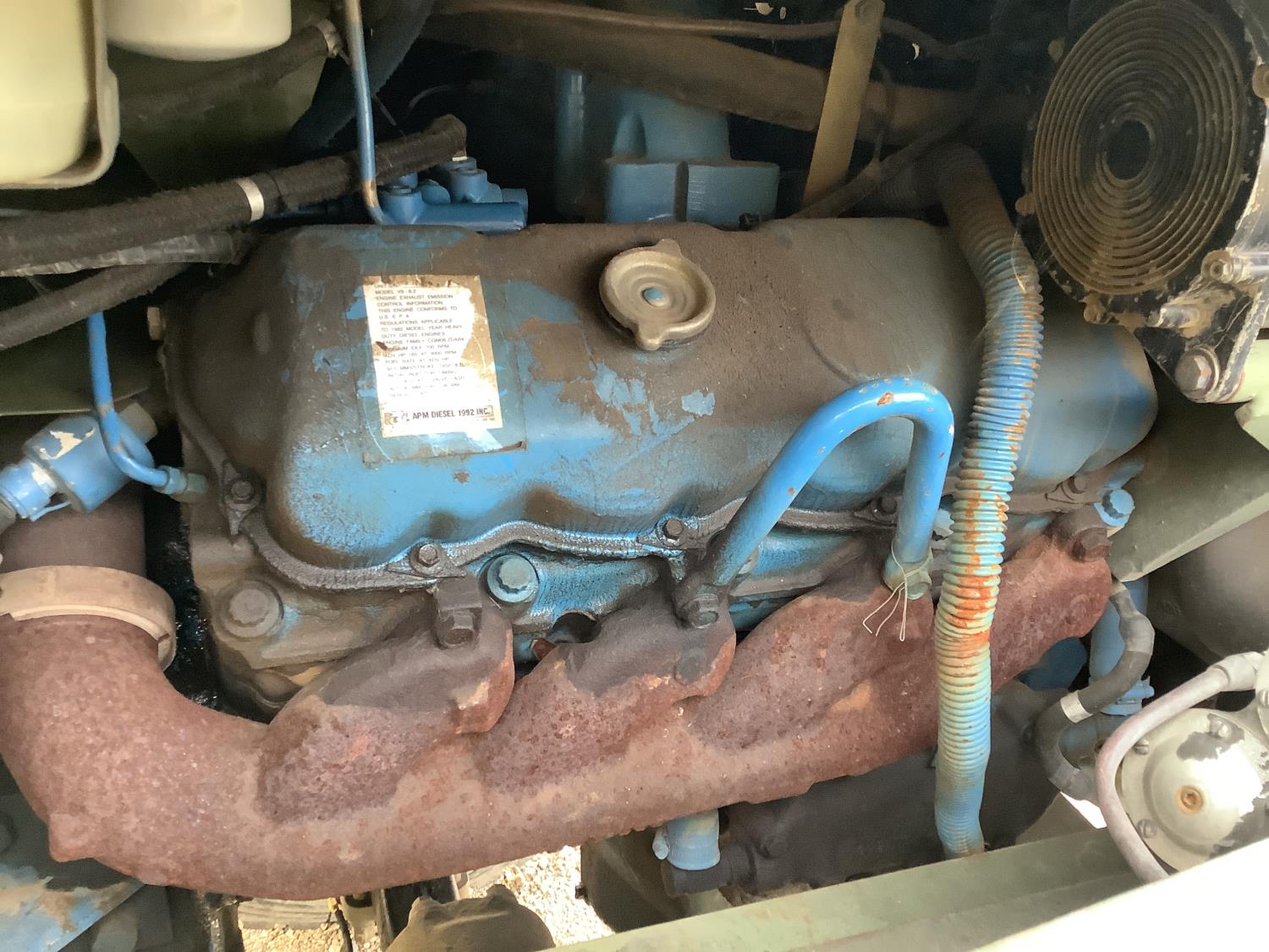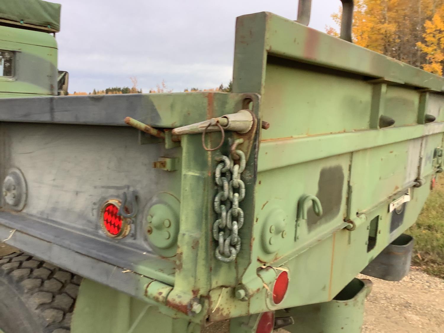 GM 8.2 Fuel squeezer V8 diesel engine, Allison automatic transmission, air over hydraulic brakes, manual park brake, spring suspension, steel box with fold down sides, rear pintle hitch