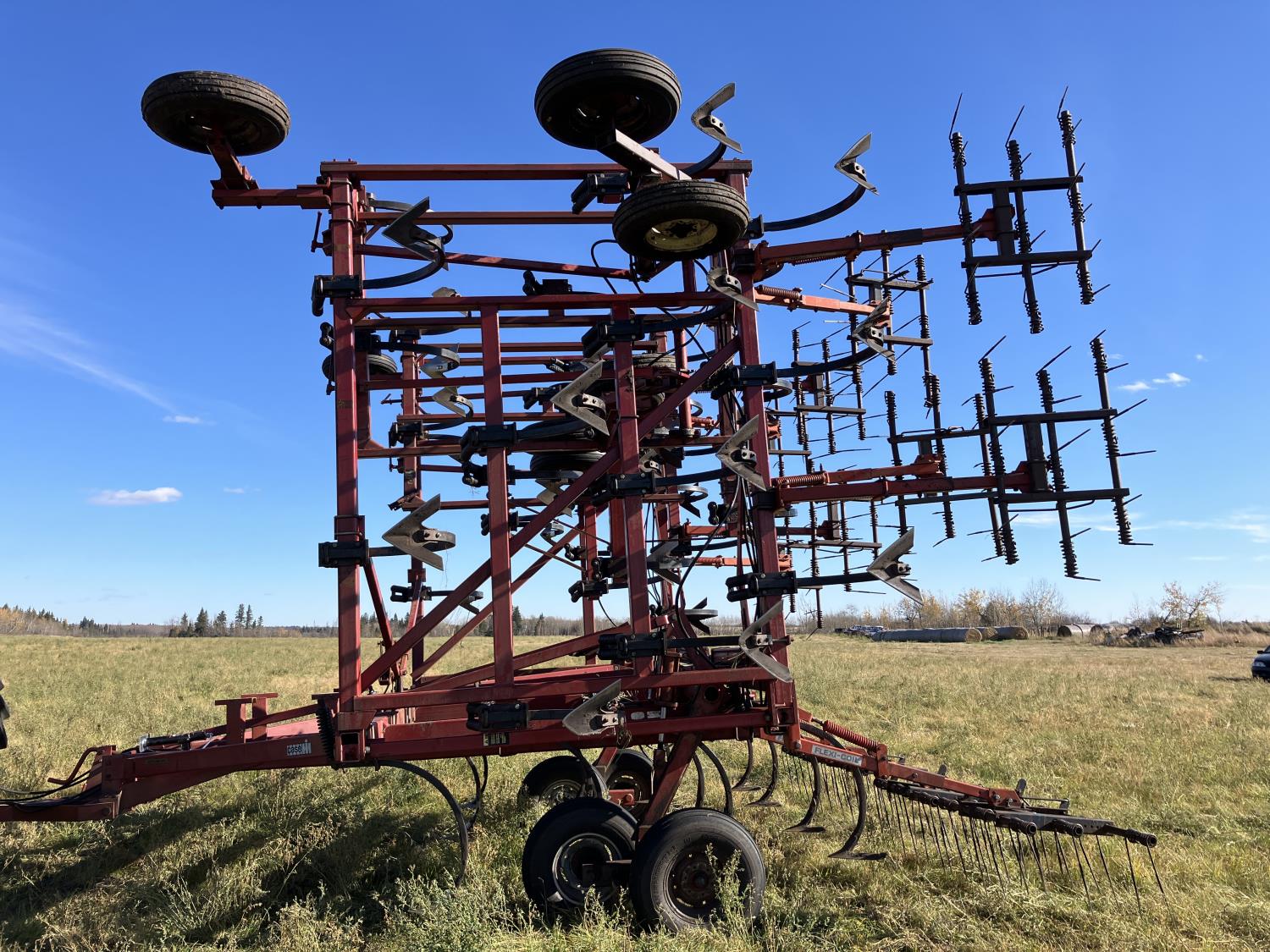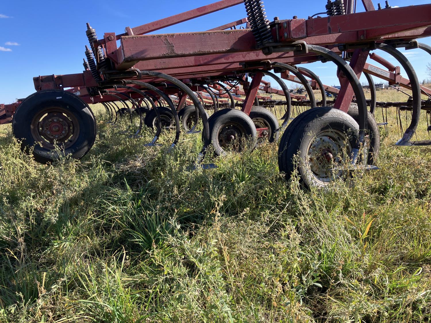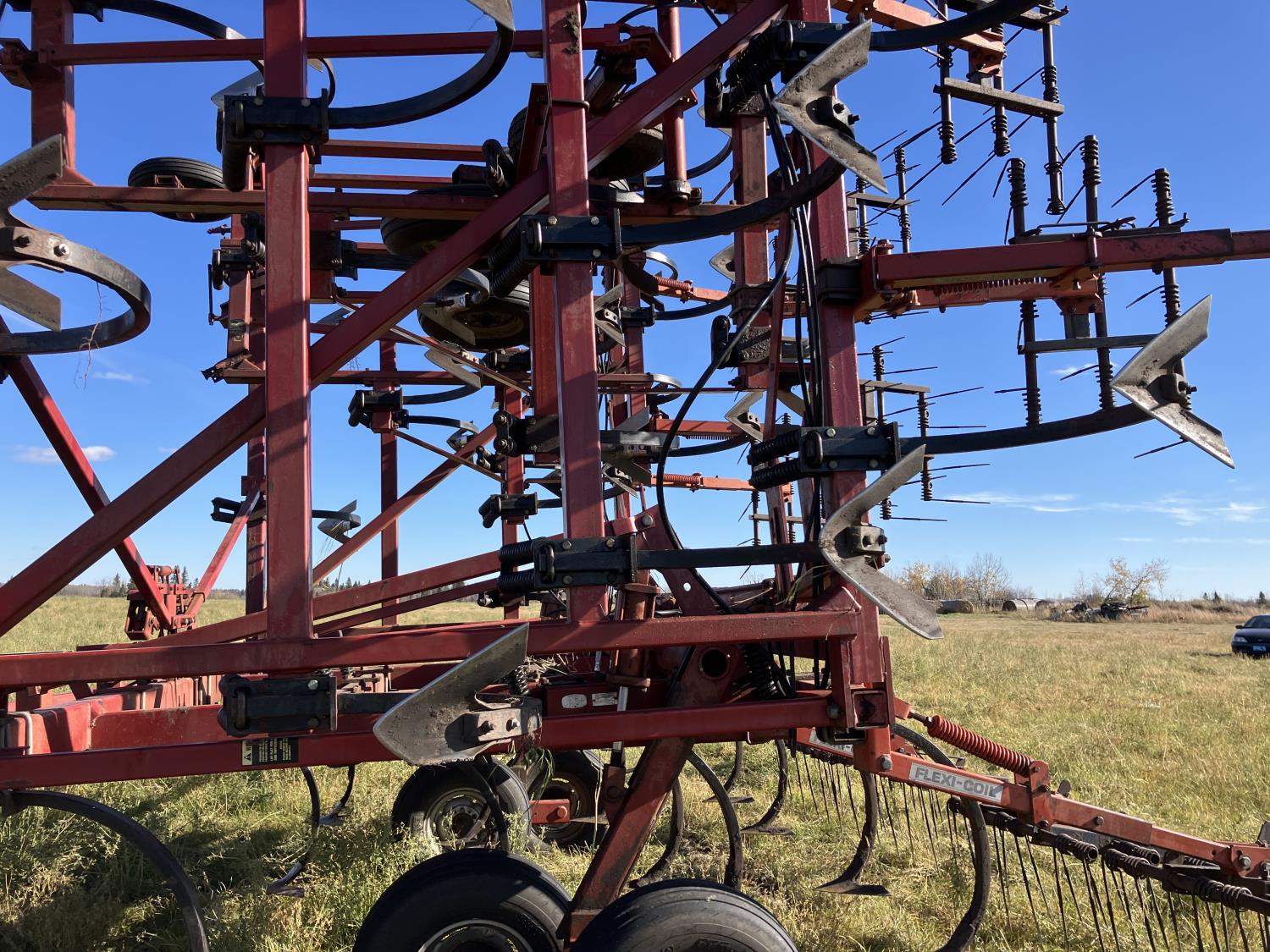 16 inch sweeps, Flexicoil 3 bar spring tooth harrows, walking axles on main frame, walking axles on wings, 16" harrow tines, 11L-15SL main frame tires, 7.60-15 wing tires