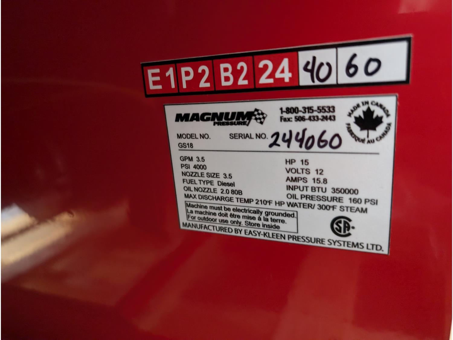3.5 GPM at 4000 PSI, 15 HP, gasoline engine, electric start, 12 volt burner, oil/diesel fired burned/thermostat, schedule 80 coil with stainless steel housing, fully welded, powder coated frame, 10 gallon poly fuel tank