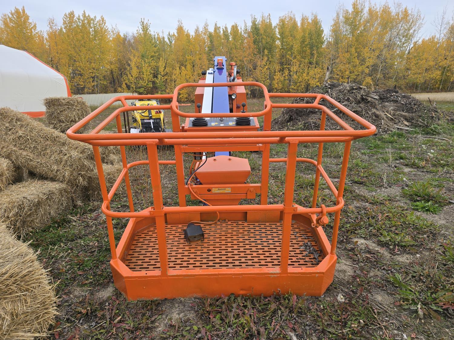 Man basket swivels left to right and tilts. This is a real nice unit runs and drives and hydraulics are smooth.