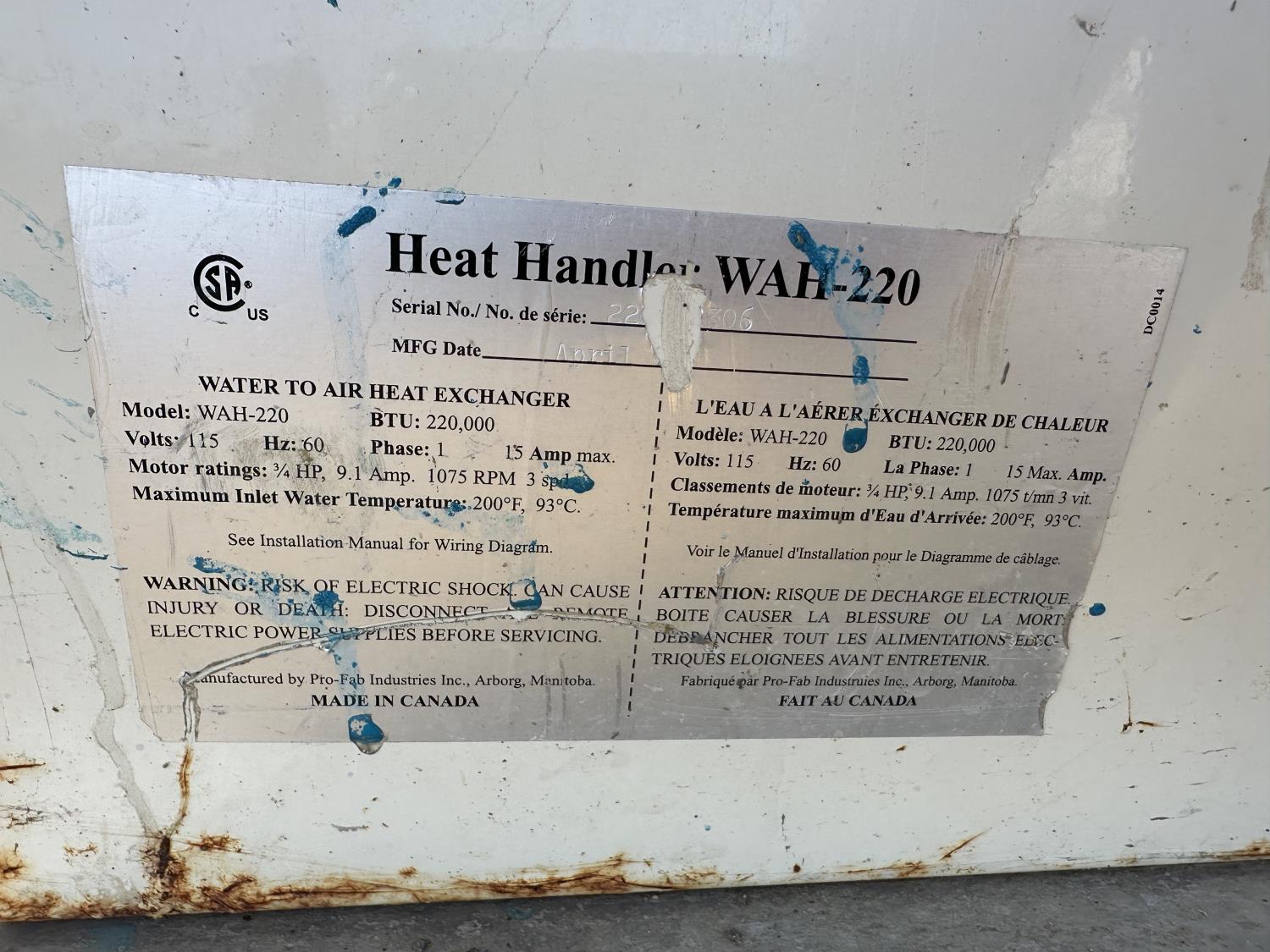 2081 2007 Pro Fab Industries Inc. Heat Handler WAH-220 220,000Btu Water to Air Heat Exchanger