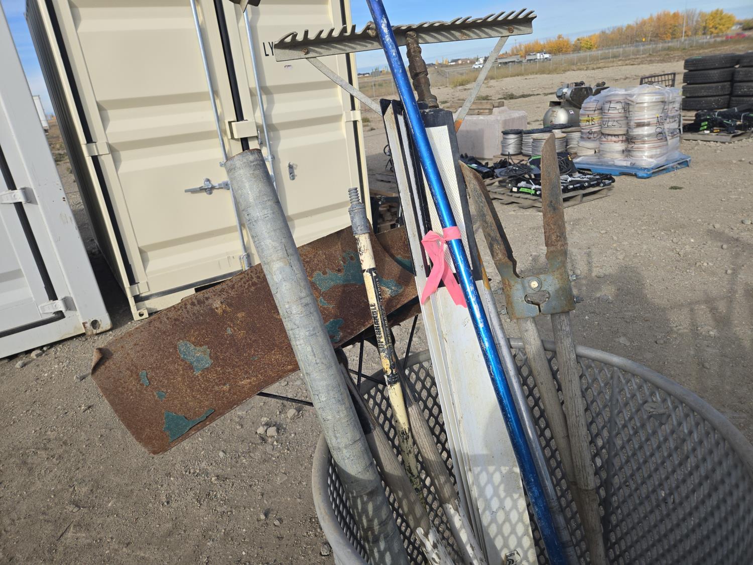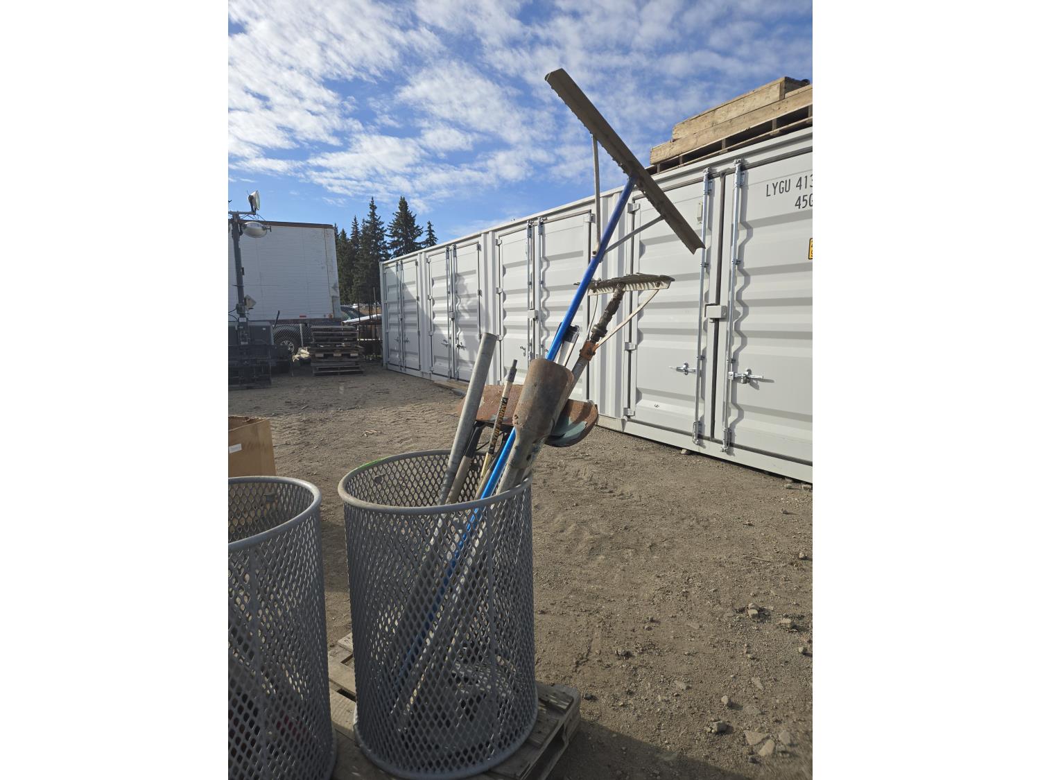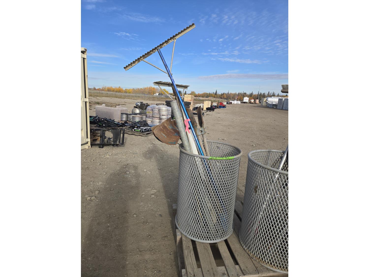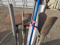 contains (2) snow shovels, (2) landscape rakes, post hole digger
