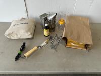 suit, smoker, beeswax foundations, supplements, mite shaker, uncapping hot knife, frame grips