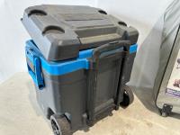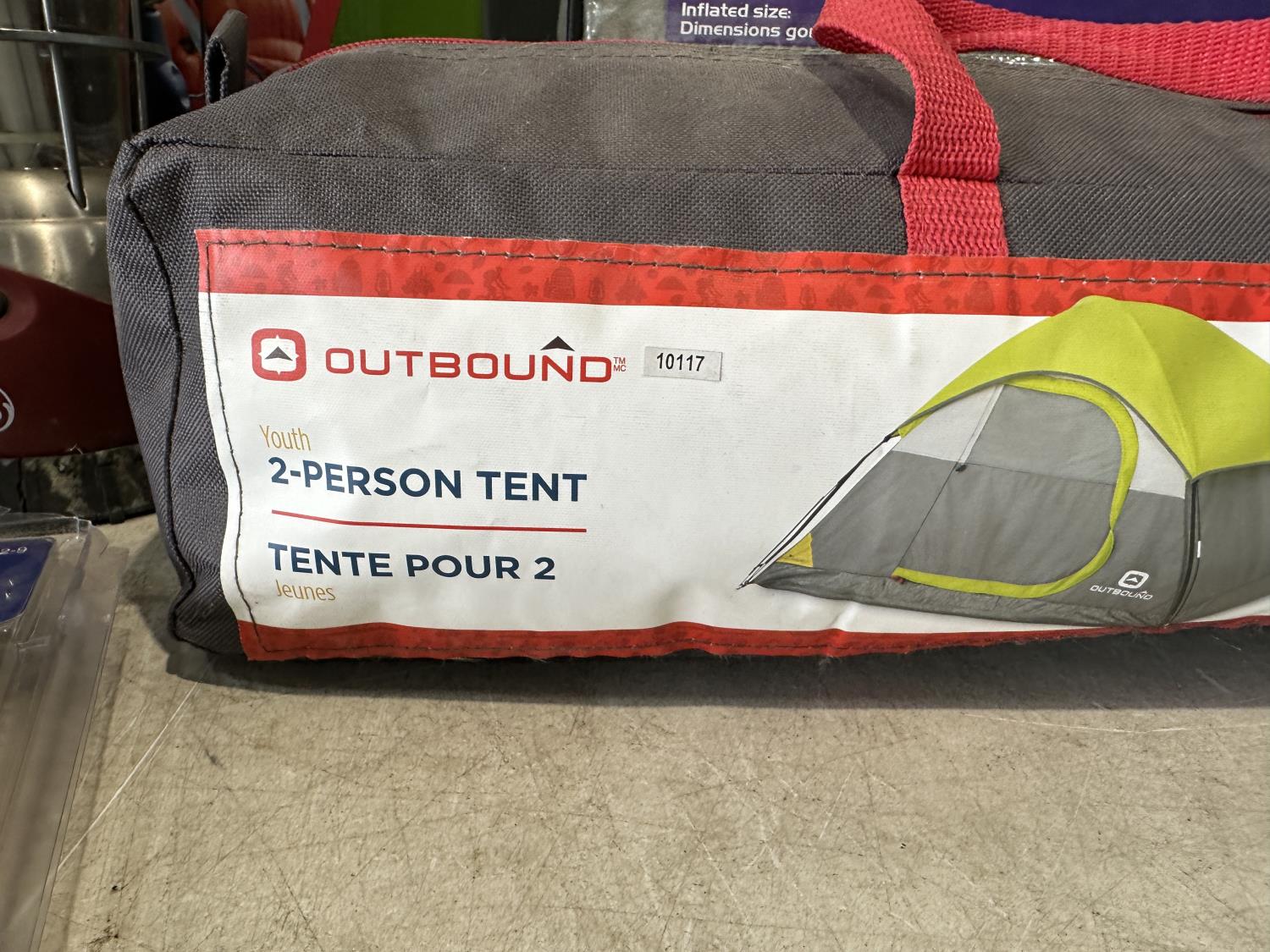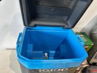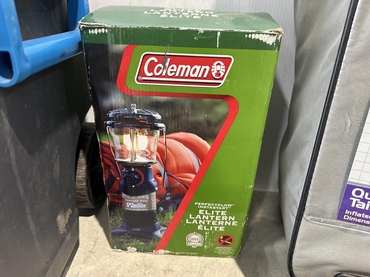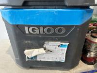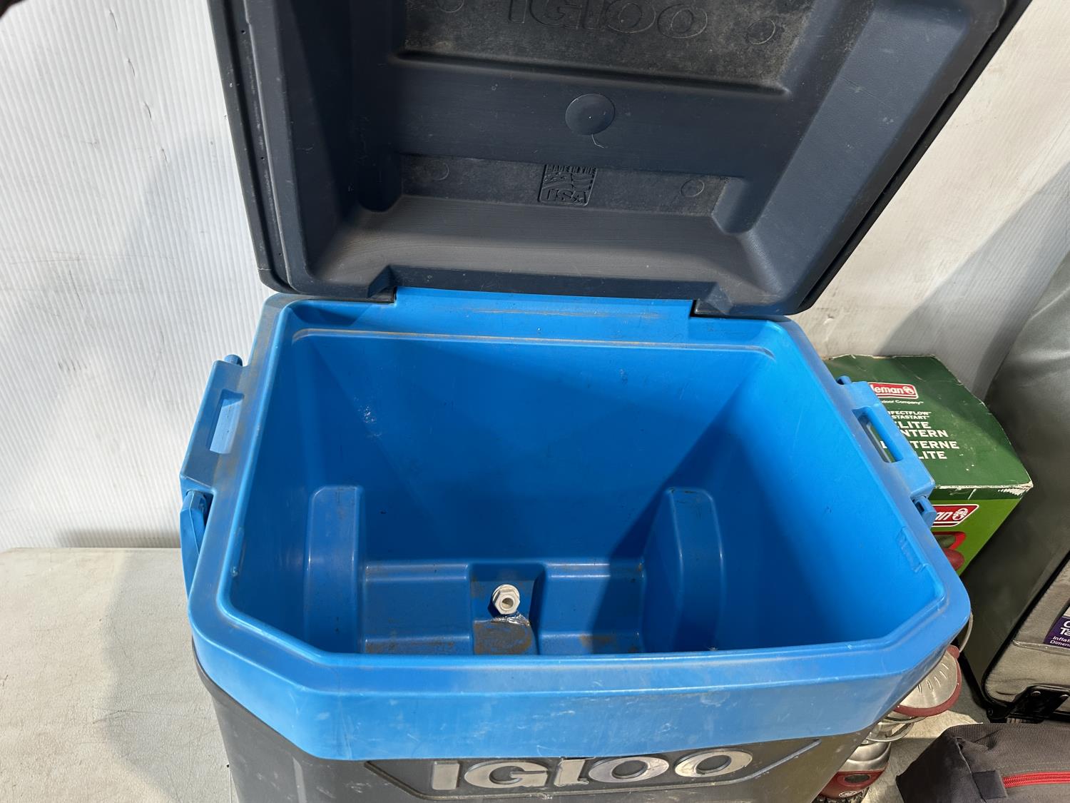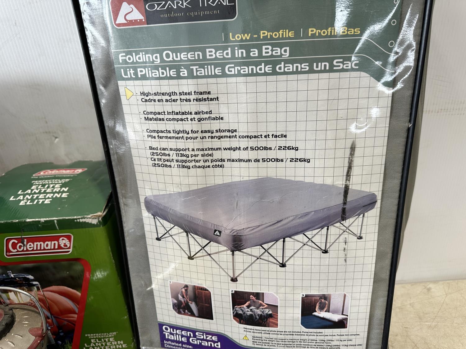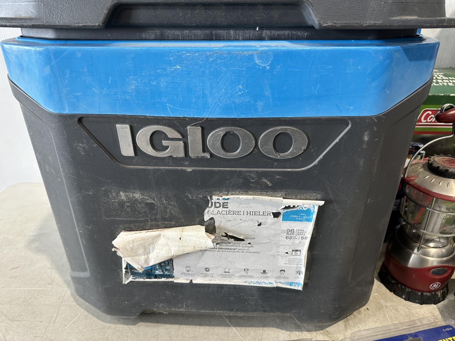 Igloo cooler, folding queen bed in a bag, lantern, 2 person tent, CO/smoke alarm, tent pegs