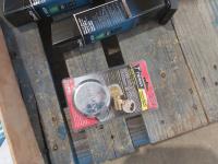 (2) axle stands, RV grill rack for BBQ, (2) 6000 lb tow hitch, Atwood cast iron cookware, portable campfire, Shurflo fresh water pump, trailer lock