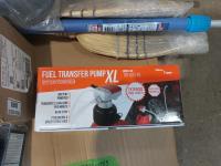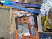 3 ply disposable face masks, (2) brooms, (2) extendable handles, griddle tool kit, fuel transfer pump, (6) lighters, hitch safe storage lock, micrometer