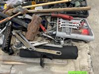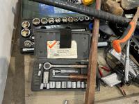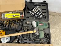 Sockets, wrenches, sledge hammer, hatchet, drill bits