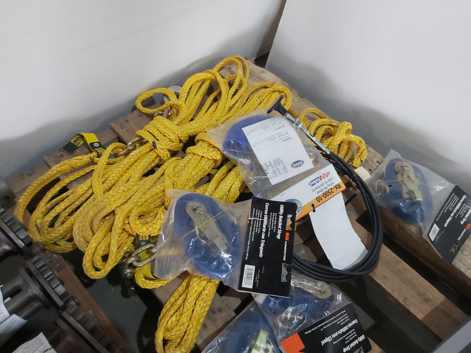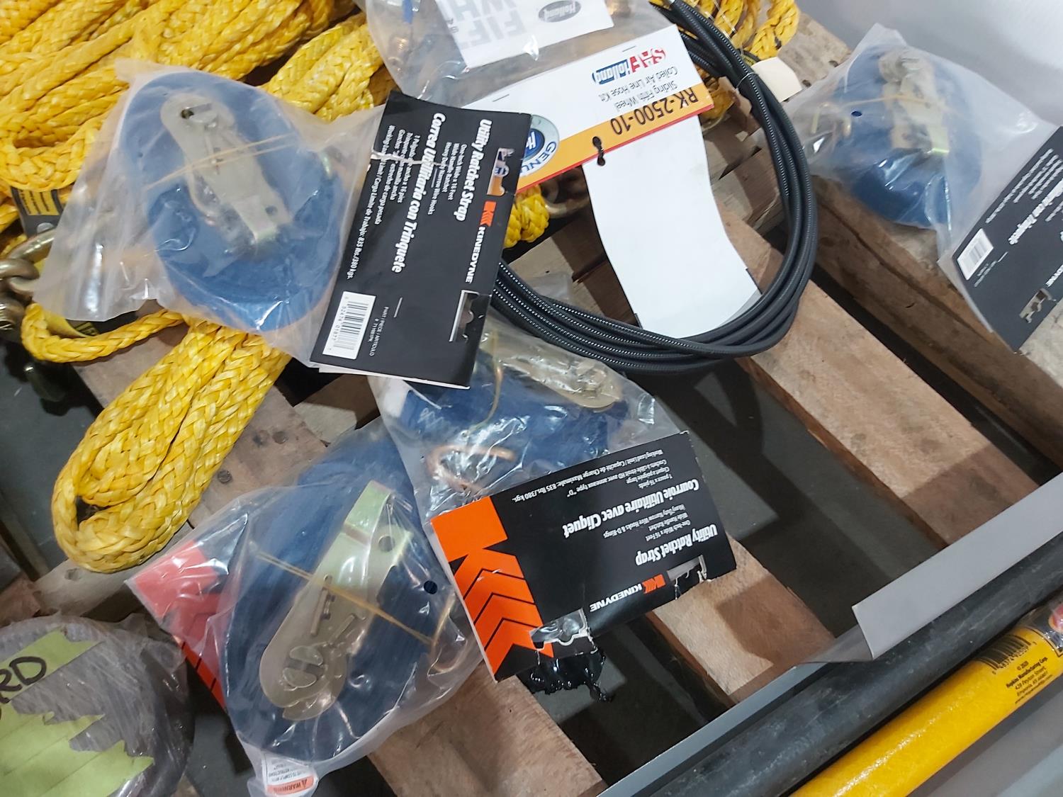 (4) 16 ft ratchet straps, (7) slide ratchets, 5TH wheel airline hose kit, (4) nylon/ chain ropes, 70 inch fiberglass handle, (2) 4-1/2 inch x 21 inch steel U-Bolts