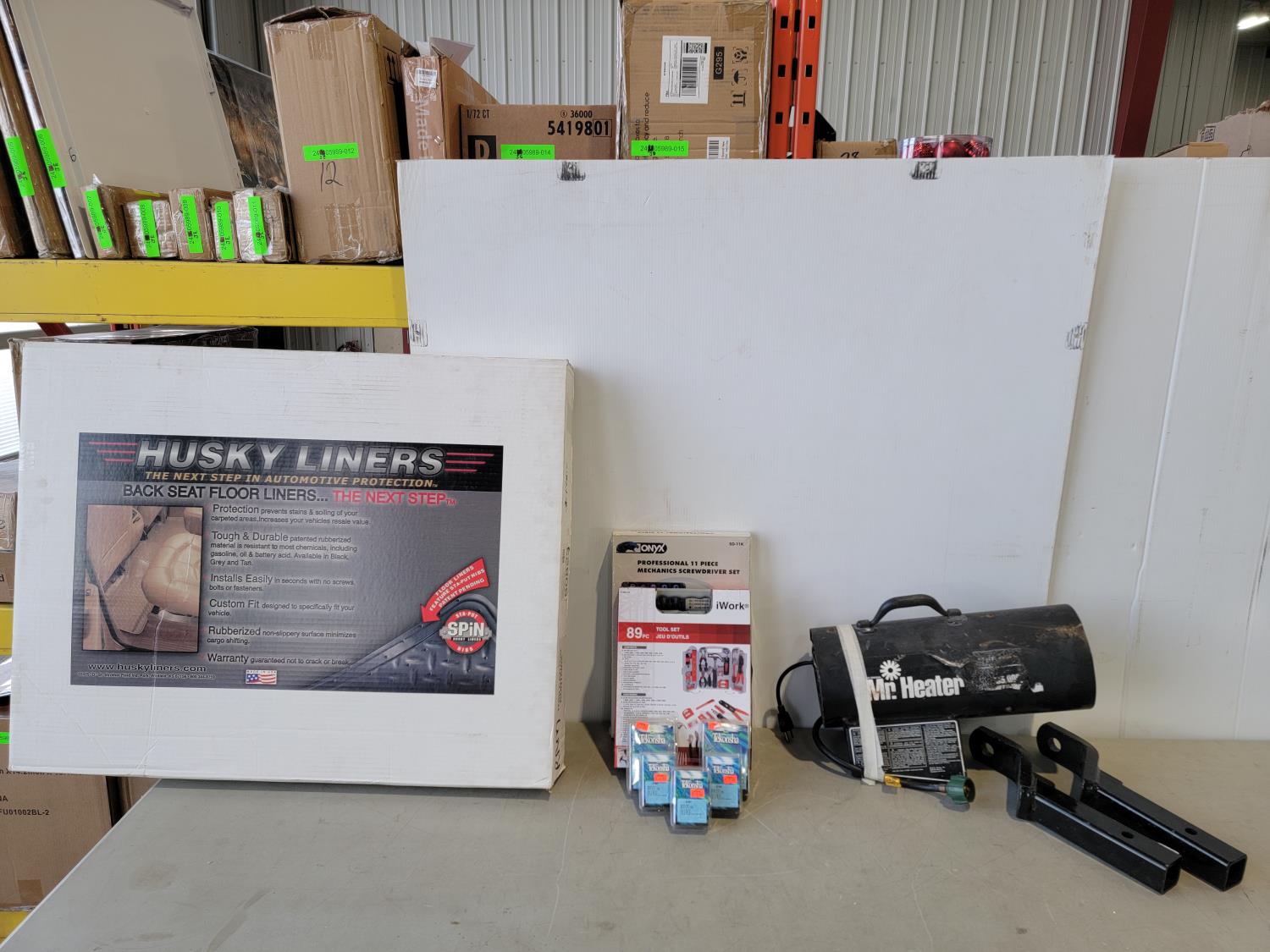 Husky Liners second seat floor liner fits 2009-2010 Dodge Ram 1500 crew cab, (3) 1/2 x 20 wheel bolts, (2) rim clamps, 89 piece tool set, 11 piece screwdriver set, Mr Heater 35000 BTU construction heater, (2) 4 inch x 10 inch 6000 lb hitch receivers