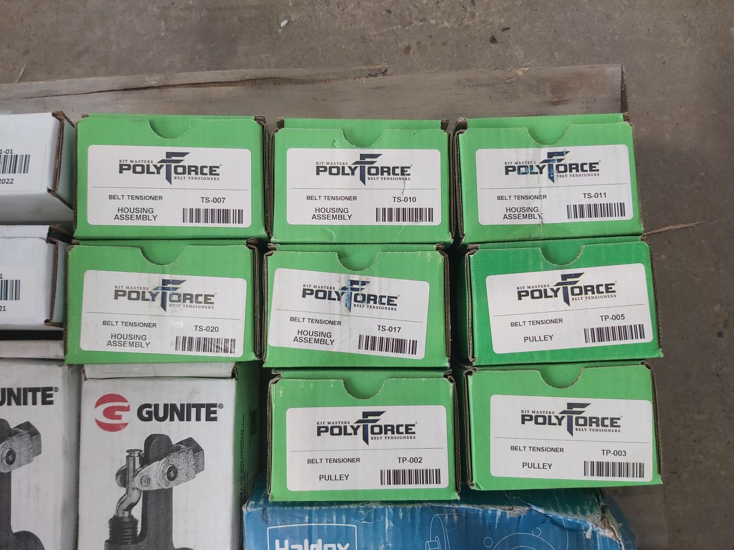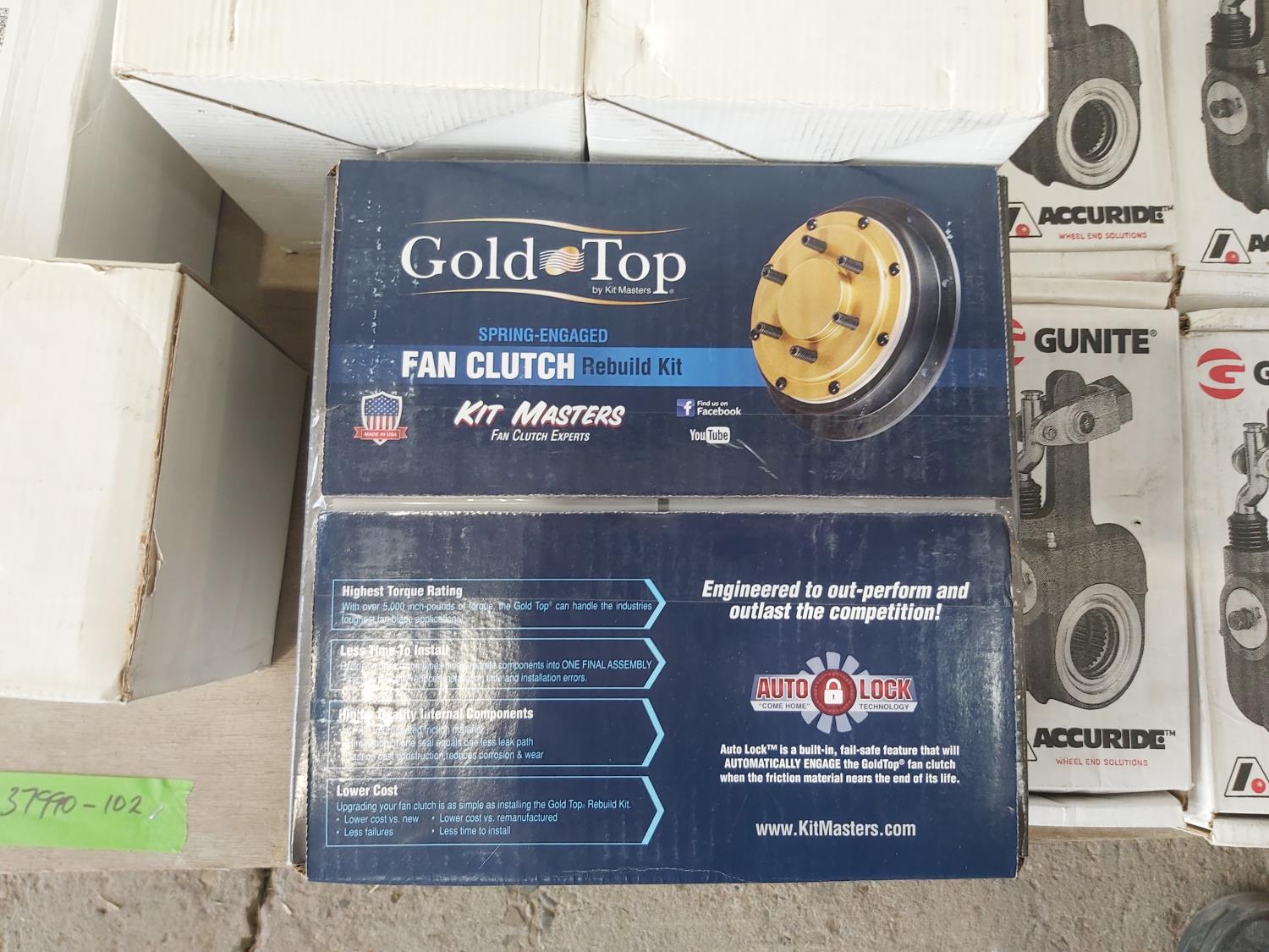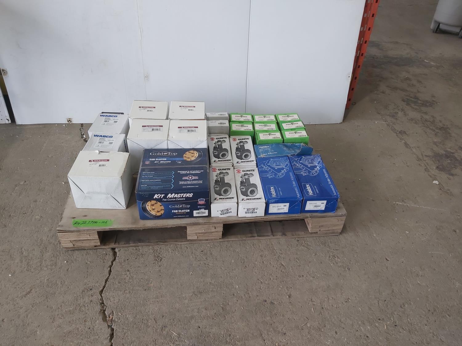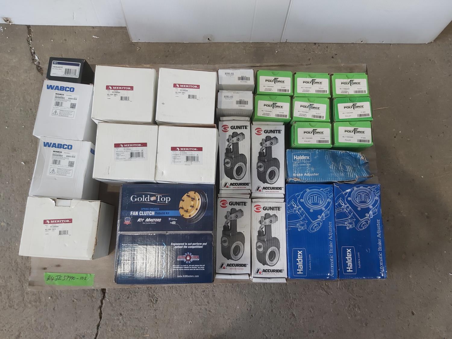 Fan clutch rebuild kit, (7) brake adjusters, (8) belt tensioner housing assemblies, (2) bearing kits, (7) air dryer cartridge kits, relay valve