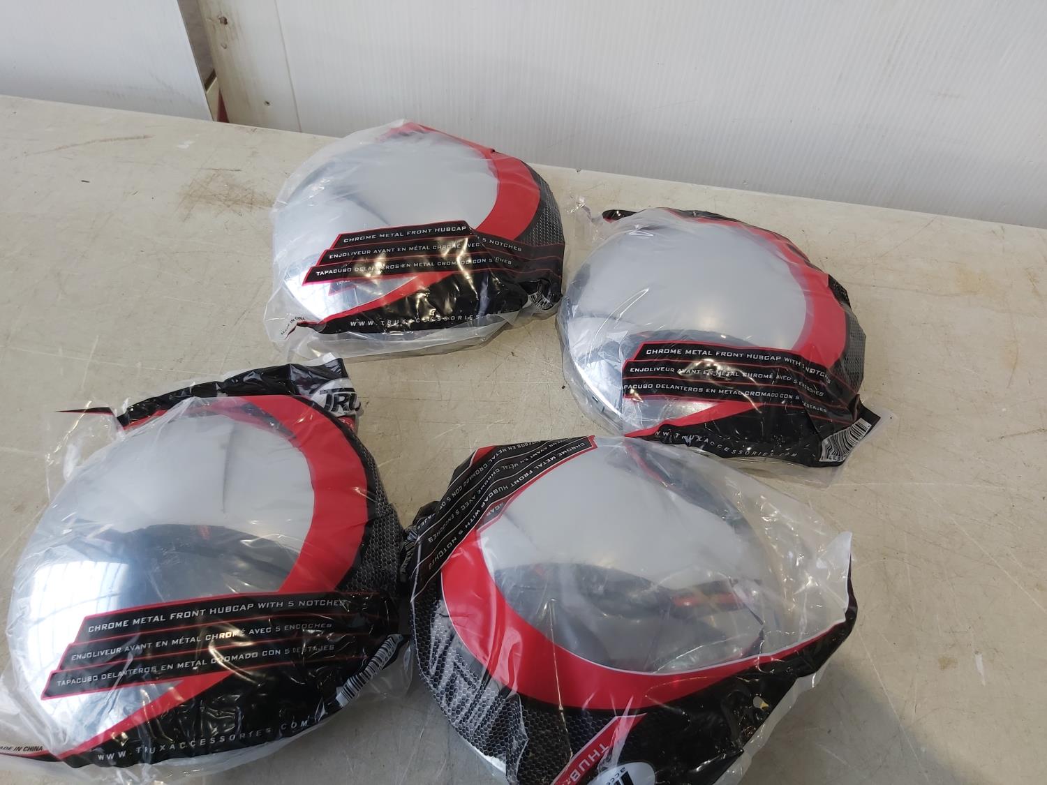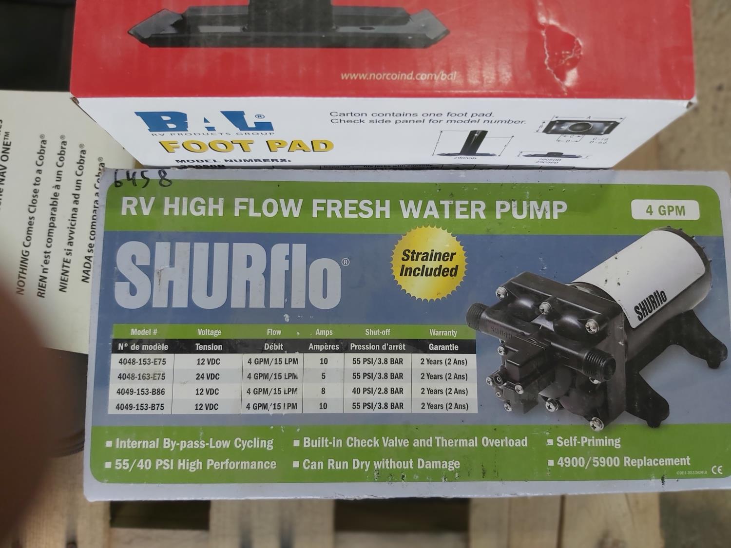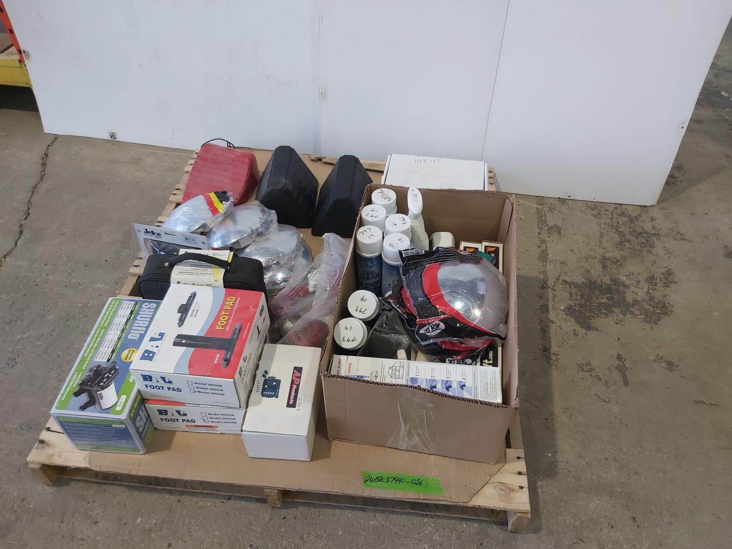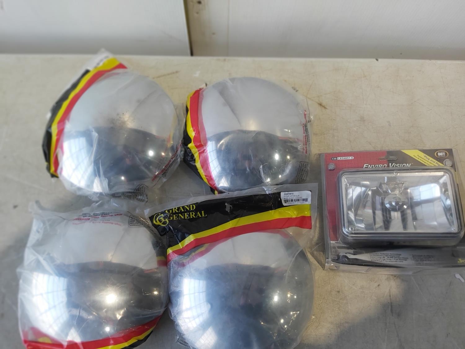(3) wheel chocks, (8) 8-1/2 inch chrome hub caps, LED head light, (2) 30A-50A Plug in, trailer lock, freshwater pump, 2 ft pads, brake shoe kits, cleaning supplies