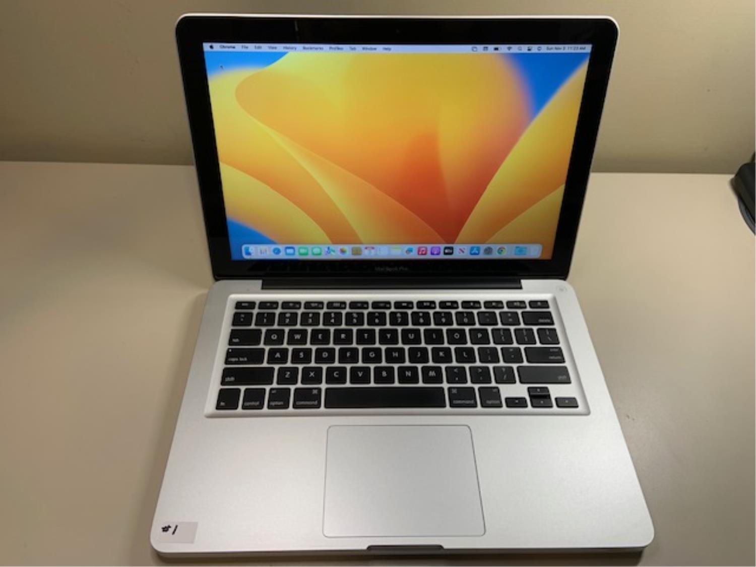 Intel Core i5-Dual Core, 2.5 Ghz, 500 GB Hard Drive, 8 GB RAM, Wi-Fi, Bluetooth, webcam, speakers, mic, thunderbolt, card reader, network port, 2 x USB, mini display Port 13 inch screen, Ventura OSCX, comes with power adapter,