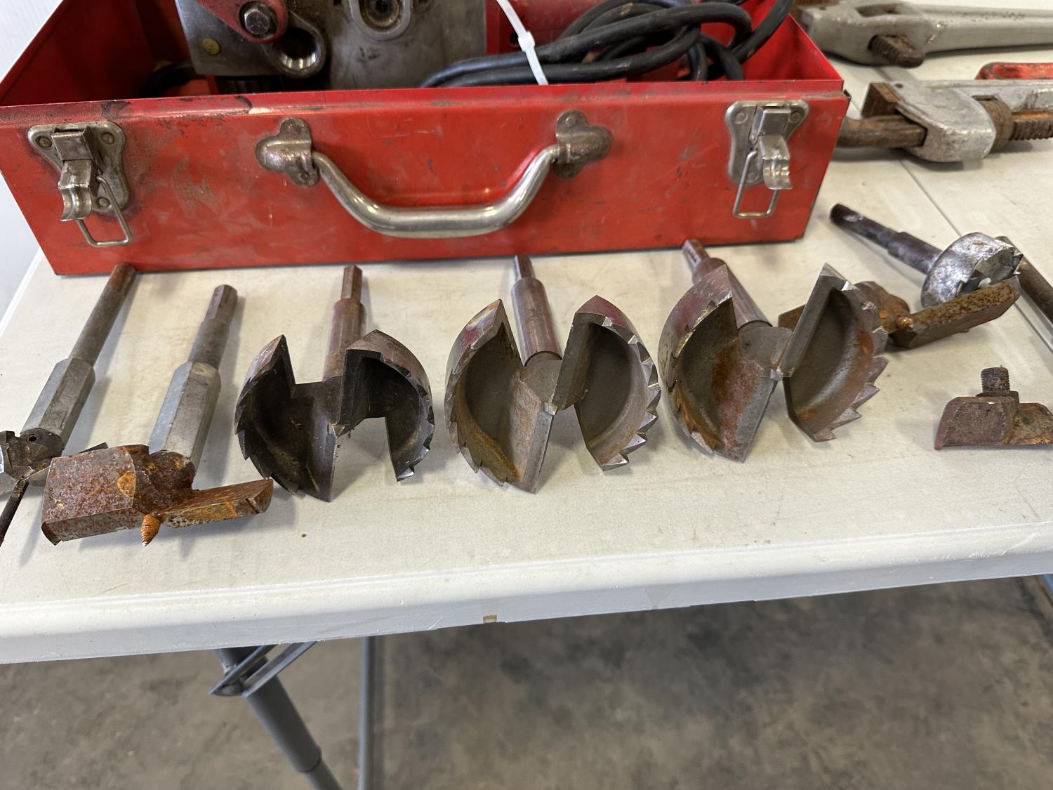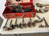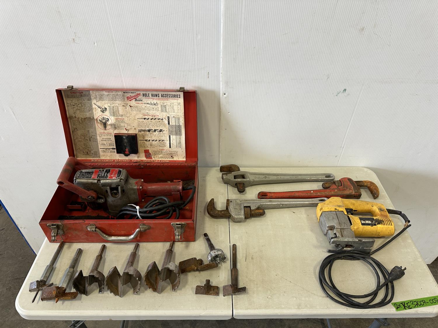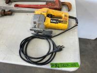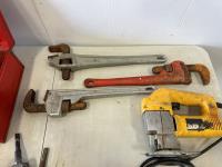 5118 Milwaukee Hole Hawg Drill (3) Ridgid Pip Wrenches, DeWalt Jig Saw