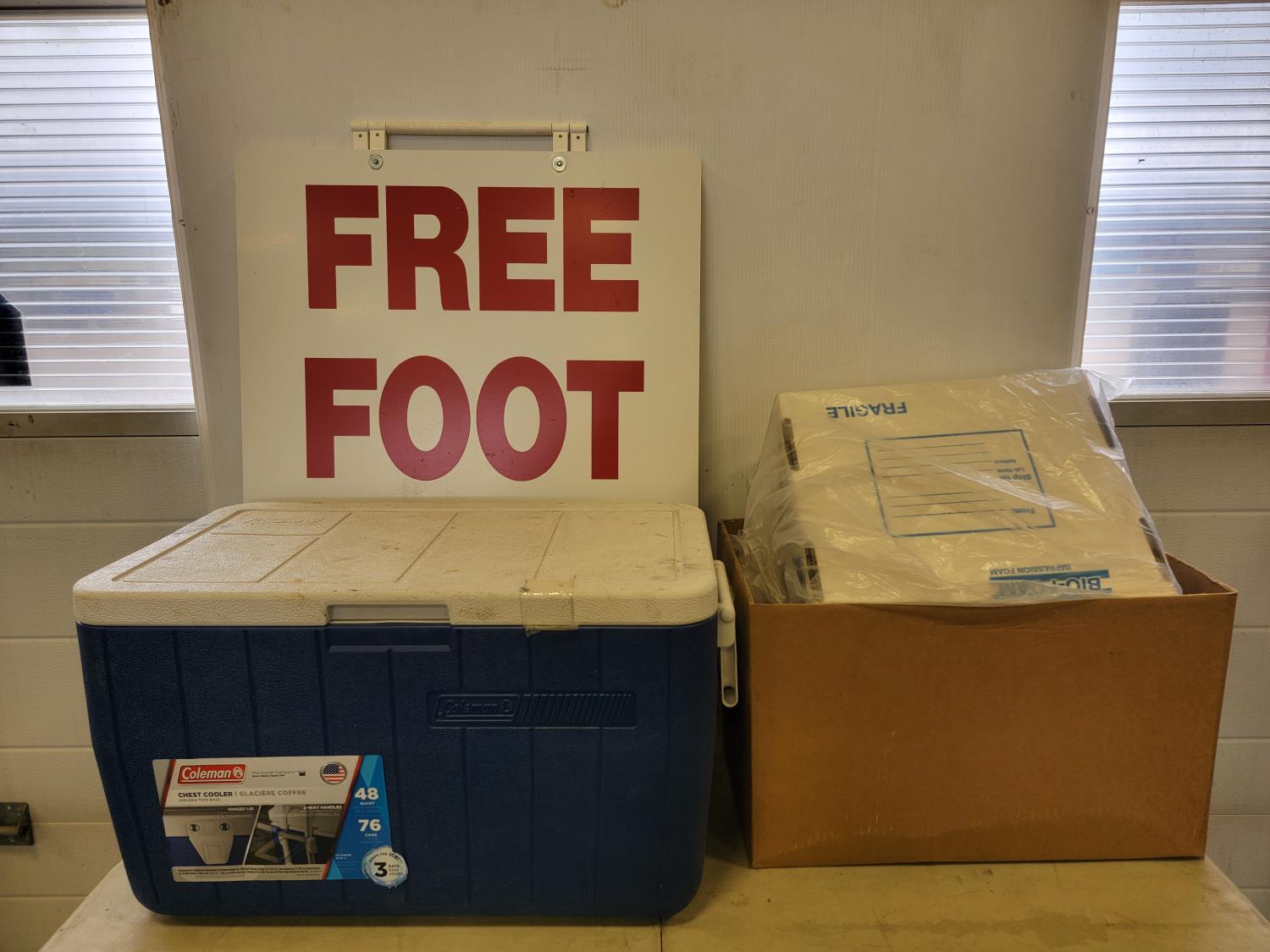 (1) 5 Gallon Coleman Cooler, (1) Sandwich Board Sign, Standard Compression Kit, Brannock shoe sizing Devices