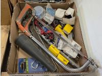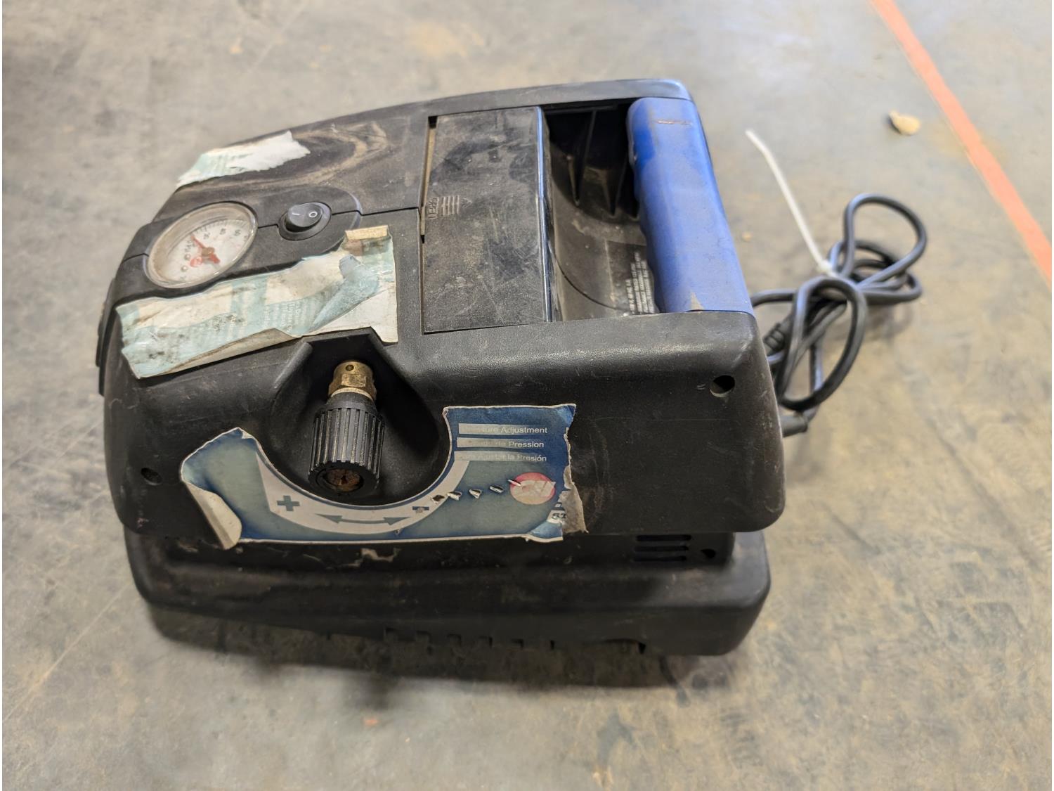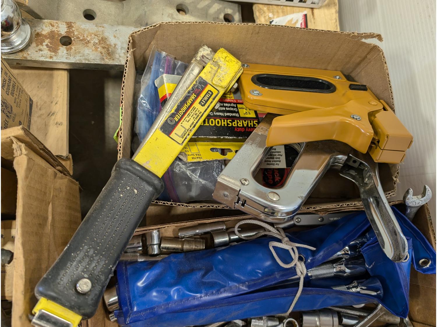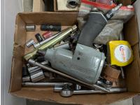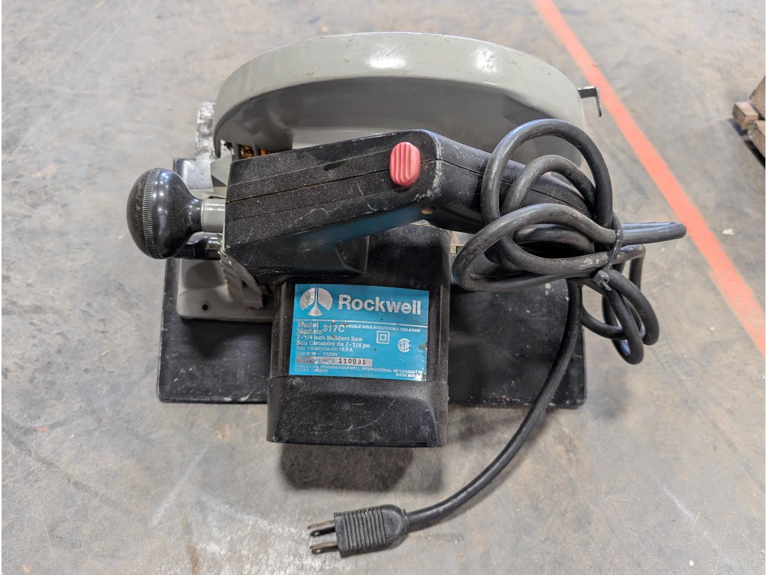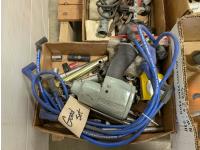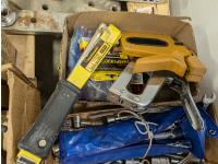 Campbell Hausfeld air compressor, Rockwell 7-1/4 inch circular saw, hand tools, staplers,