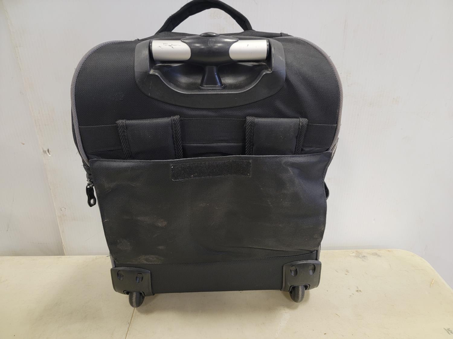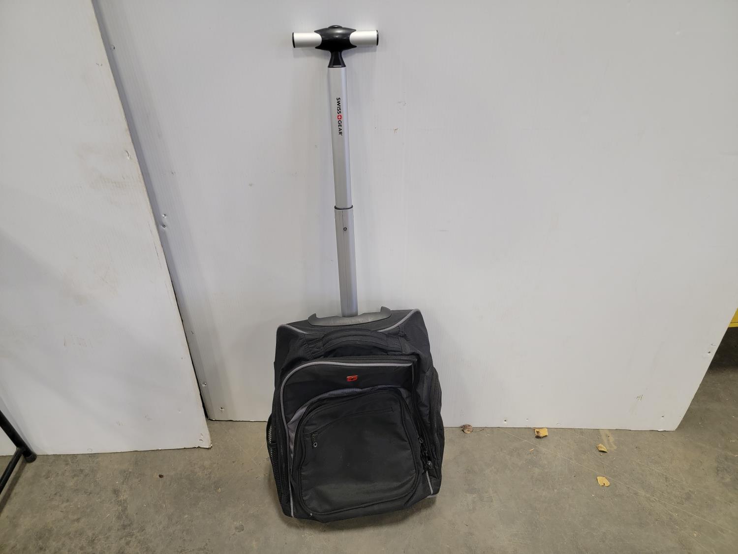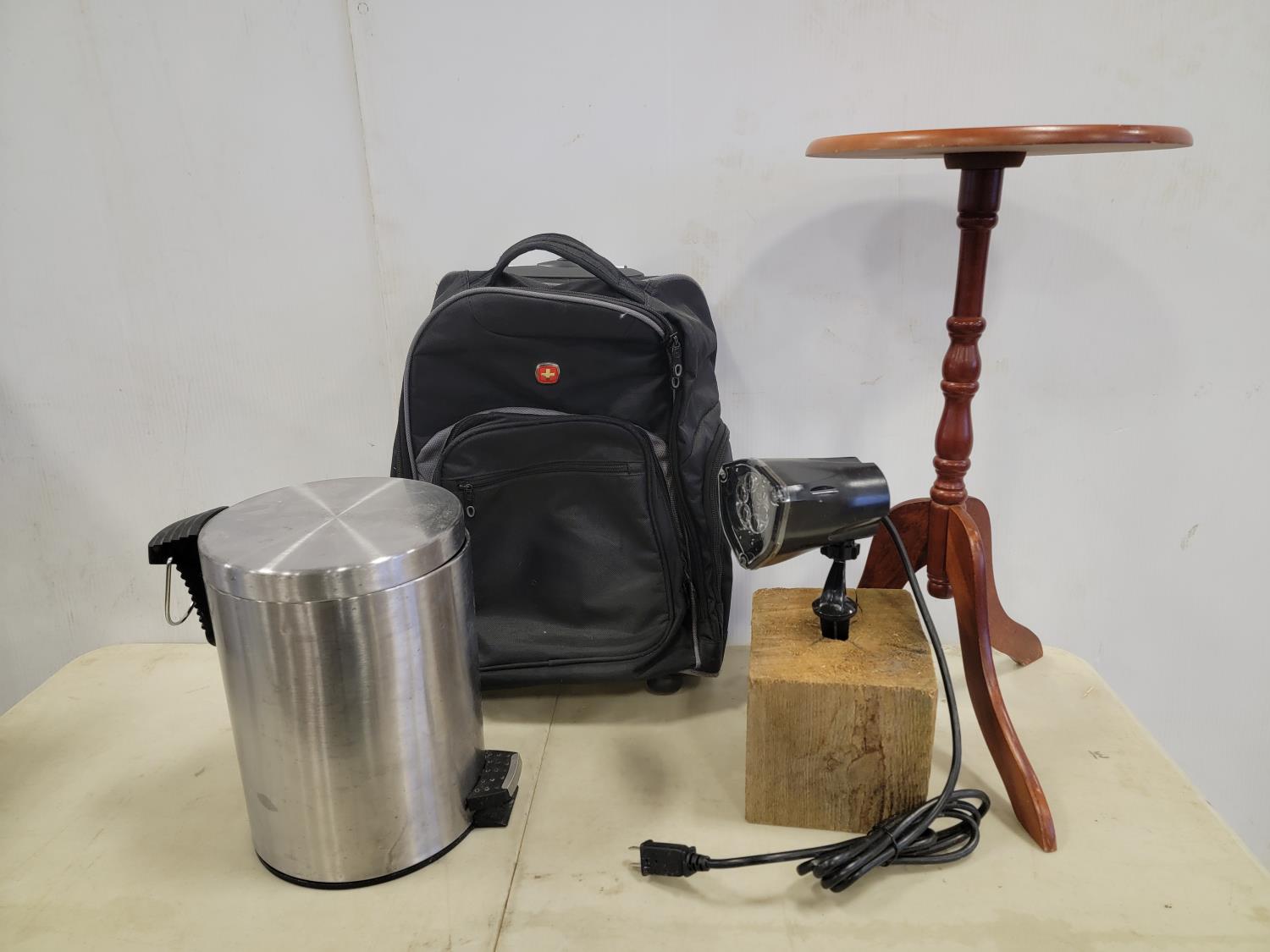 5340 Small Trash Bin, Strobe Light, Swiss Gear Carry On Luggage and Small Round Table