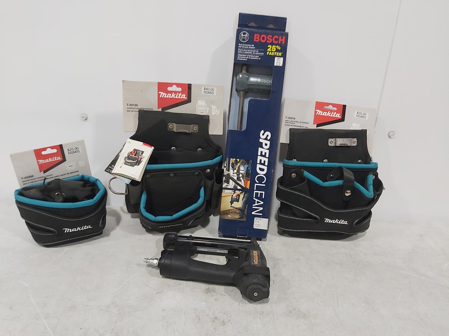 1614 Bosch Brad Nailer, Bosch Dust Extractor Bit, Makita Tool Belts (Unused)
