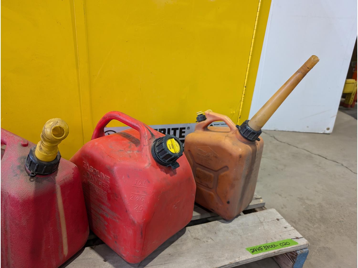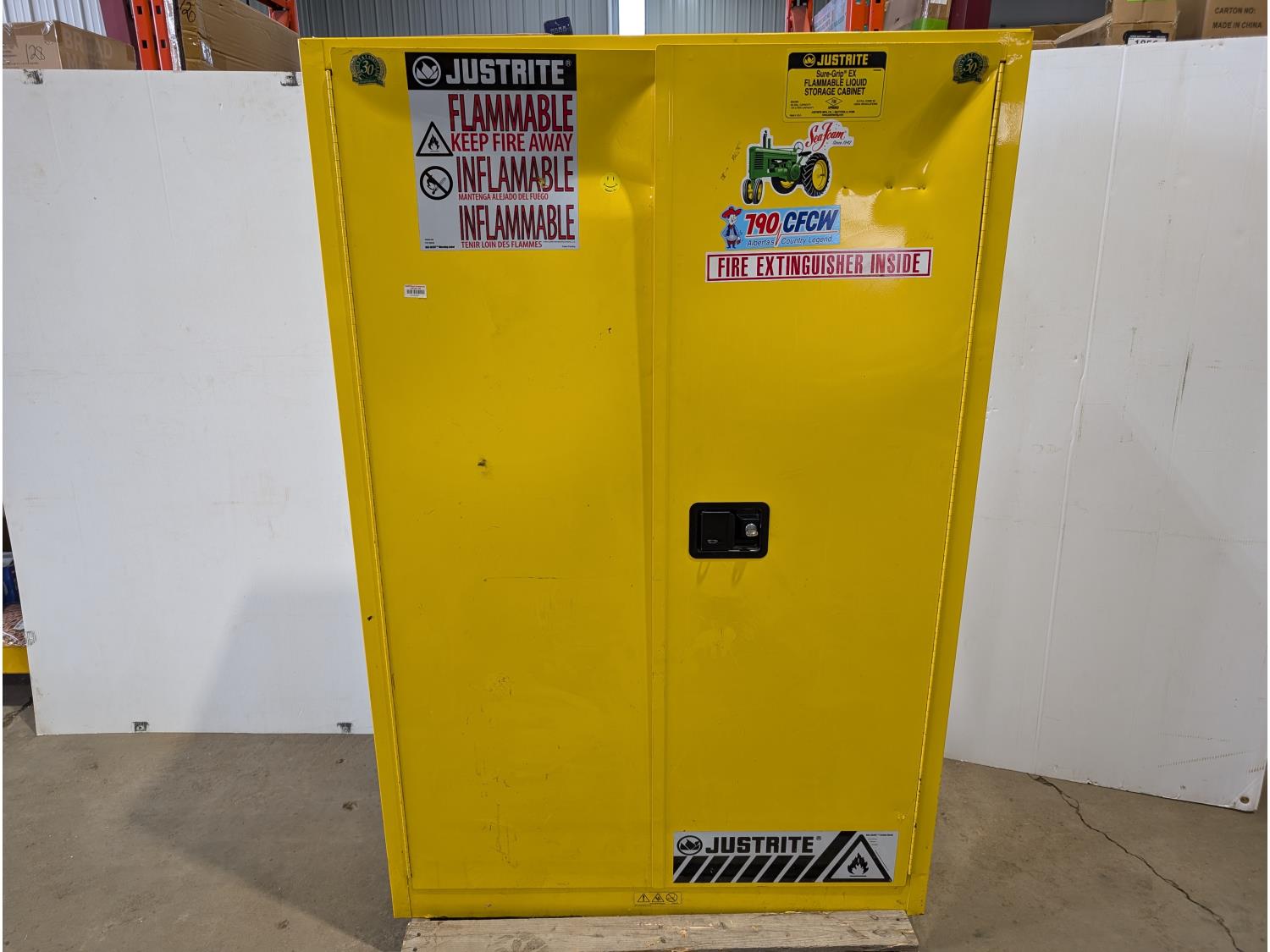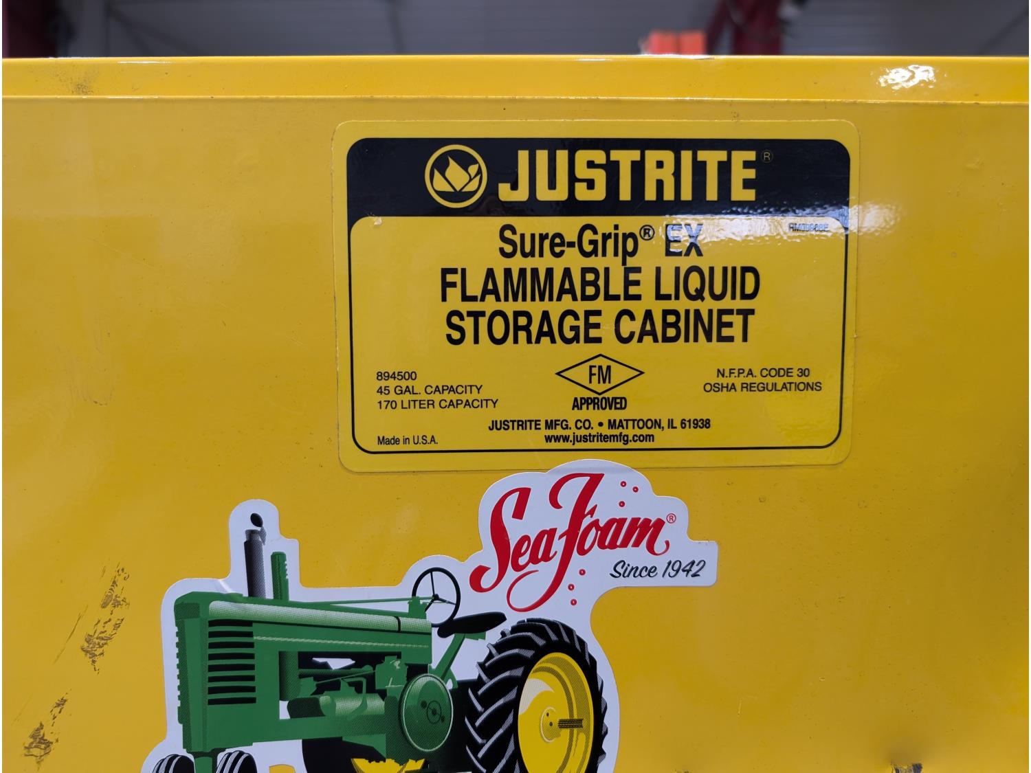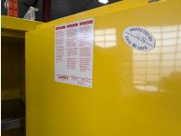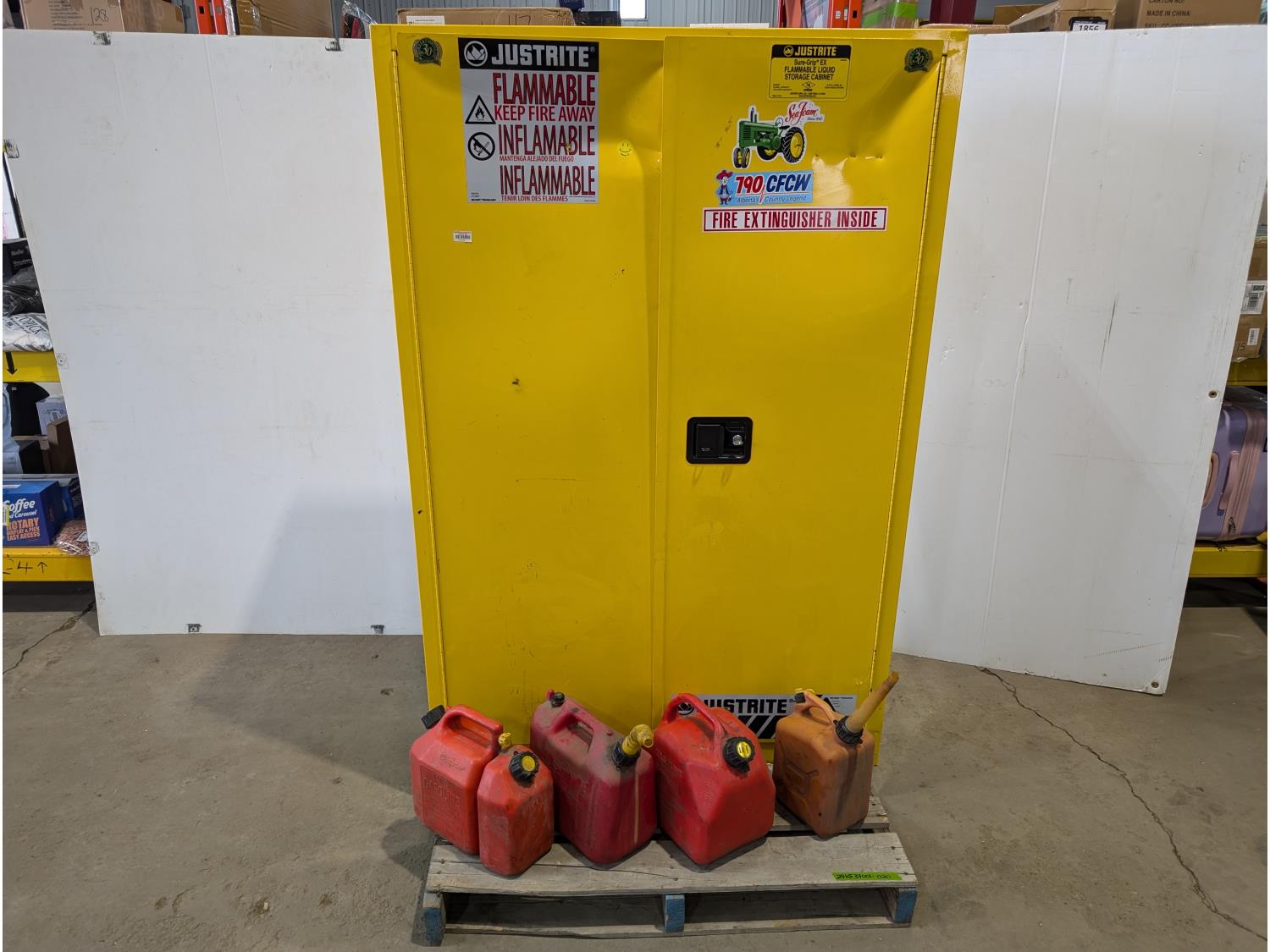 1362 Justrite Sure-Grip EX 45 Gallon Capacity Flammable Liquid Storage Cabinet and (4) Jerry Cans