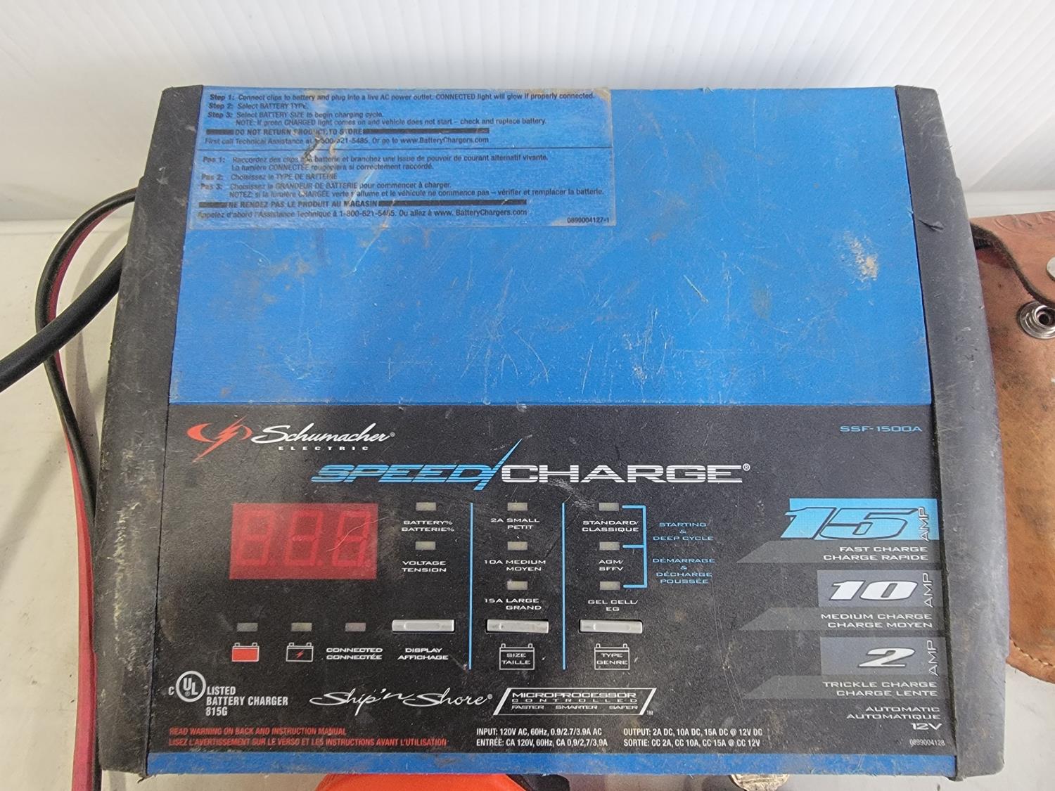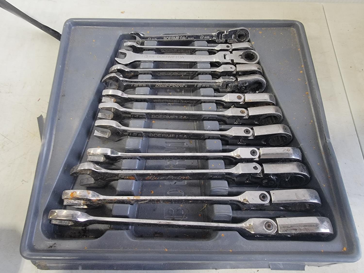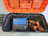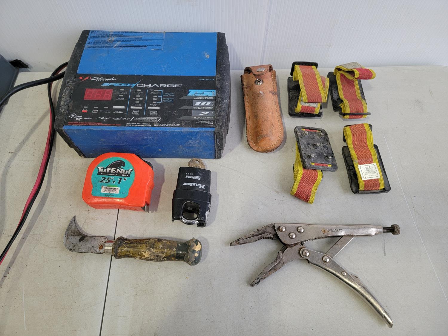 Metric wrenches, battery charger, measuring tape, vise grips, ice cleats