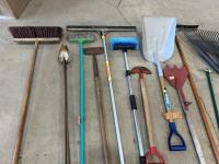 (3) snow shovels, (4) pitch forks, (4) brooms, (2) squeegees, grain shovel