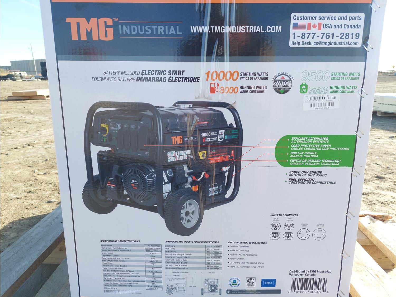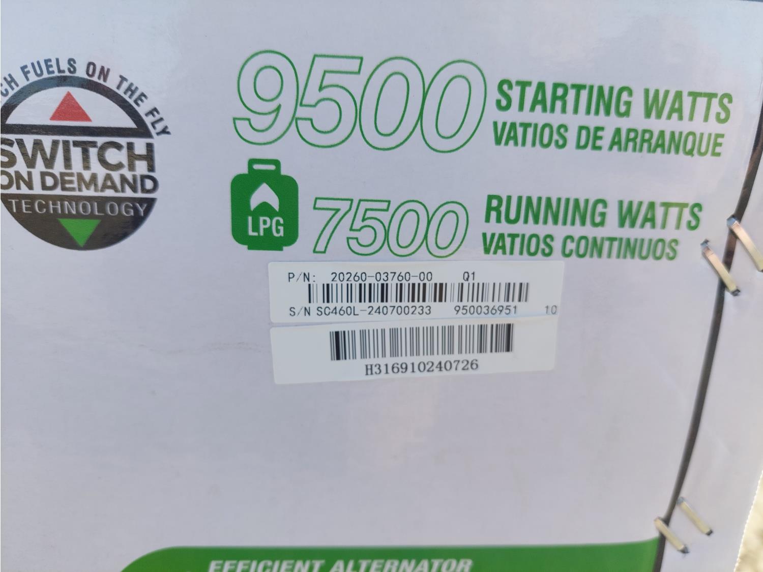 459 cc engine, (4) 120V 20A, (1) 120V 30A, (1) 120/240V 50A electric start