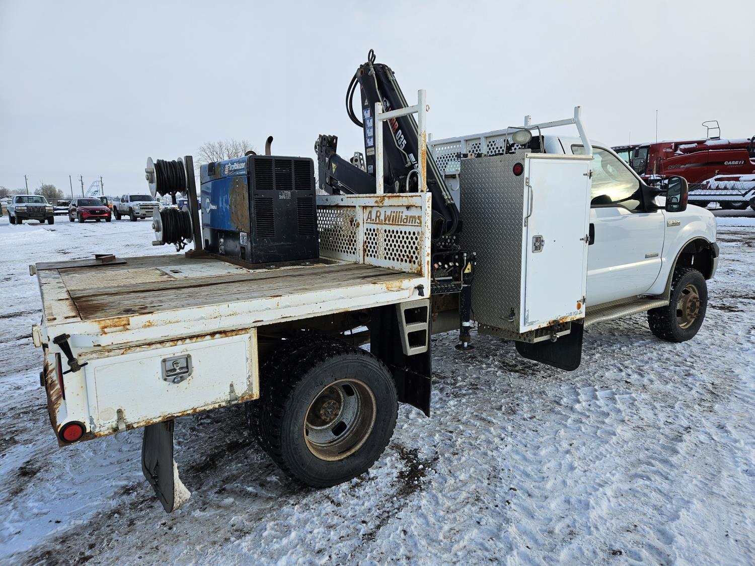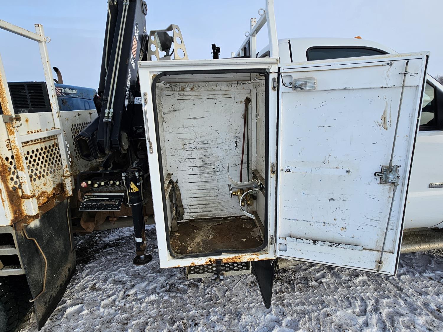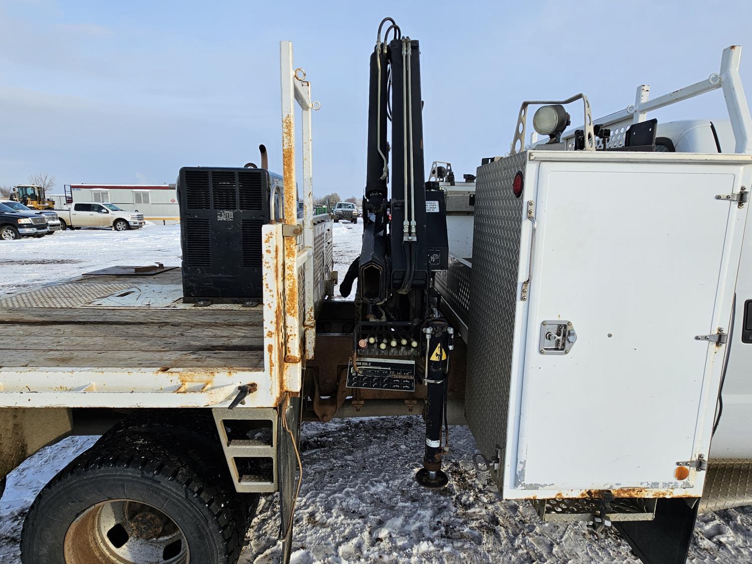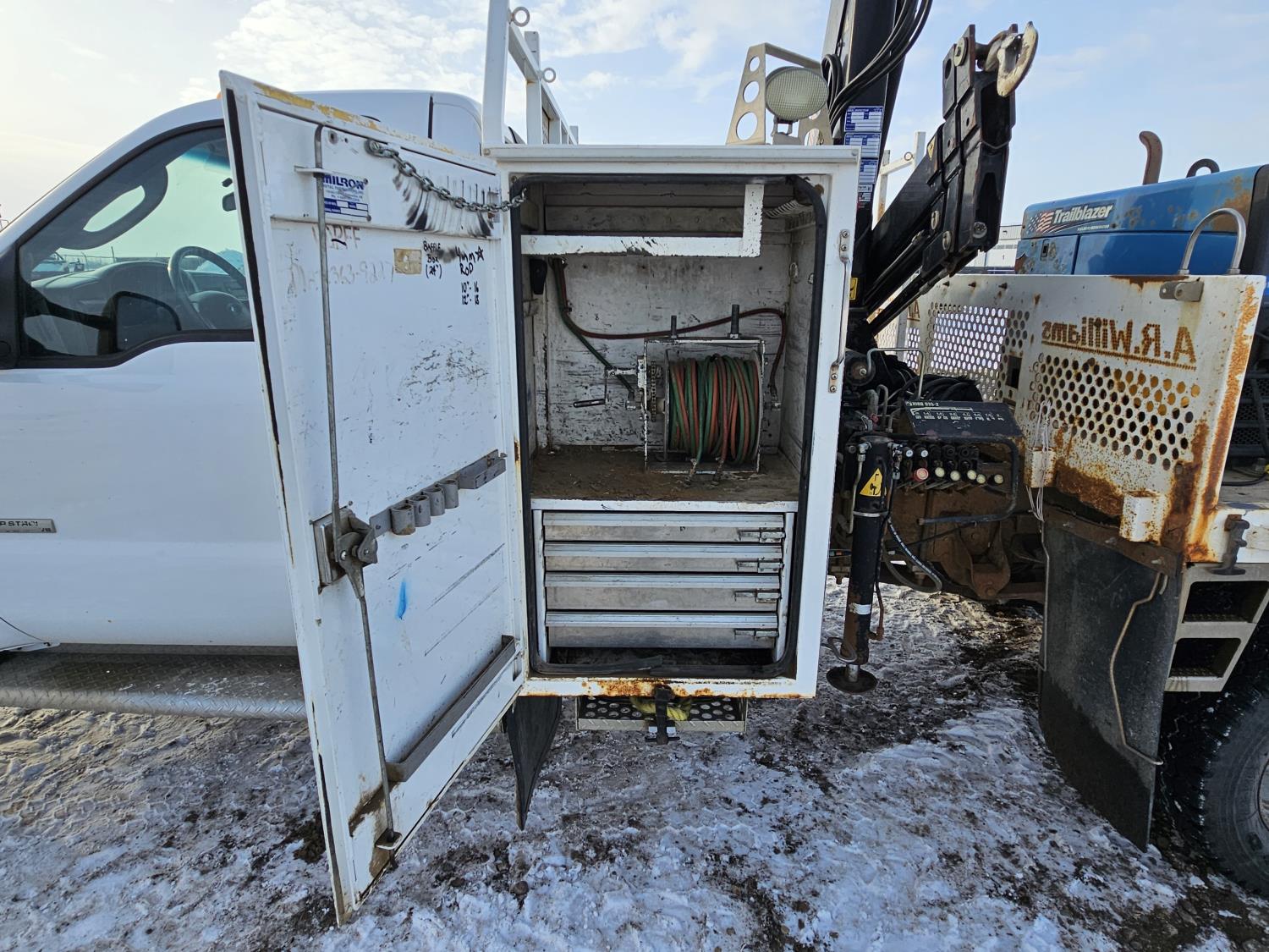 6.0 L V8 engine, electric engine block heater, manual transmission, A/C, cruise control, steel headache rack, steel tool boxes, Hiab crane, outriggers, Miller Trailblazer welder, 265/70R17 tires