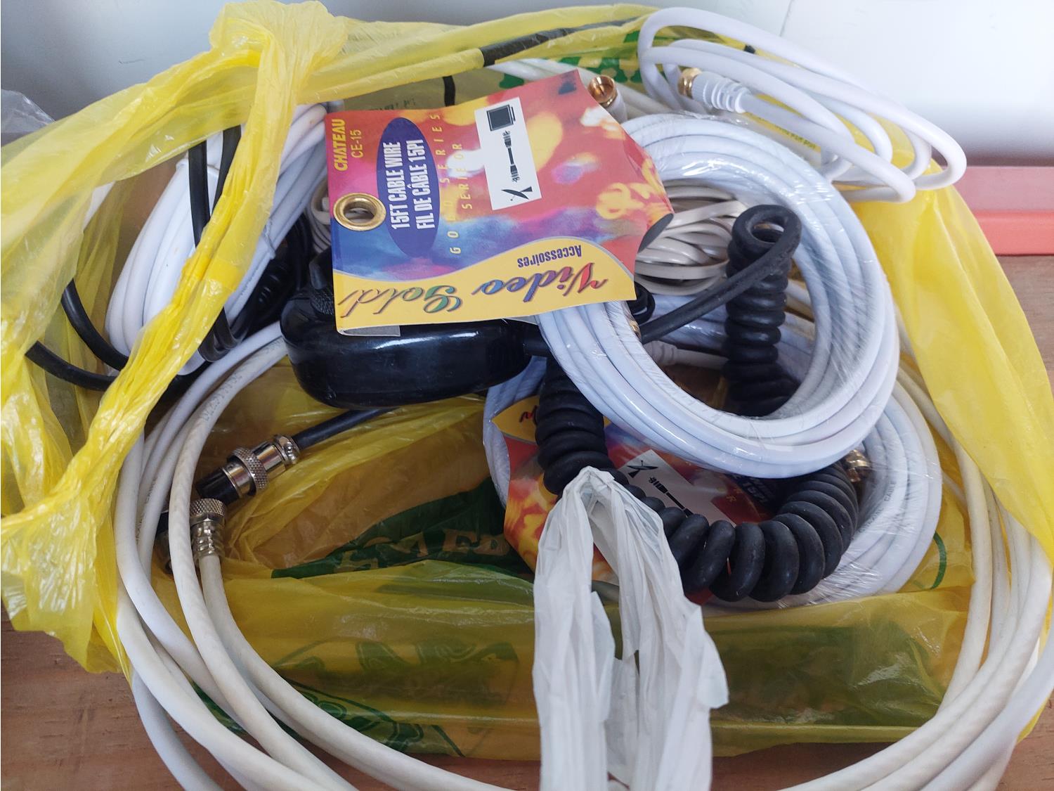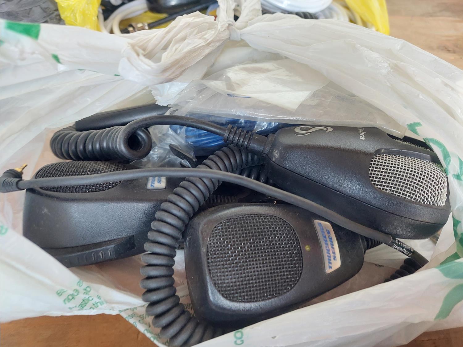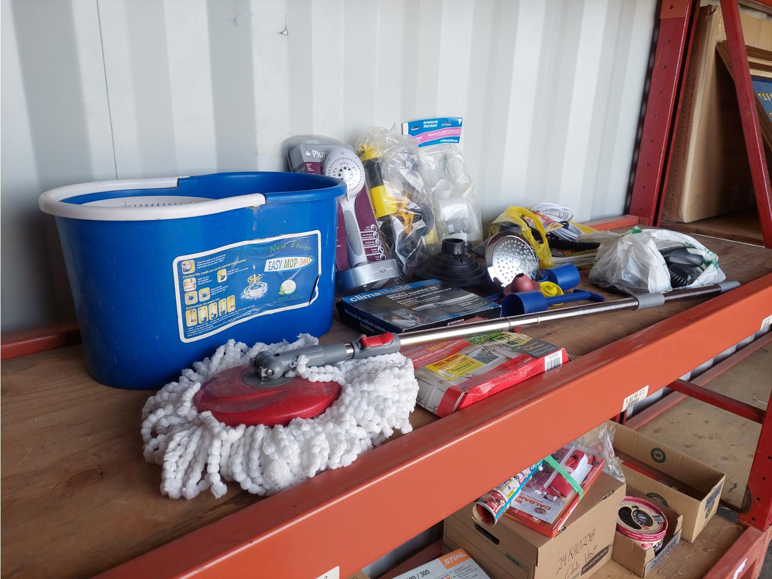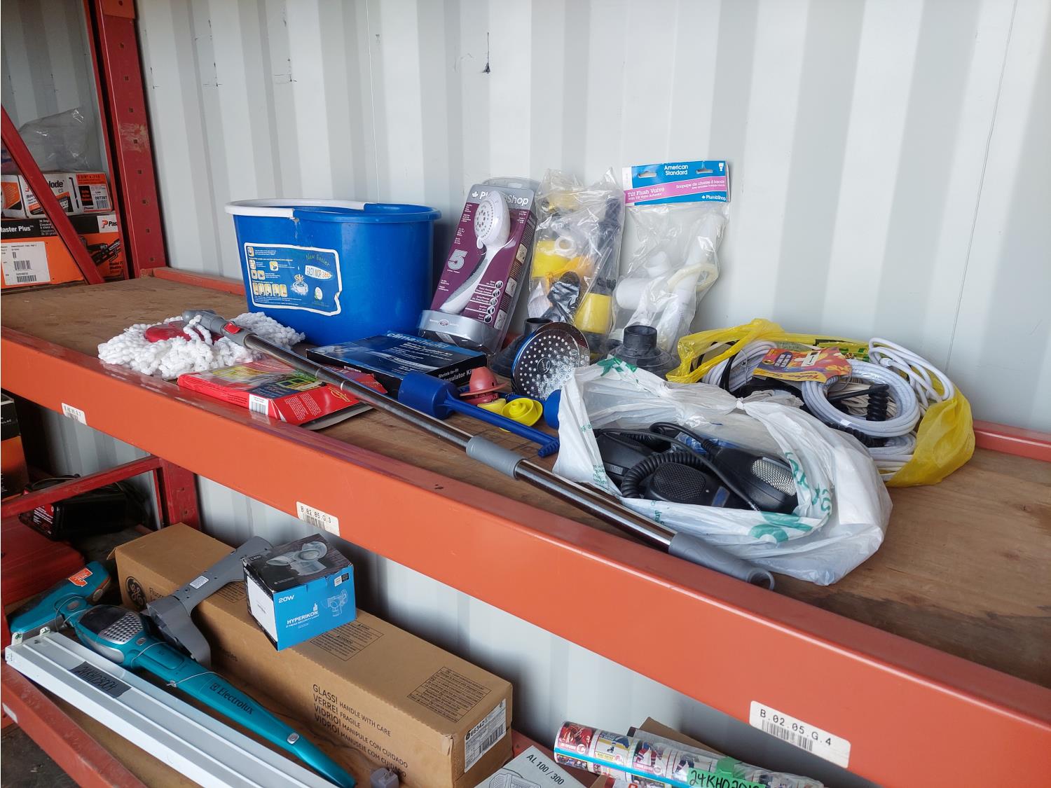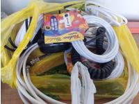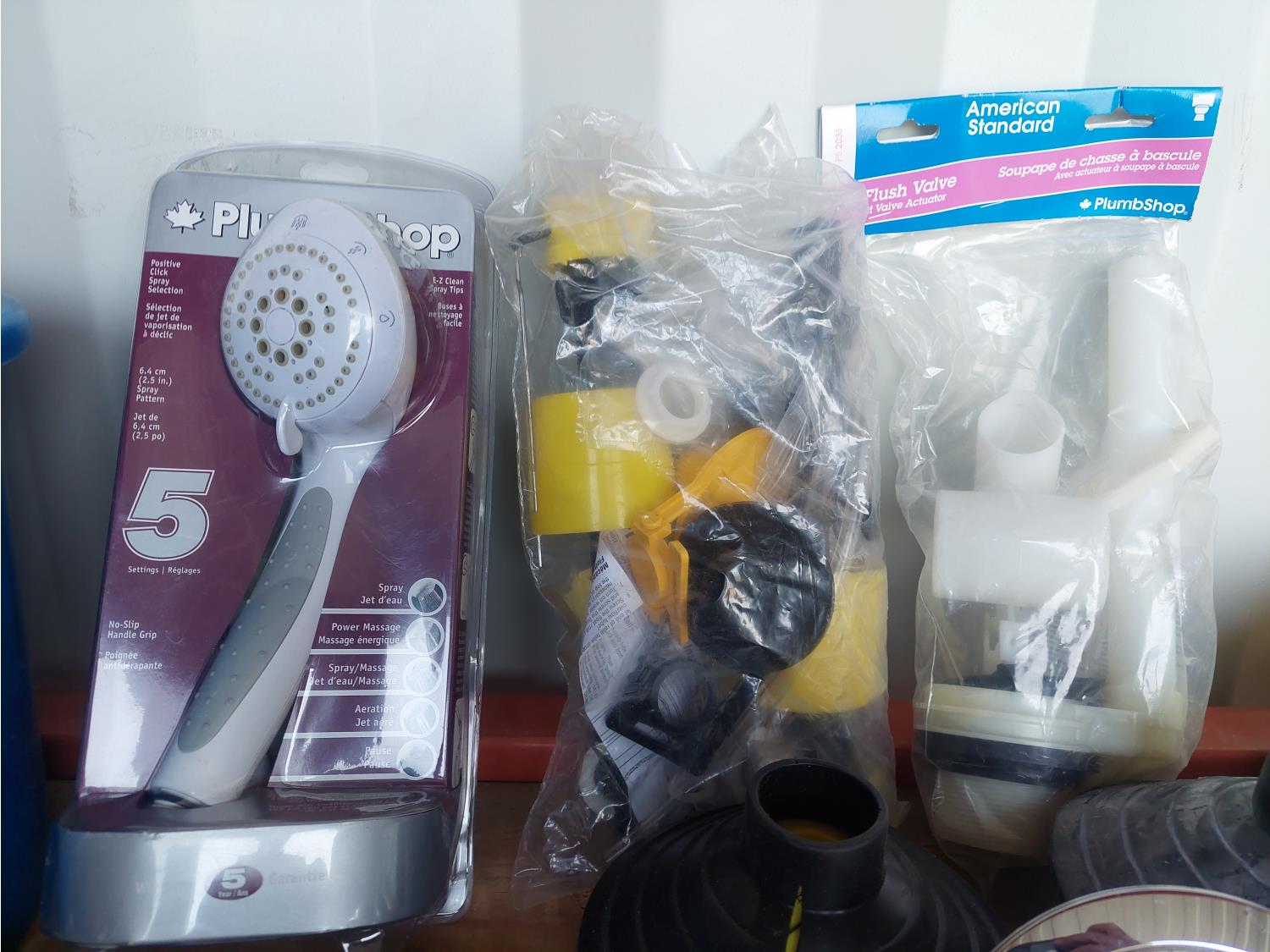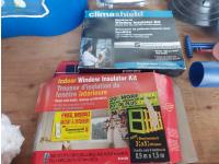 toilet tank parts, shower head, electrical cords, 2 way radio hand sets, and window film
