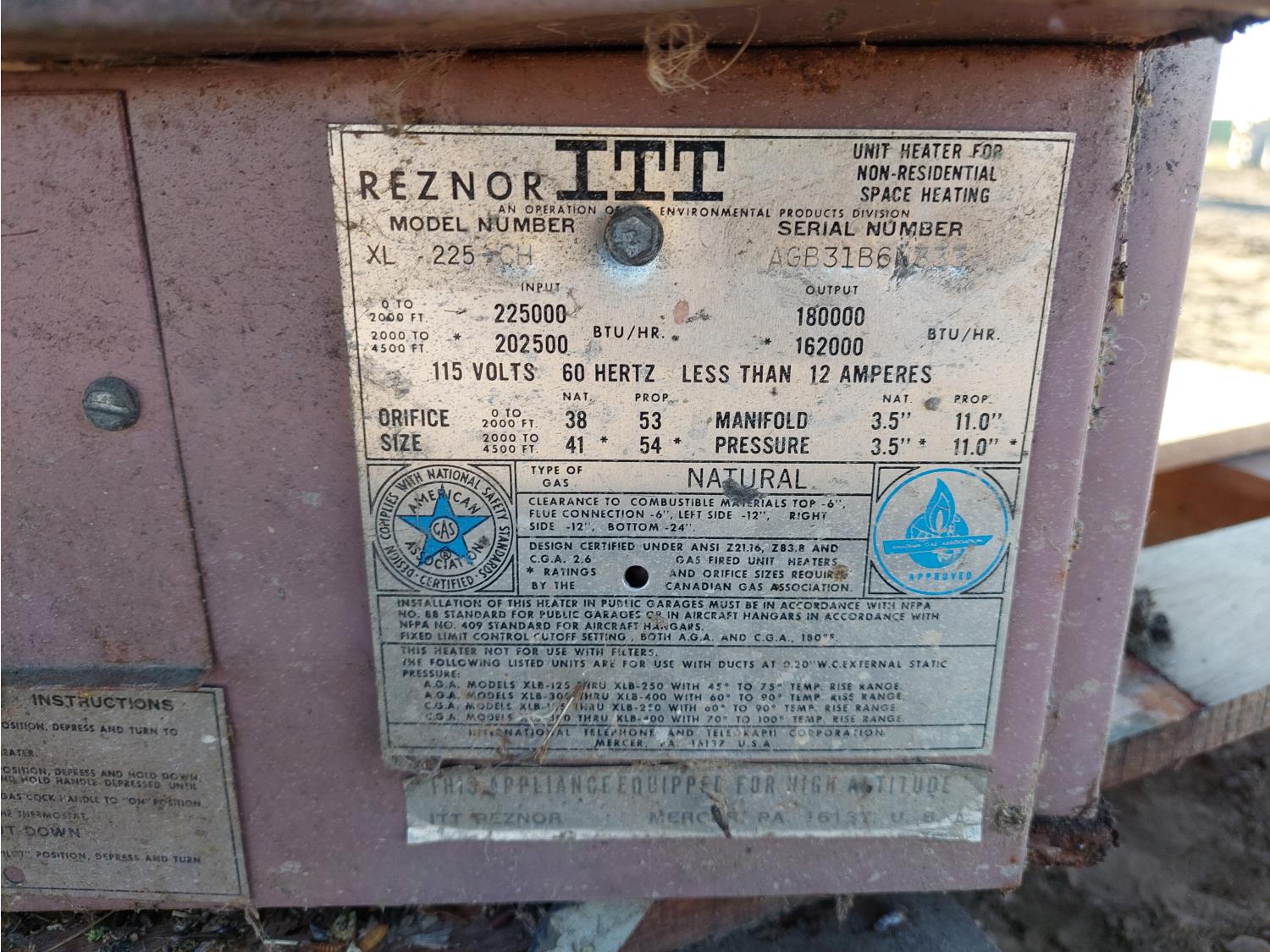 1116 Reznor XL 225 180,000 BTU Shop Furnace