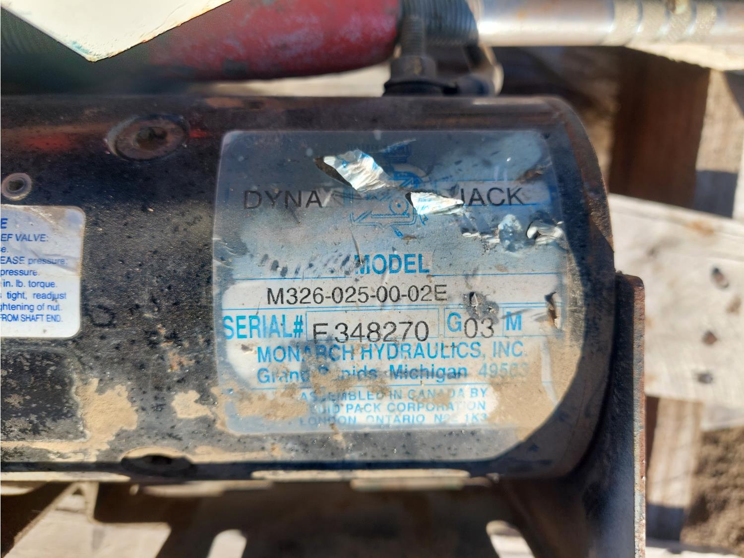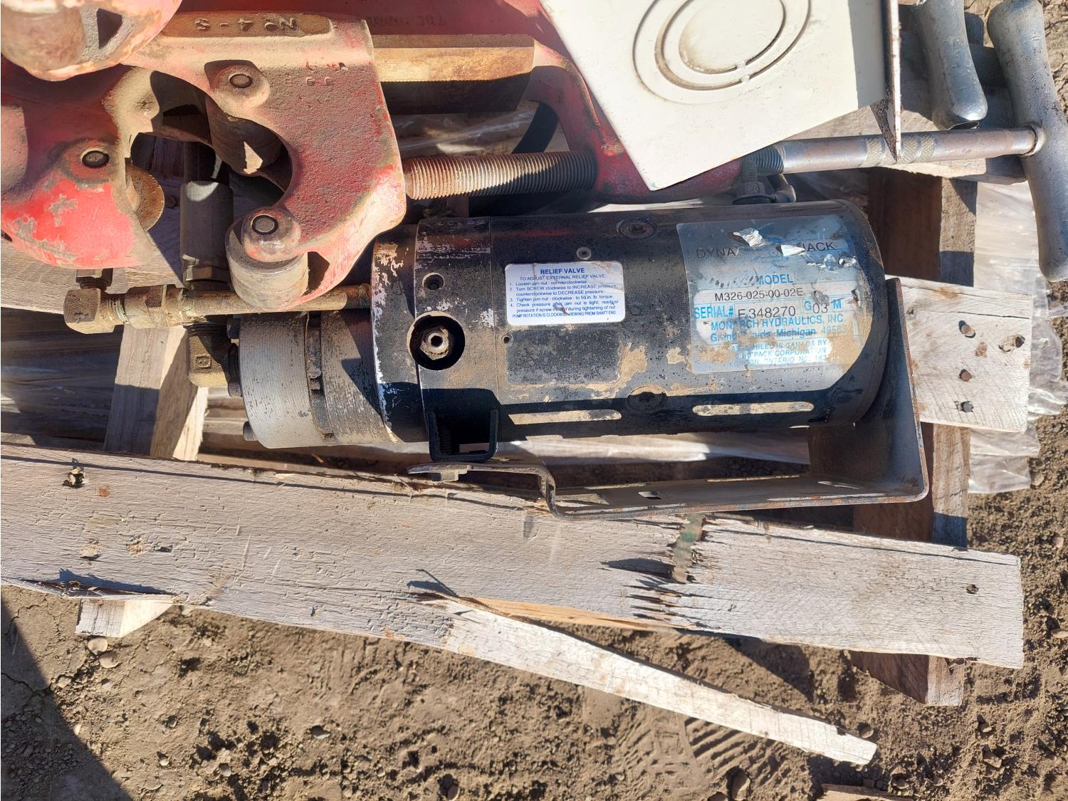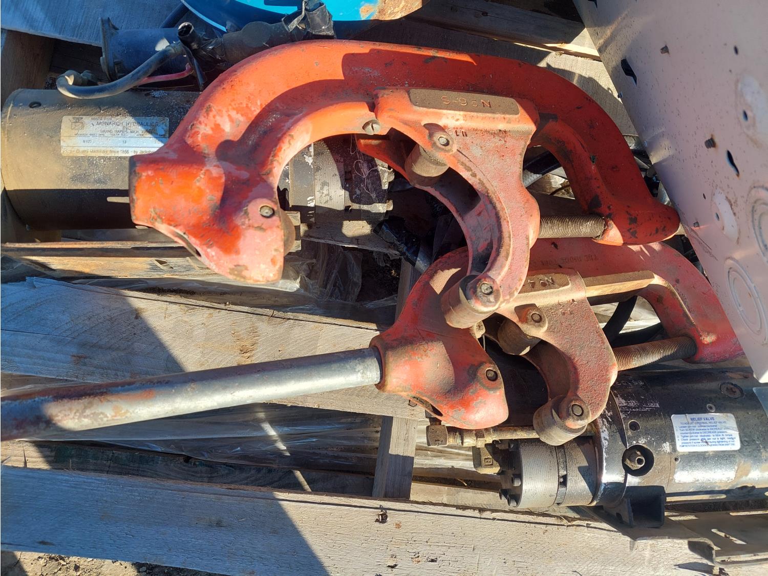 Dayton 1 HP, 230 V, single phase electric motor, (2) Dyna Jack hydraulic power units, Federal Pioneer breaker box, and (2) pipe cutters