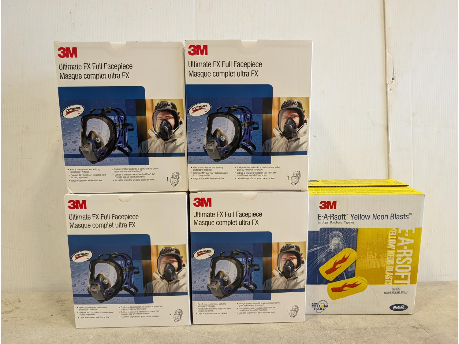 1982 (4) 3M Ultimate FX Full Face Masks and Box of 3M Ear Plugs (Unused)