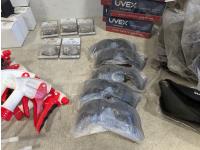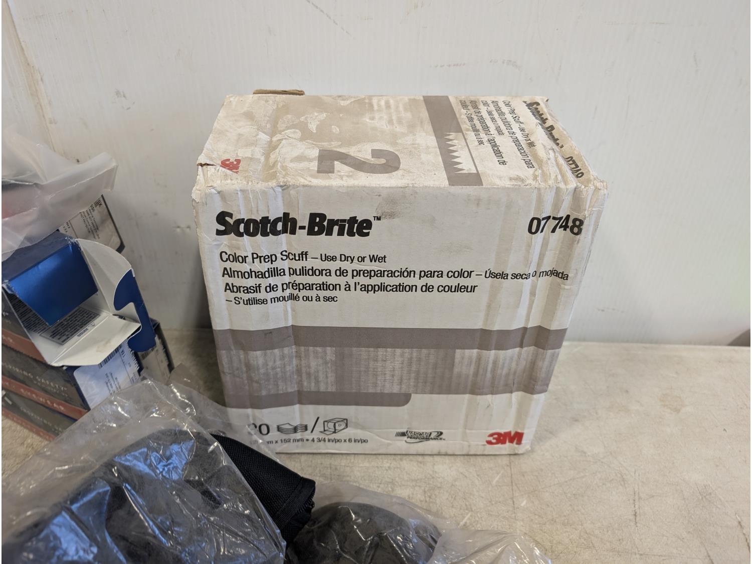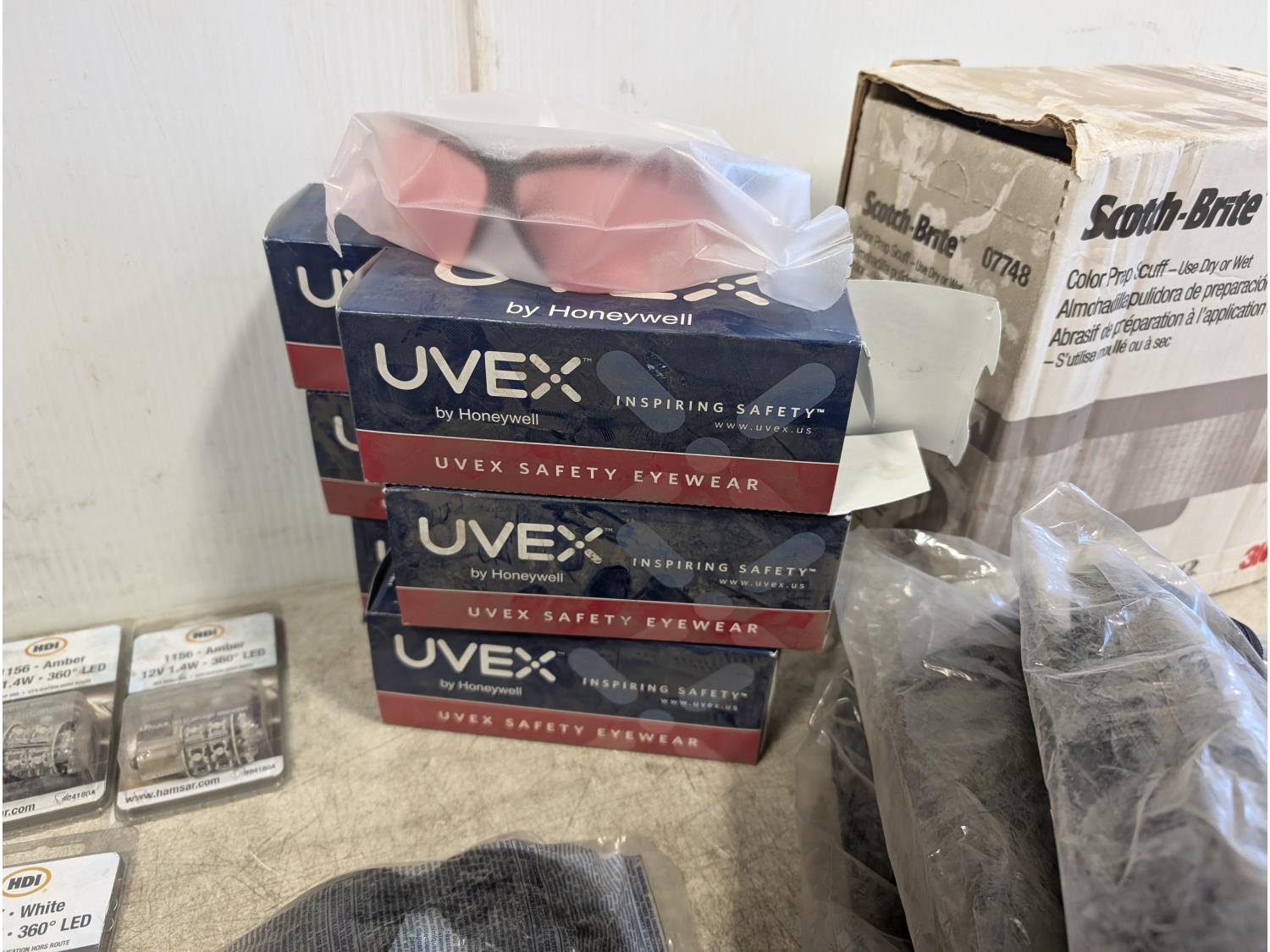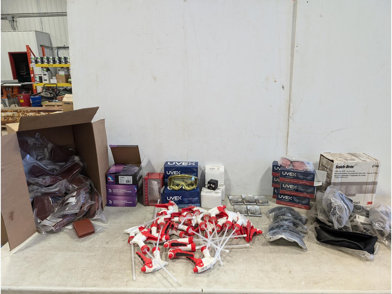 Scotch-Brite roll, (6) UVEX safety glasses, (6) Honeywell glasses pouches, (5) replacement lenses, (3) safety goggles, (50) 320 grit hook and loop 6 inch sanding pads, qty of 3 M rubber sanding blocks