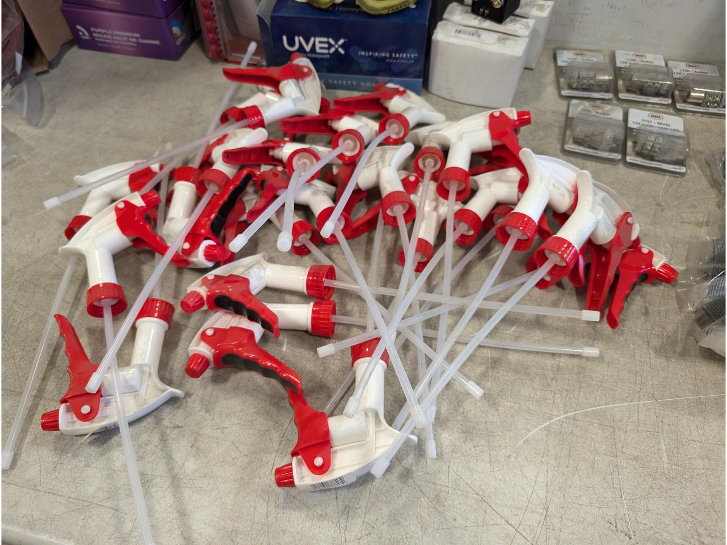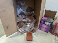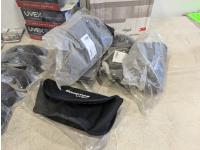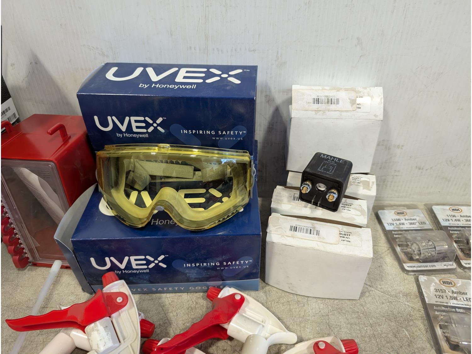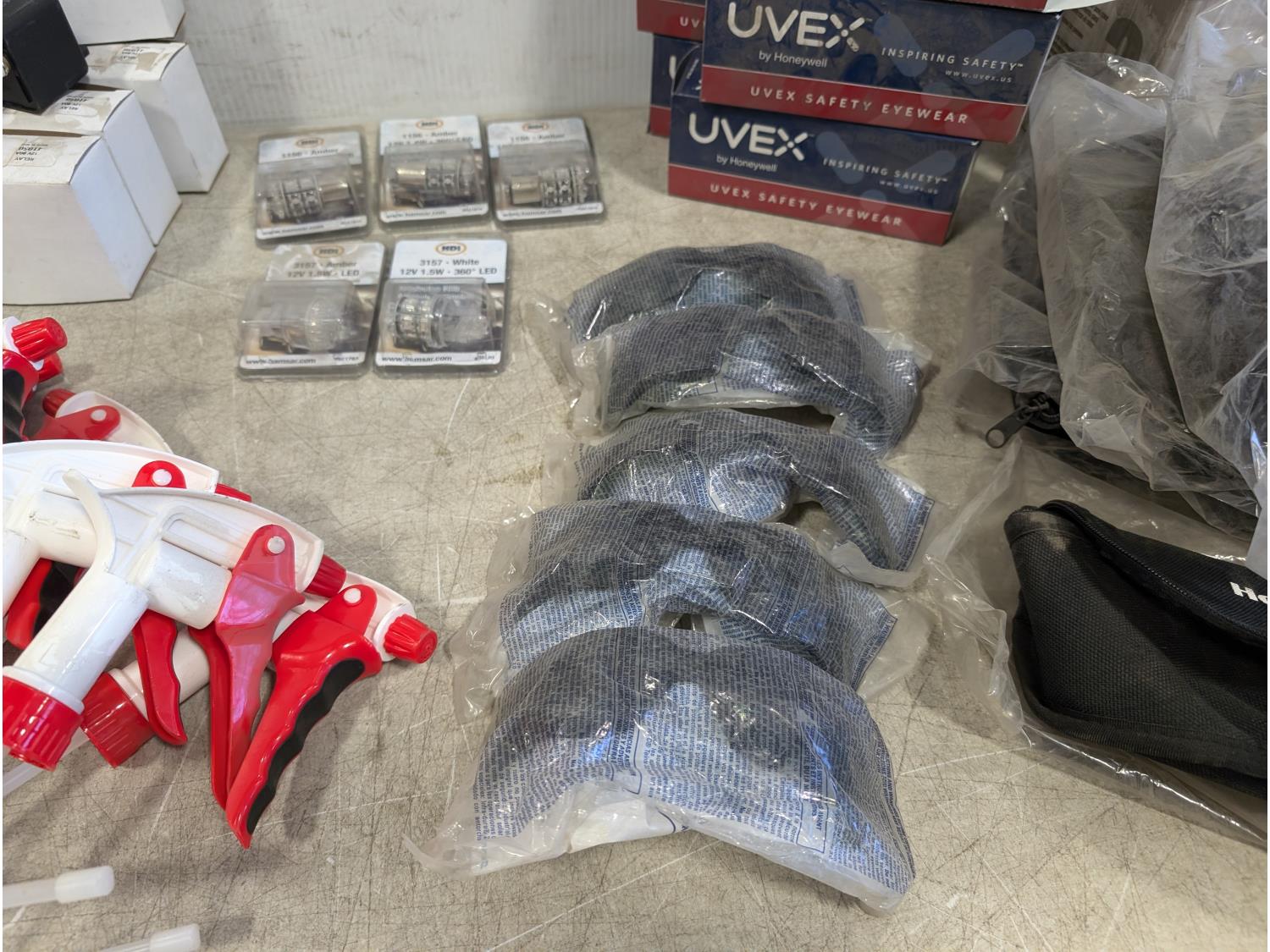 Scotch-Brite roll, (6) UVEX safety glasses, (6) Honeywell glasses pouches, (5) replacement lenses, (3) safety goggles, (50) 320 grit hook and loop 6 inch sanding pads, qty of 3 M rubber sanding blocks