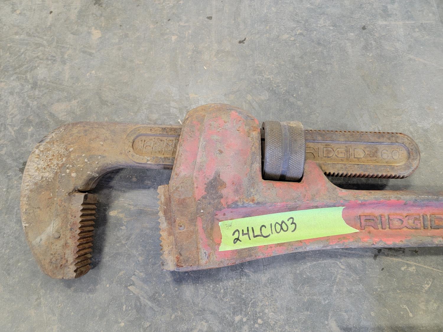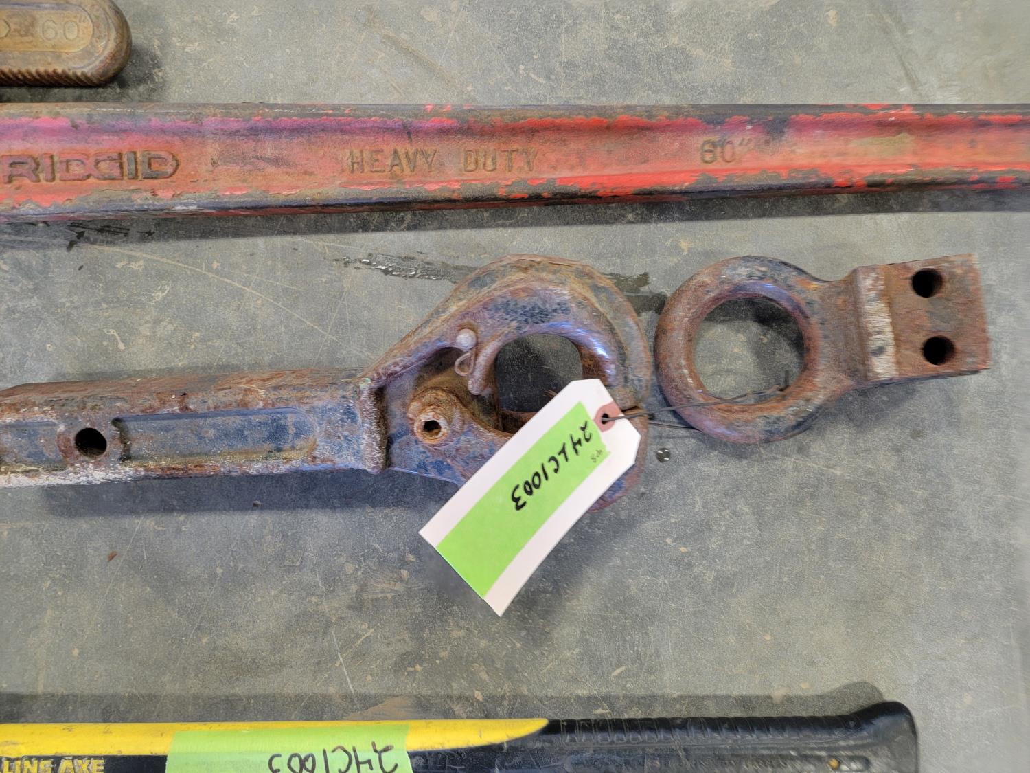 (2) trailer hitches, 60 inch Ridgid pipe wrench, sledge hammer